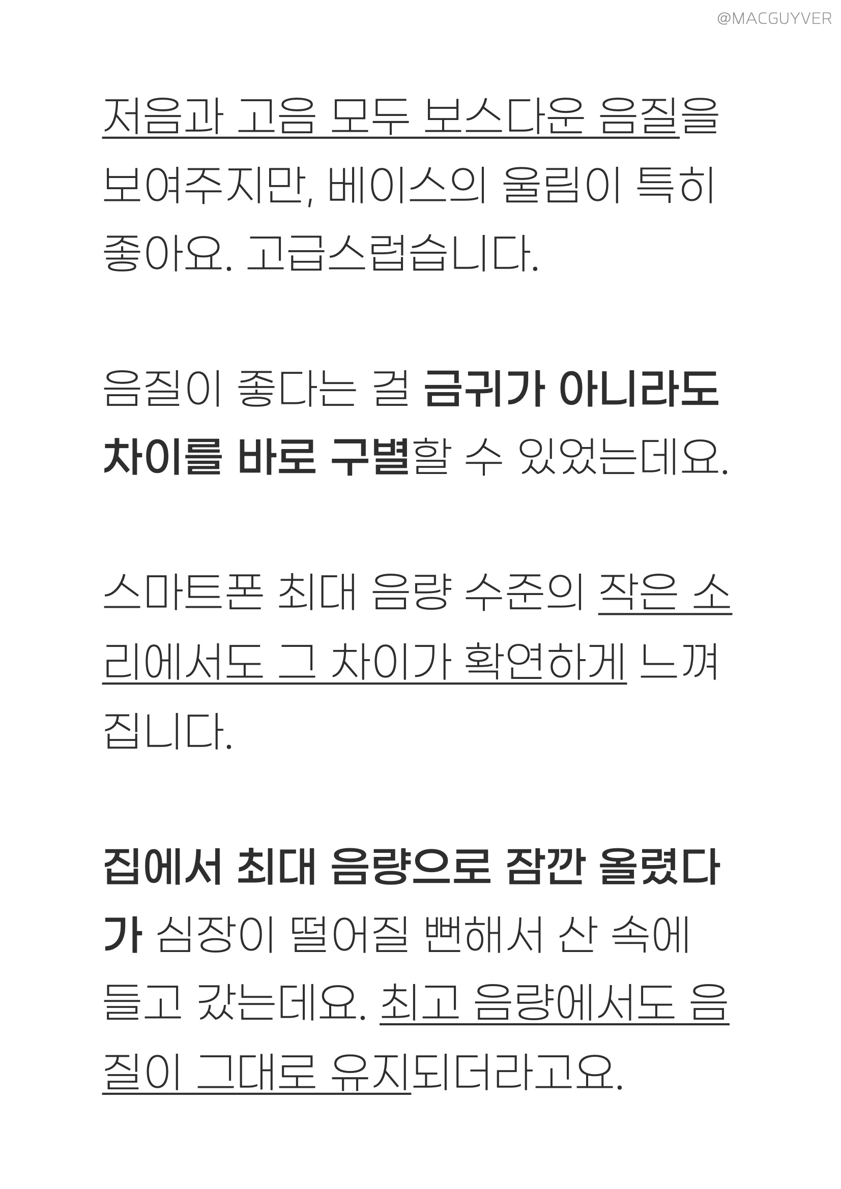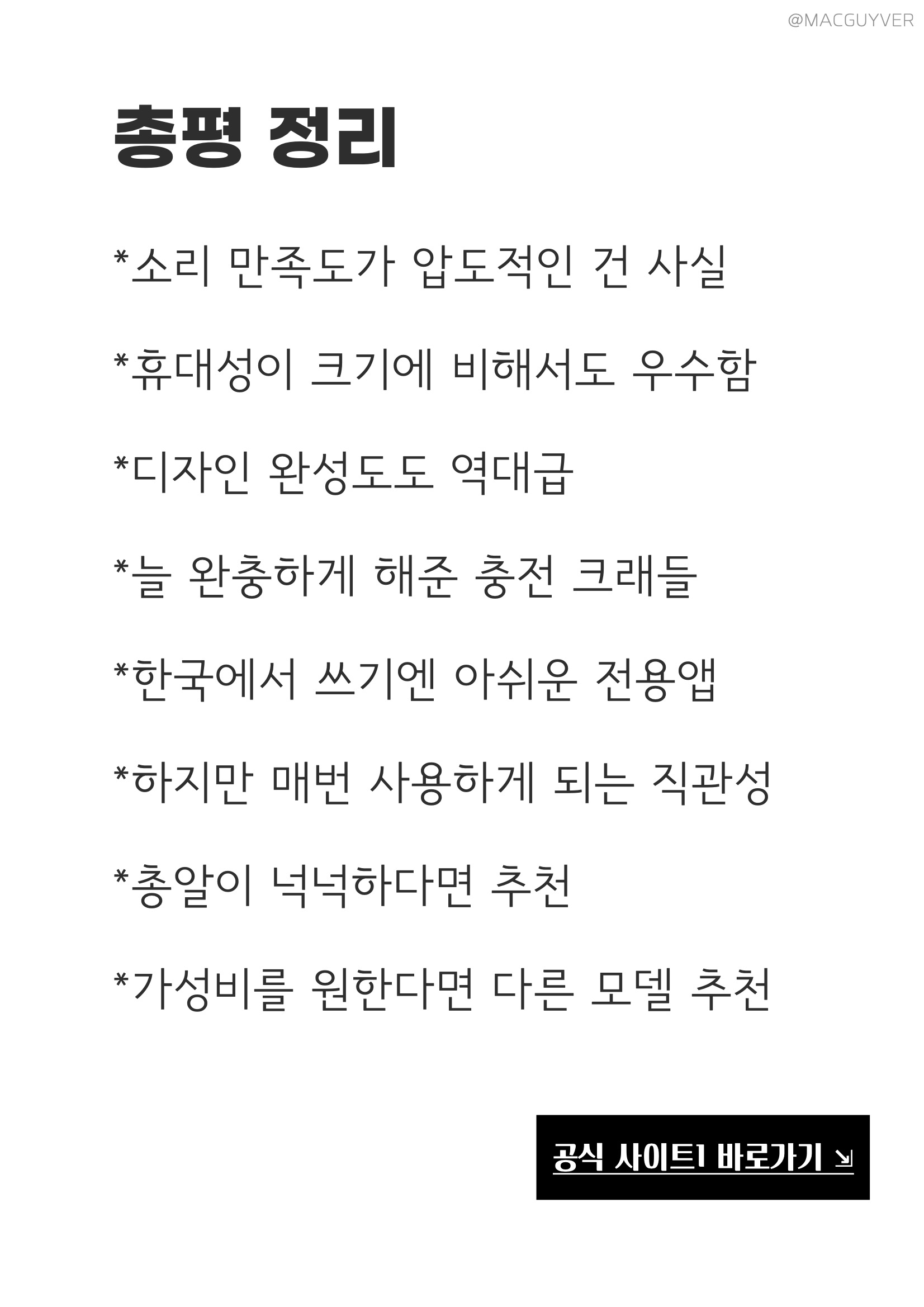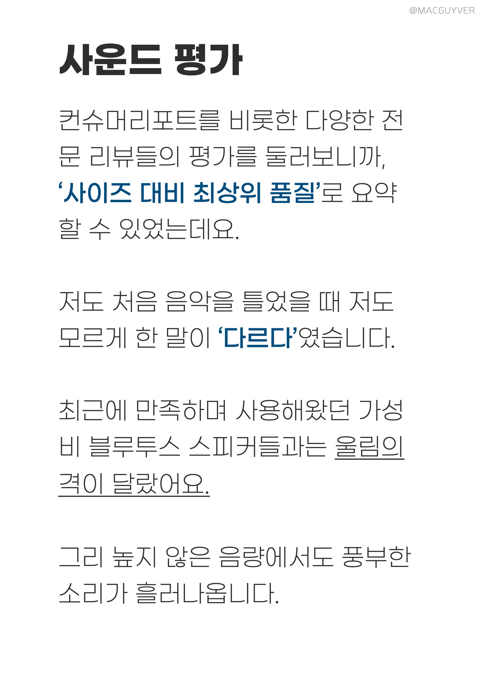 스피커추천 Bose Portable Home Speaker 사운드 평가 컨슈머리포트를 비롯한 다양한 전문 리뷰들의 평가를 둘러보니까, ‘사이즈 대비 최상위 품질’로 요약할 수 있었는데요. 저도 처음 음악을 틀었을 때 저도 모르게 한 말이 ‘다르다’였습니다. 최근에 만족하며 사용해왔던 가성비 블루투스 스피커들과는 울림의 격이 달랐어요. 블루투스스피커 그리 높지 않은 음량에서도 풍부한 소리가 흘러나옵니다. 저음과 고음 모두 보스다운 음질을 보여주지만, 베이스의 울림이 특히 좋아요. 고급스럽습니다. 음질이 좋다는 걸 금귀가 아니라도 차이를 바로 구별할 수 있었는데요. 스마트폰 최대 음량 수준의 작은 소리에서도 Bose의 차이가 확연하게 느껴집니다. 집에서 보스 포터블 홈스피커 를 최대 음량으로 잠깐 올렸다가 심장이 떨어질 뻔해서 산 속에 들고 갔는데요. 최고 음량에서도 음질이 그대로 유지되더라고요. Bose 실내 추천 음량 : 30-40% 40%면 스마트폰 최대 음량보다 조금 더 커요. 이 이상은 집에서 사용하기엔 눈치가 보이죠.