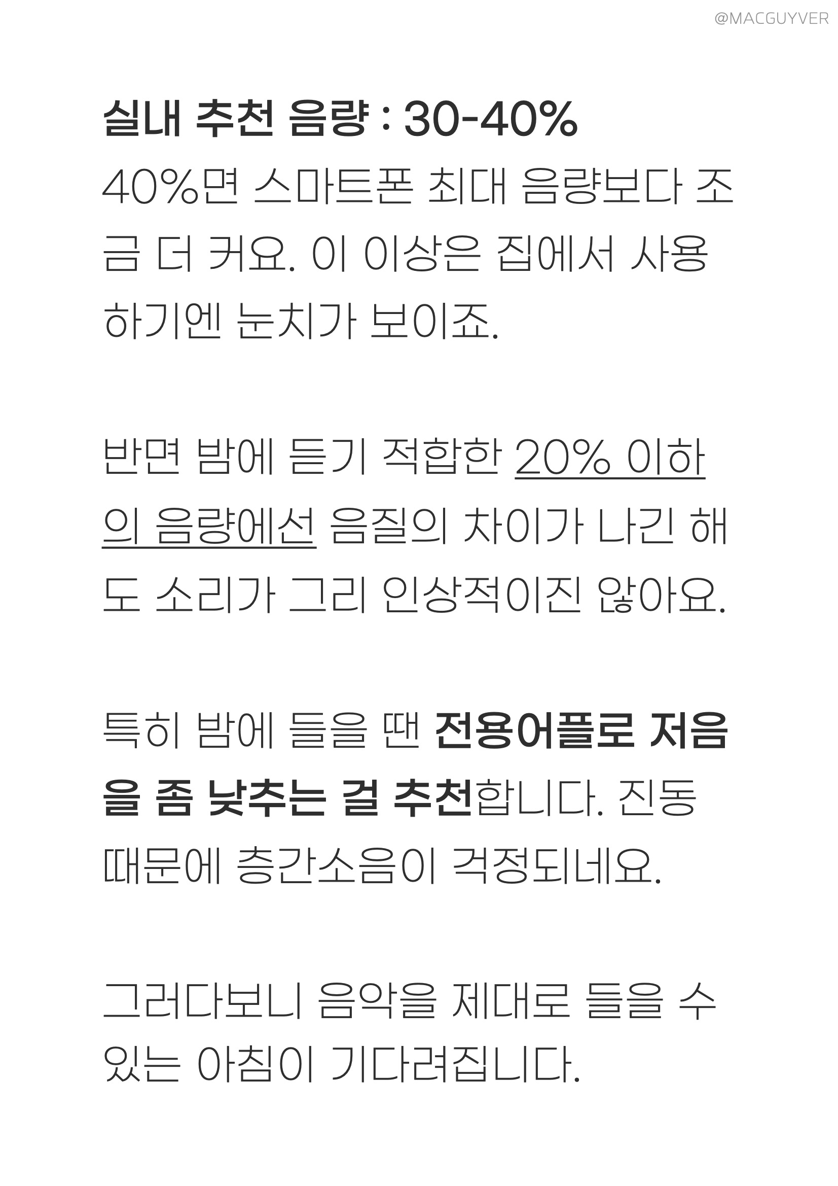 반면 밤에 듣기 적합한 20% 이하의 음량에선 음질의 차이가 나긴 해도 소리가 그리 인상적이진 않아요. 특히 밤에 보스 포터블 홈스피커를 들을 땐 전용어플로 저음을 좀 낮추는 걸 추천합니다. 포터블 홈스피커 진동 때문에 층간소음이 걱정되네요. 그러다보니 음악을 제대로 들을 수 있는 아침이 기다려집니다. 블루투스스피커 스테레오 성능은 없다고 봐도 무방하지만, 영화를 볼 때 공간감은 웬만한 사운드바 못지 않았어요. 완전한 360도 디자인이라서, 거실 가운데 놓아두면 소리가 넓게까지 퍼지고, 벽에 붙여서 사용하면 반사되면서 더 큰 소리를 냅니다. 포터블 홈스피커 크기 대비 음질은 넘사벽이지만, 가격 대비 음질이 뛰어난가 묻는다면, 그렇지는 않다고 대답할 겁니다. 보스 포터블 홈 스피커(Bose Portable Home Speaker)는 음질만 집중한 제품이 아니거든요.