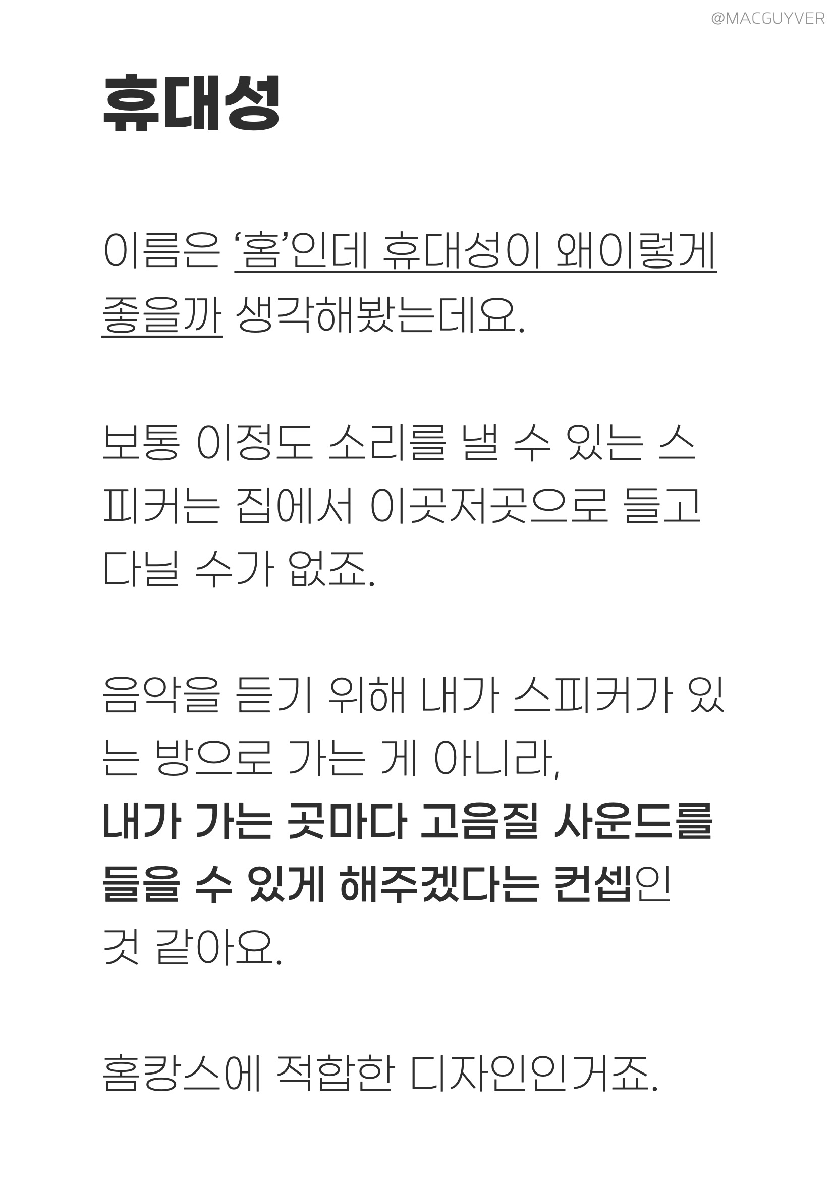 반면 밤에 듣기 적합한 20% 이하의 음량에선 음질의 차이가 나긴 해도 소리가 그리 인상적이진 않아요. 특히 밤에 보스 포터블 홈스피커를 들을 땐 전용어플로 저음을 좀 낮추는 걸 추천합니다. 포터블 홈스피커 진동 때문에 층간소음이 걱정되네요. 그러다보니 음악을 제대로 들을 수 있는 아침이 기다려집니다. 블루투스스피커 스테레오 성능은 없다고 봐도 무방하지만, 영화를 볼 때 공간감은 웬만한 사운드바 못지 않았어요. 완전한 360도 디자인이라서, 거실 가운데 놓아두면 소리가 넓게까지 퍼지고, 벽에 붙여서 사용하면 반사되면서 더 큰 소리를 냅니다. 포터블 홈스피커 크기 대비 음질은 넘사벽이지만, 가격 대비 음질이 뛰어난가 묻는다면, 그렇지는 않다고 대답할 겁니다. 보스 포터블 홈 스피커(Bose Portable Home Speaker)는 음질만 집중한 제품이 아니거든요.
