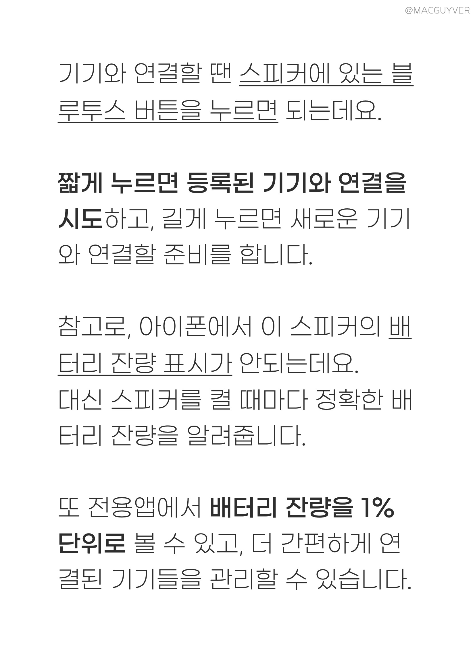스피커추천 배터리타임 스펙상 최대 12시간인데요. 100% -> 88% : 4시간반 소요 100% -> 65% : 약 7시간 소요 30-40% 출력으로 집에서 사용한다면 더 오래도 사용할 수 있어요. 30분 충전 : 17% 충전 2시간 충전 : 70% 충전 C타입 충전과 전용 충전 크래들은 거의 비슷한 충전 속도를 보여줍니다. 보스 포터블 홈스피커 충전 실험을 할 때도 저도 모르게 충전 크래들에 올려두는 바람에 수없이 다시 측정했습니다. 충전이라는 과정이 사라지는 느낌. 늘 완충상태로 사용할 수 있었어요. 페어링 스펙에선 블루투스 4.2 버전을 사용했다고 해서 처음엔 걱정했는데, 8M 거리에 벽 세개를 넘고도 연결이 안정적으로 유지되었습니다. 차에 폰을 둔 채 문을 닫고, 포터블 홈스피커를 들고 25m 이상 멀어져도 연결이 안정적이었어요. 기기와 연결할 땐 보스 포터블 홈스피커에 있는 블루투스 버튼을 누르면 되는데요. 짧게 누르면 등록된 기기와 연결을 시도하고, 길게 누르면 새로운 기기와 연결할 준비를 합니다. 블루투스 스피커 추천: 참고로, 아이폰에서 이 스피커의 배터리 잔량 표시가 안되는데요. 대신 Bose Portable Home Speaker 스피커를 켤 때마다 정확한 배터리 잔량을 알려줍니다. 또 전용앱에서 배터리 잔량을 1% 단위로 볼 수 있고, 더 간편하게 연결된 기기들을 관리할 수 있습니다.