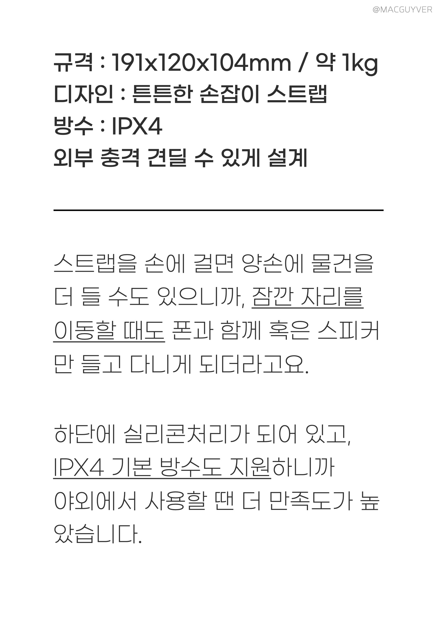 Bose 사운드 스펙_ :: 고효율, 고출력 트랜스듀서가 아래쪽 어쿠스틱 디플렉터로 향해 ‘360도 전 방향으로 균일하고 풍부한 사운드’ 실현 :: 오디오 성능을 최대로 발휘하도록 정교하게 제작된 이음새 없는 양극 산화 처리된 알루미늄 외관에 쌓여진 원통형 디자인 :: 블루투스스피커추천 세 개의 수동 라디에이터로 진동 표면적을 증가시켜 깊이 있는 베이스 전달 휴대성 이름은 ‘홈’인데 휴대성이 왜이렇게 좋을까 생각해봤는데요. 보통 이정도 소리를 낼 수 있는 스피커는 집에서 이곳저곳으로 들고 다닐 수가 없죠. 음악을 듣기 위해 내가 스피커가 있는 방으로 가는 게 아니라, 내가 가는 곳마다 고음질 사운드를 들을 수 있게 해주겠다는 컨셉인 것 같아요. Bose Portable Home Speaker 홈캉스에 적합한 디자인인거죠. 보스 포터블 홈스피커 규격 : 191x120x104mm / Bose 약 1kg 디자인 : 튼튼한 손잡이 스트랩 방수 : IPX4 외부 충격 견딜 수 있게 설계 스트랩을 손에 걸면 양손에 물건을 더 들 수도 있으니까, 잠깐 자리를 이동할 때도 폰과 함께 혹은 포터블 홈스피커만 들고 다니게 되더라고요. 보스 포터블 홈스피커 하단에 실리콘처리가 되어 있고, IPX4 기본 방수도 지원하니까 야외에서 사용할 땐 더 만족도가 높았습니다.