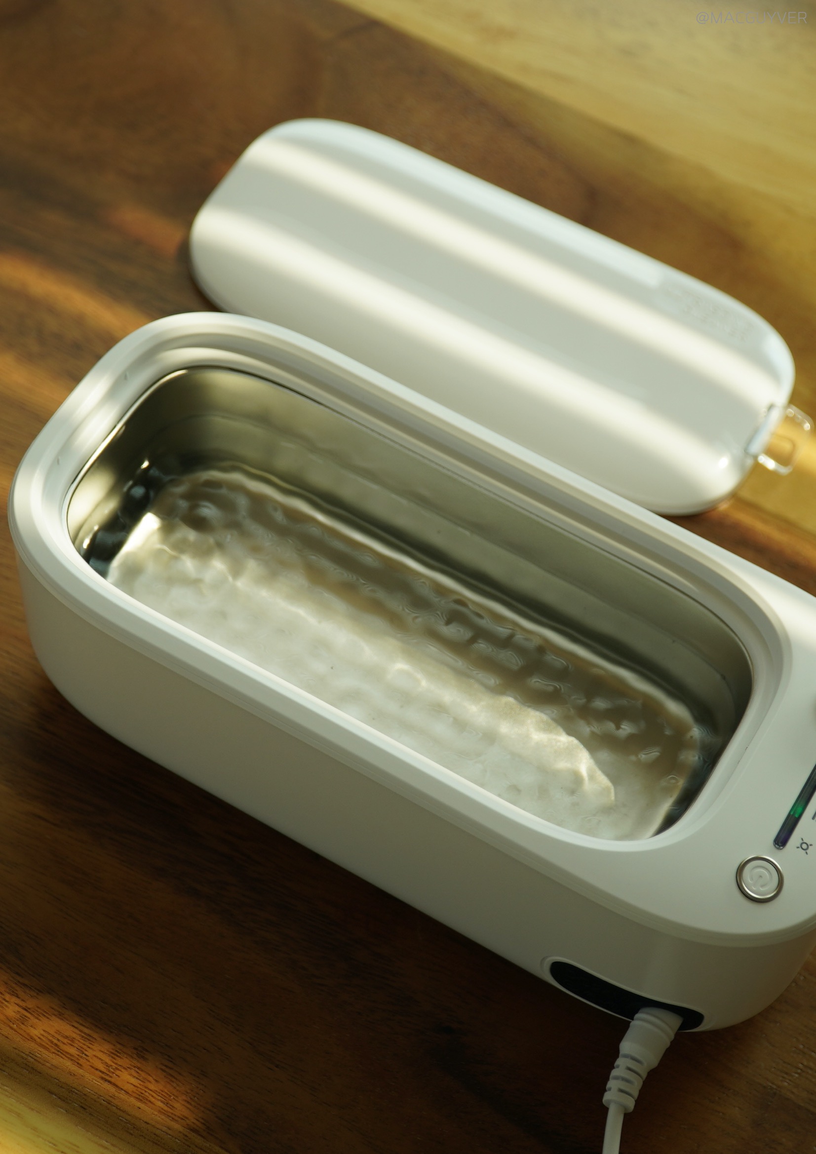 #.UV 살균기 디자인과 마감 디테일하게 디자인을 보자면, 일반 세척기처럼 너무 기능적이거나 투박하지 않고 감성적이면서 따뜻합니다. 욕조 같다는 느낌이 가장 먼저 드실 것 같은데요. 수조가 커졌다고 하지만 실제로 보기에는 엄청 큼지막한 느낌은 아닙니다. 최대 7cm x 16cm 정도의 제품을 넣을 수 있으니까 크기와 부피도 체크해보세요. 실제로 물을 담아보면 400ml 용량이지만 350ml 정도만 채워야 제품을 넣어도 물이 넘치지 않더라고요. 전체적으로 살균 초음파 세척기 생활방수 기능에 분리형 어댑터, 고무 패킹 처리까지 잘 되어서 물을 비울 때도 걱정이 없었는데요. 풀셋 초음파 세척기 하단부는 미끄럼 방지 처리가 잘 되어서 어디에 놓아도 안정적인 데다, 어댑터도 흰색이라 깔맞춤이 되니까 깨끗한 사용이 가능했습니다.