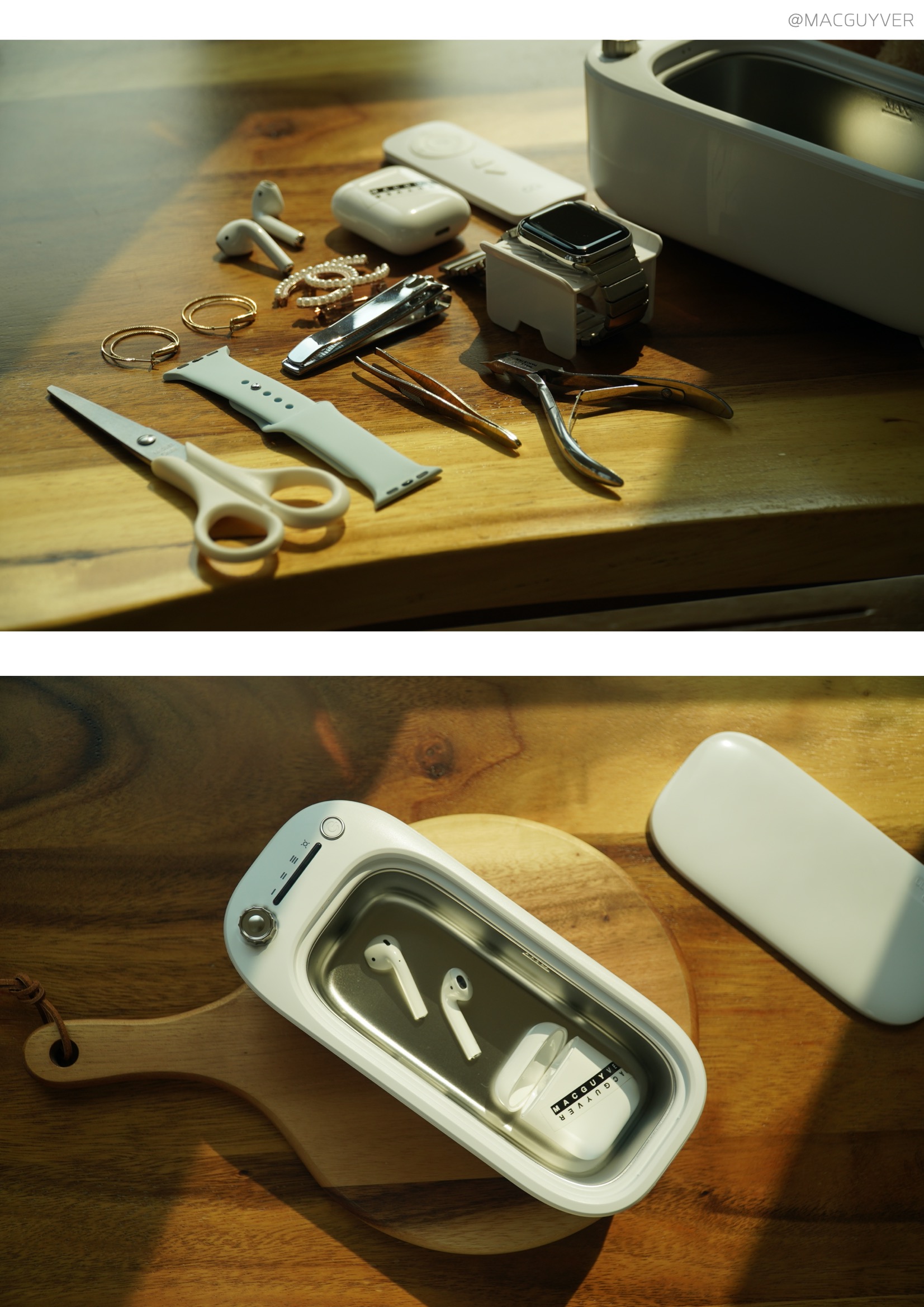 애플워치가 50m 방수를 지원한다고 하지만 습식 세척은 엄청난 진동으로 틈 사이로 물이 들어갈 수 있으니까 전자기기는 건식만 활용해보세요. 풀셋 초음파 세척기 건식의 경우는 소리 없이 UV 만으로 세척을 해주는데, 이 경우에도 살균 능력이 99.9%라고 하니까 걱정하지 말고 건식만 해줘도 충분합니다. 풀셋 살균 초음파 세척기 여담이지만, 통 안에 가능한 많은 도구들을 한 번에 넣어서 작동하는 것도 추천하지 않습니다. 살균 초음파 세척기 겹치는 부분에는 제대로 살균이 안될 수 있거든요. 전체적인 소감이라면 기능성이 뛰어나면서도 디자인이 인테리어 효과도 낼 수 있을 정도로 잘 다듬어져 있었어요. 발열은 거의 없었고, 어댑터도 연결이 간단해서 편하더라고요. 물론, 마이크로 5핀과 같이 범용성 높은 단자가 아닌 점은 아쉽기도 합니다. 오늘 소개해드린 UV 살균기, 풀셋 살균 초음파 세척기는 다용도로 활용이 가능한데다, 습식에 더해서 건식까지 지원하니까 사용 가능한 제품이 무궁무진하더라고요. 코로나로 걱정이 많은 분들이나, 전자기기를 제대로 관리하고 싶은 분들, 에어팟 소독, 마스크부터 미용 및 일상 용품까지 다양하게 살균 소독하고 싶은 분들이라면 풀셋 초음파 세척기를 알아보시는 것도 추천합니다.