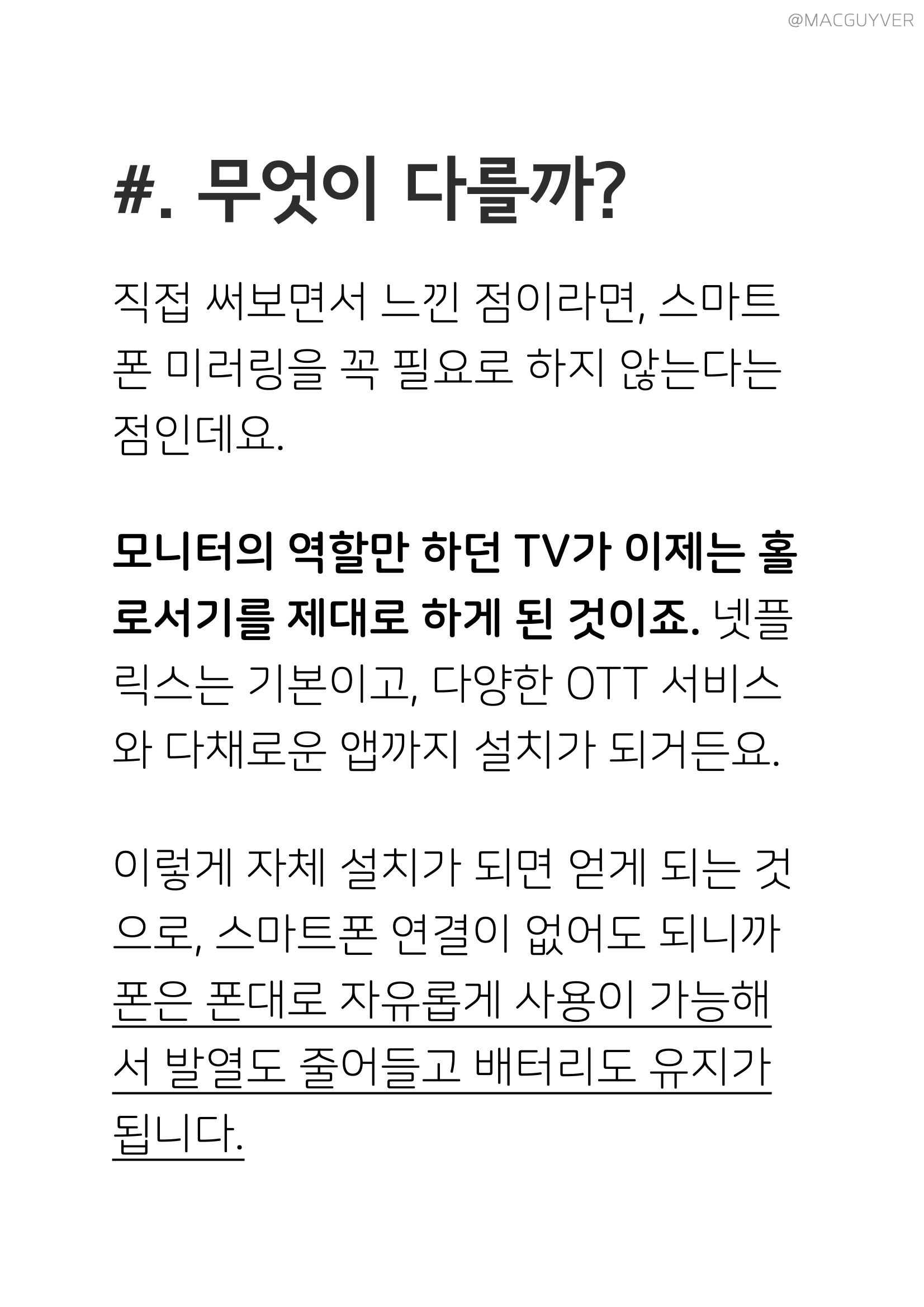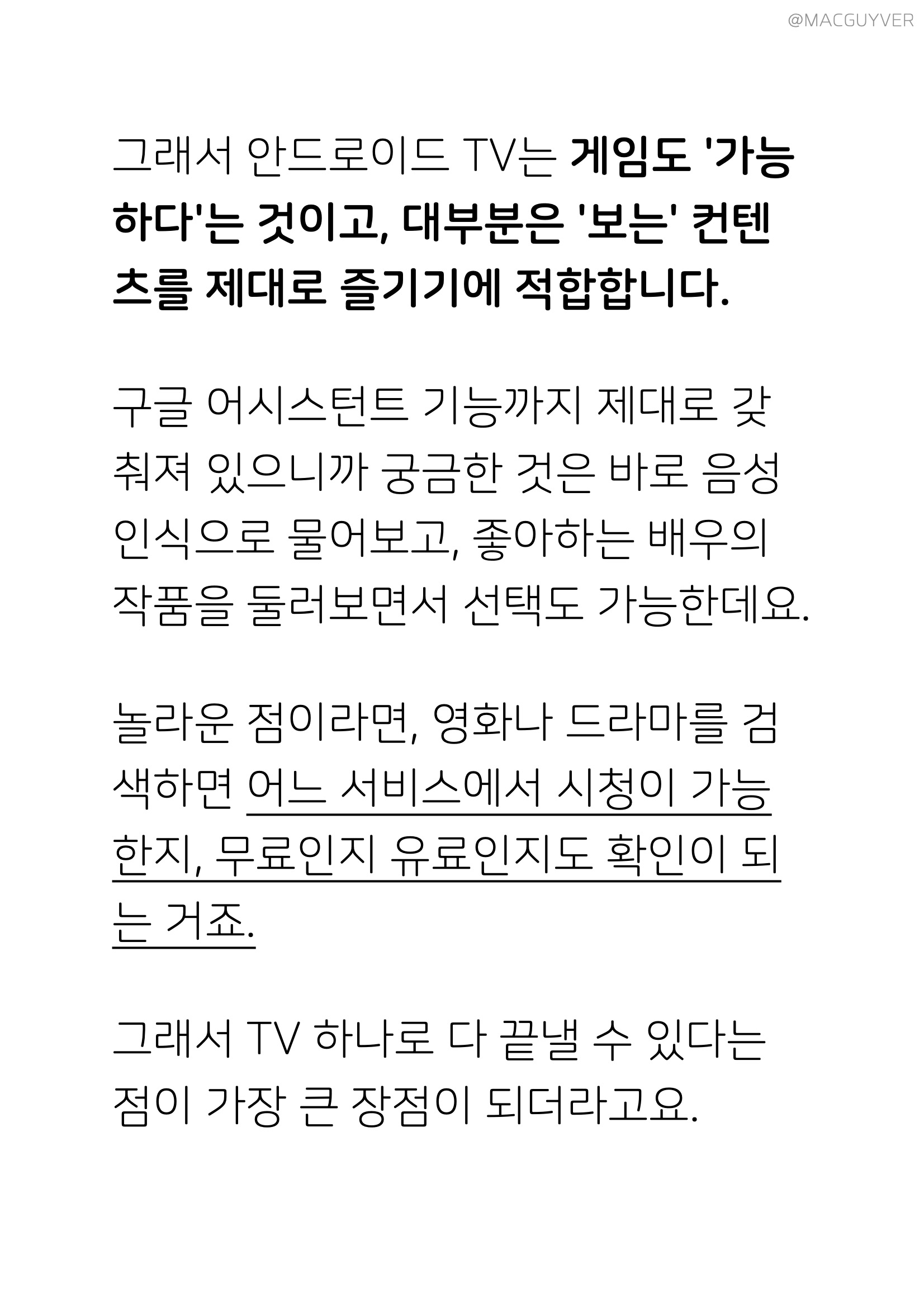 #. 안드로이드 TV 무엇이 다를까? 직접 써보면서 느낀 점이라면, 스마트폰 미러링을 꼭 필요로 하지 않는다는 점인데요. 모니터의 역할만 하던 TV가 이제는 홀로서기를 제대로 하게 된 것이죠. 넷플릭스는 기본이고, 다양한 OTT 서비스와 다채로운 앱까지 설치가 되거든요. 이렇게 자체 설치가 되면 얻게 되는 것으로, 스마트폰 연결이 없어도 되니까 폰은 폰대로 자유롭게 사용이 가능해서 발열도 줄어들고 배터리도 유지가 됩니다. 물론 아이리버 TV에 무한대 설치가 되는 것은 아닌데요. 4K TV 내장 스토리지가 4GB 정도인데 실사용 공간이 2.5GB 수준이라 마냥 설치하다 보면 공간이 부족합니다. 거기다 게임을 제대로 즐기려면 조이스틱이나 마우스도 꼭 필요하니까 미러링은 필요 없지만 주변기기는 필요하거든요. 그래서 안드로이드 TV는 게임도 '가능하다'는 것이고, 대부분은 '보는' 컨텐츠를 제대로 즐기기에 적합합니다. 안드로이드 TV 구글 어시스턴트 기능까지 제대로 갖춰져 있으니까 궁금한 것들을 바로 음성 인식으로 물어보고, 좋아하는 배우의 작품들을 둘러보면서 선택도 가능한데요. 안드로이드 TV 놀라운 점이라면, 영화나 드라마를 검색하면 어느 서비스에서 시청이 가능한지, 무료인지 유료인지도 확인이 되는 거죠. 그래서 UHD TV 아이리버 TV 하나로 다 끝낼 수 있다는 점이 가장 큰 장점이 되더라고요.
