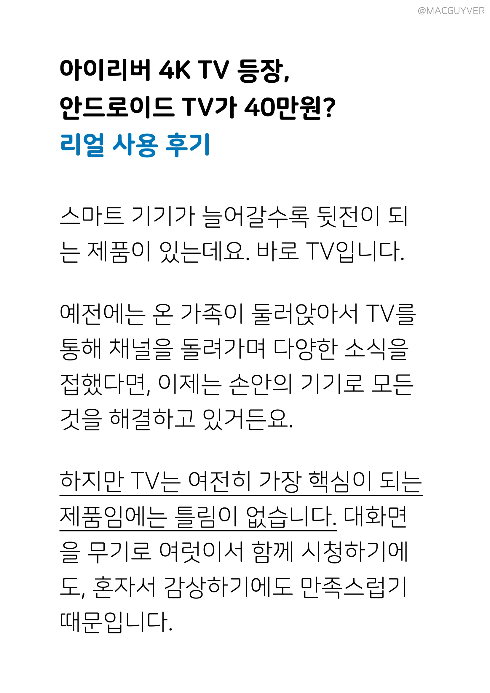 스마트 기기가 늘어갈수록 뒷전이 되는 제품이 있는데요. 바로 TV입니다. 예전에는 온 가족이 둘러앉아서 TV를 통해 채널을 돌려가며 다양한 소식을 접했다면, 이제는 손안의 기기로 모든 것을 해결하고 있거든요. 하지만 TV는 여전히 가장 핵심이 되는 제품임에는 틀림이 없습니다. 대화면을 무기로 여럿이서 함께 시청하기에도, 혼자서 감상하기에도 만족스럽기 때문입니다. 이러한 TV가 점점 더 뒤로 밀려나는 것 같다면, 40만원대 TV 안드로이드 TV는 어떨까요? 그것도 아이리버가 만든 안드로이드 4K TV인데요. 오늘은 가성비 TV 아이리버 안드로이드 4K UHD TV에 대한 소감을 여러분들에게 소개해드릴 예정입니다.