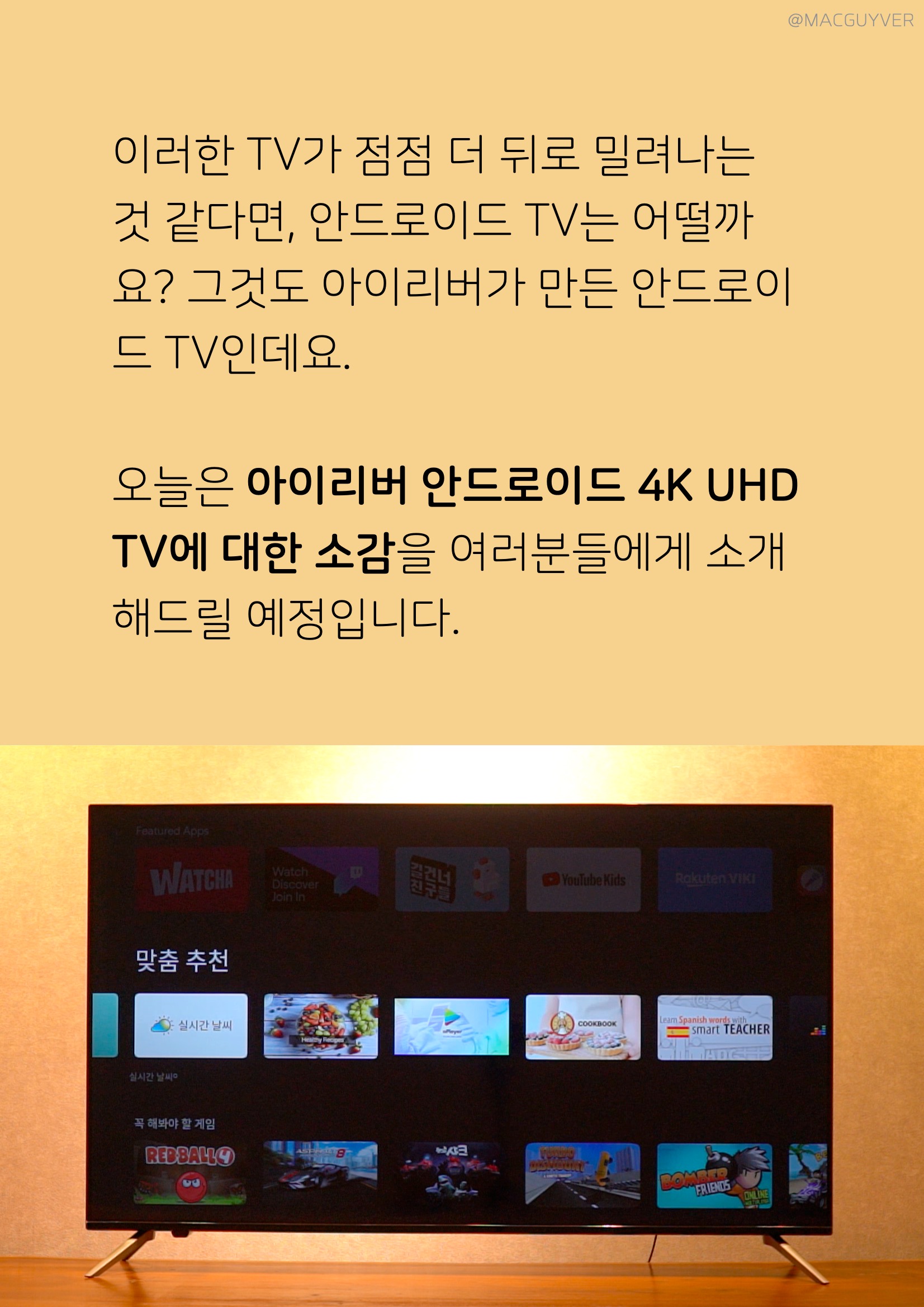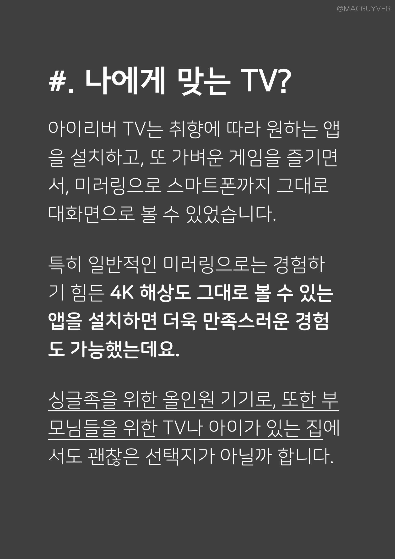 #. 나에게 맞는 TV? 아이리버 TV는 취향에 따라 원하는 앱을 설치하고, 또 가벼운 게임을 즐기면서, 미러링으로 스마트폰까지 그대로 대화면으로 볼 수 있었습니다. 아이리버 TV 특히 일반적인 미러링으로는 경험하기 힘든 4K 해상도 그대로 볼 수 있는 앱을 설치하면 더욱 만족스러운 경험도 가능했는데요. 싱글족을 위한 올인원 기기로, 또한 부모님들을 위한 TV나 아이가 있는 집에서도 괜찮은 선택지가 아닐까 합니다.