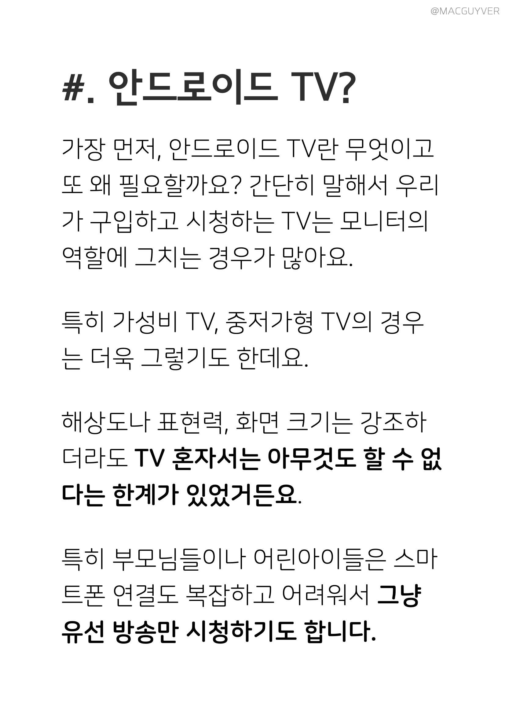 #. 안드로이드 TV? 가장 먼저, 안드로이드 TV란 무엇이고 또 왜 필요할까요? 간단히 말해서 우리가 구입하고 시청하는 TV는 모니터의 역할에 그치는 경우가 많아요. 특히 프리미엄 TV가 아닌 가성비 TV, 40만원대 TV, 중저가형 TV, 중소기업 TV의 경우는 더욱 그렇기도 한데요. 해상도나 표현력, 화면 크기는 강조하더라도 아이리버 TV 혼자서는 아무것도 할 수 없다는 한계가 있었거든요. 특히 부모님들이나 어린아이들은 스마트폰 연결도 복잡하고 어려워서 그냥 유선 방송만 시청하기도 합니다. 하지만 아이리버 TV는 구글로부터 정식 인증을 받으면서, 무려 3,000개가 넘는 앱들을 설치하고 사용할 수 있어요. 이건 프리미엄 TV에서 지원하는 10~30개 정도의 한정적인 앱보다 40만원대 TV로 훨씬 다양하고 개인화된 환경을 만들 수 있다는 뜻이기도 한데요.