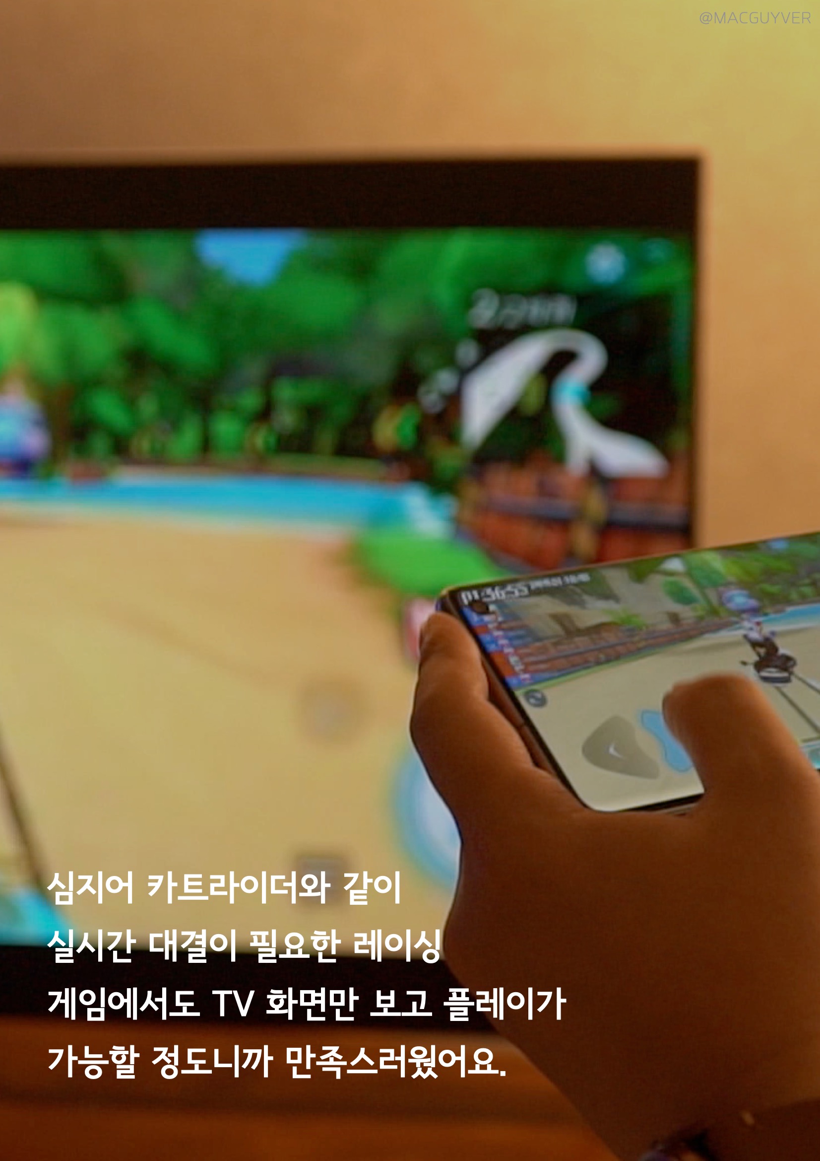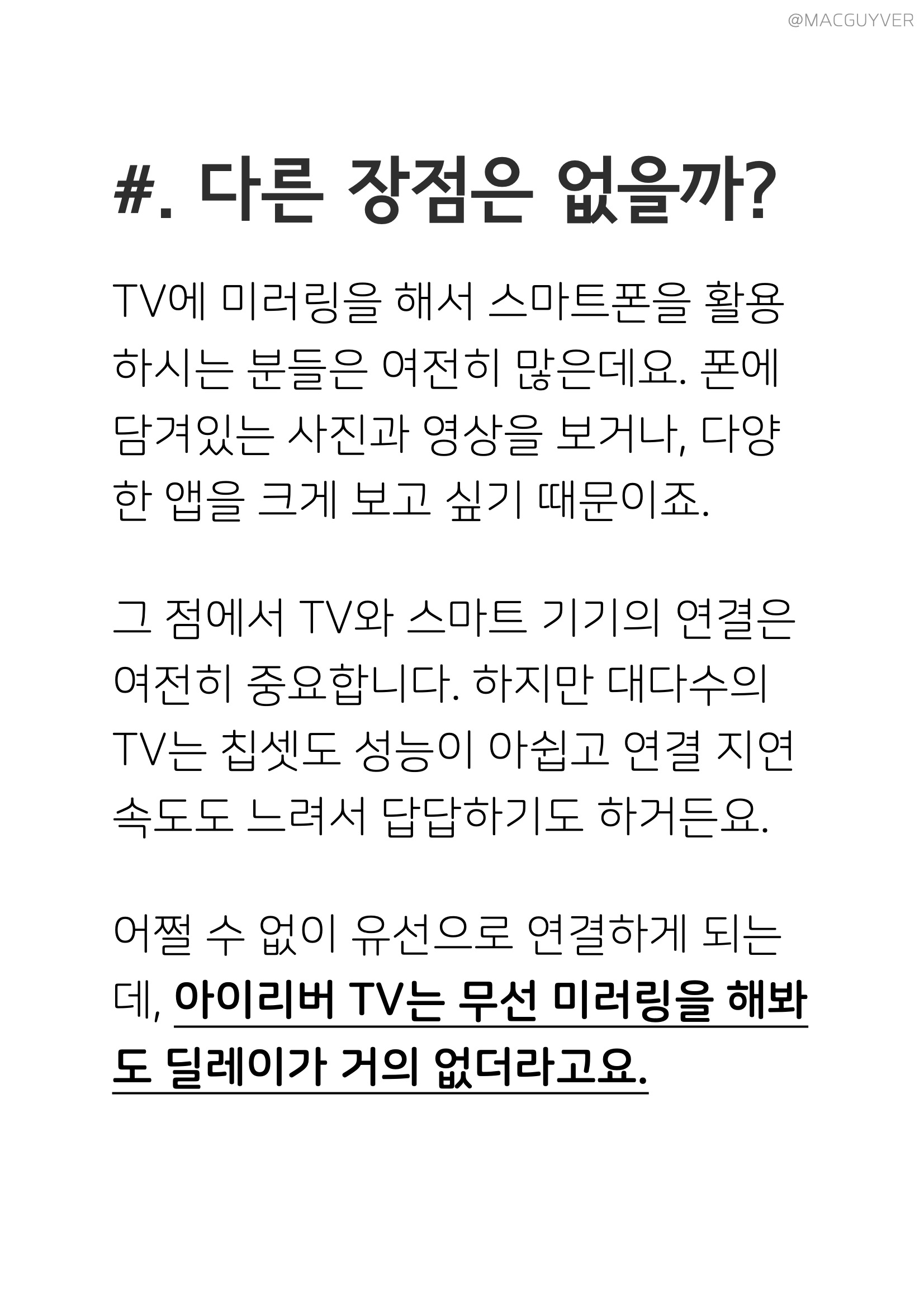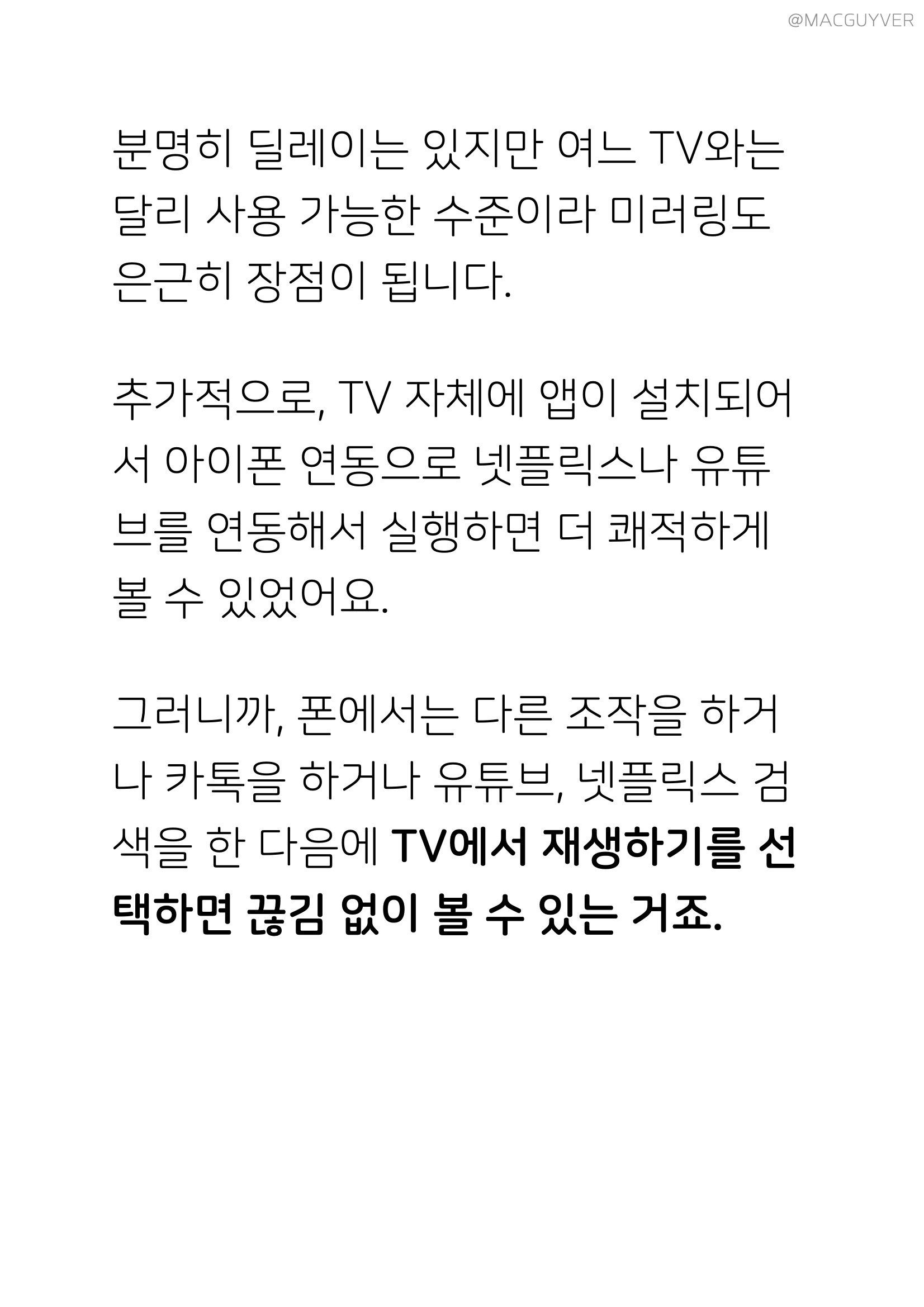 #. 다른 장점은 없을까? TV에 미러링을 해서 스마트폰을 활용하시는 분들은 여전히 많은데요. 폰에 담겨있는 사진과 영상을 보거나, 다양한 앱을 크게 보고 싶기 때문이죠. 그 점에서 TV와 스마트 기기의 연결은 여전히 중요합니다. 하지만 대다수의 TV는 칩셋도 성능이 아쉽고 연결 지연 속도도 느려서 답답하기도 하거든요. 어쩔 수 없이 유선으로 연결하게 되는데, 아이리버 TV는 무선 미러링을 해봐도 딜레이가 거의 없더라고요. 심지어 카트라이더와 같이 실시간 대결이 필요한 레이싱 게임에서도 UHD TV 화면만 보고 플레이가 가능할 정도니까 만족스러웠어요. 분명히 딜레이는 있지만 여느 TV와는 달리 사용 가능한 수준이라 미러링도 은근히 장점이 됩니다. 추가적으로, 아이리버 TV 자체에 앱이 설치되어서 아이폰 연동으로 넷플릭스나 유튜브를 연동해서 실행하면 더 쾌적하게 볼 수 있었어요. 그러니까, 폰에서는 다른 조작을 하거나 카톡을 하거나 유튜브, 넷플릭스 검색을 한 다음에 TV에서 재생하기를 선택하면 UHD 4K TV를 끊김 없이 볼 수 있는 거죠.