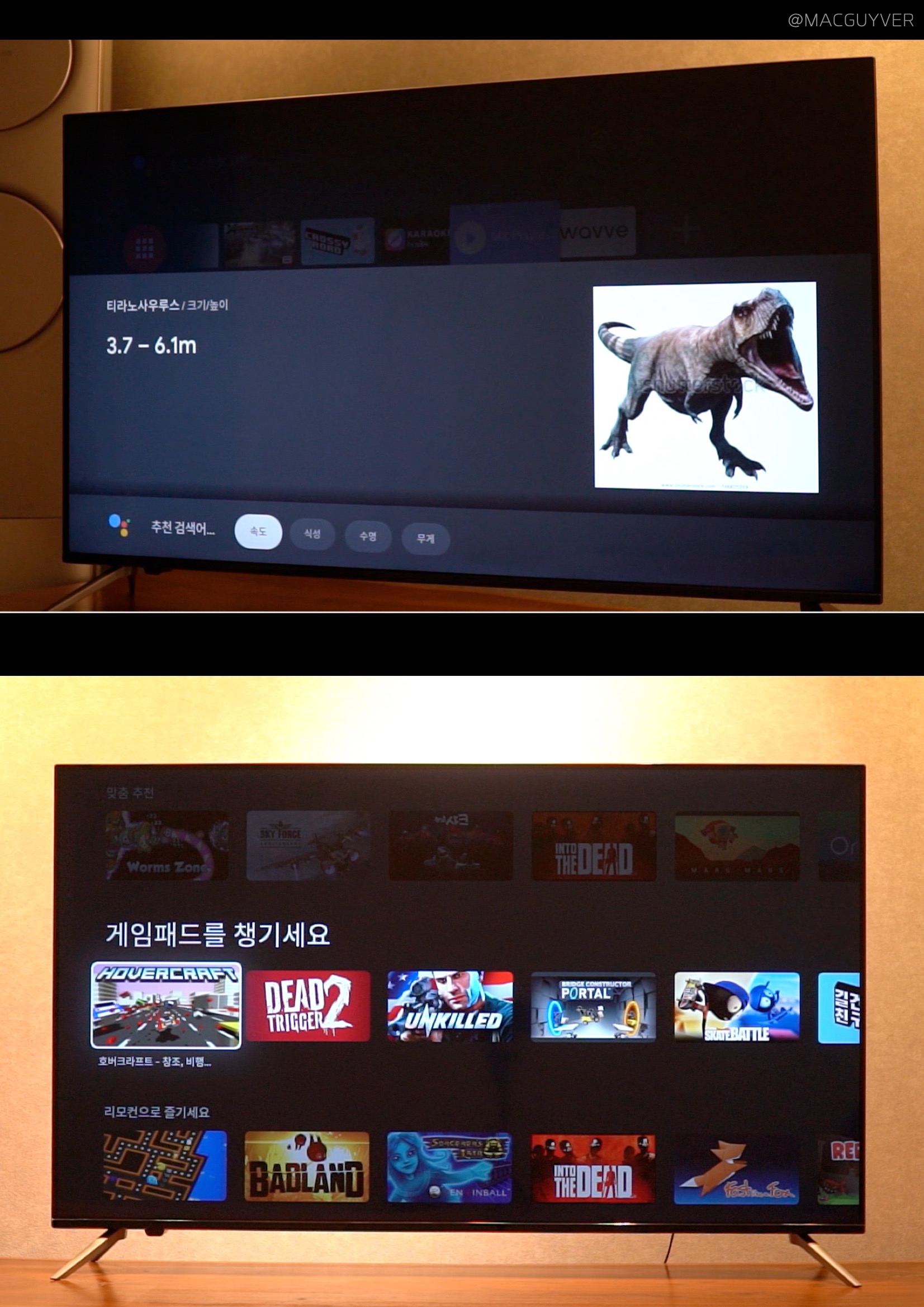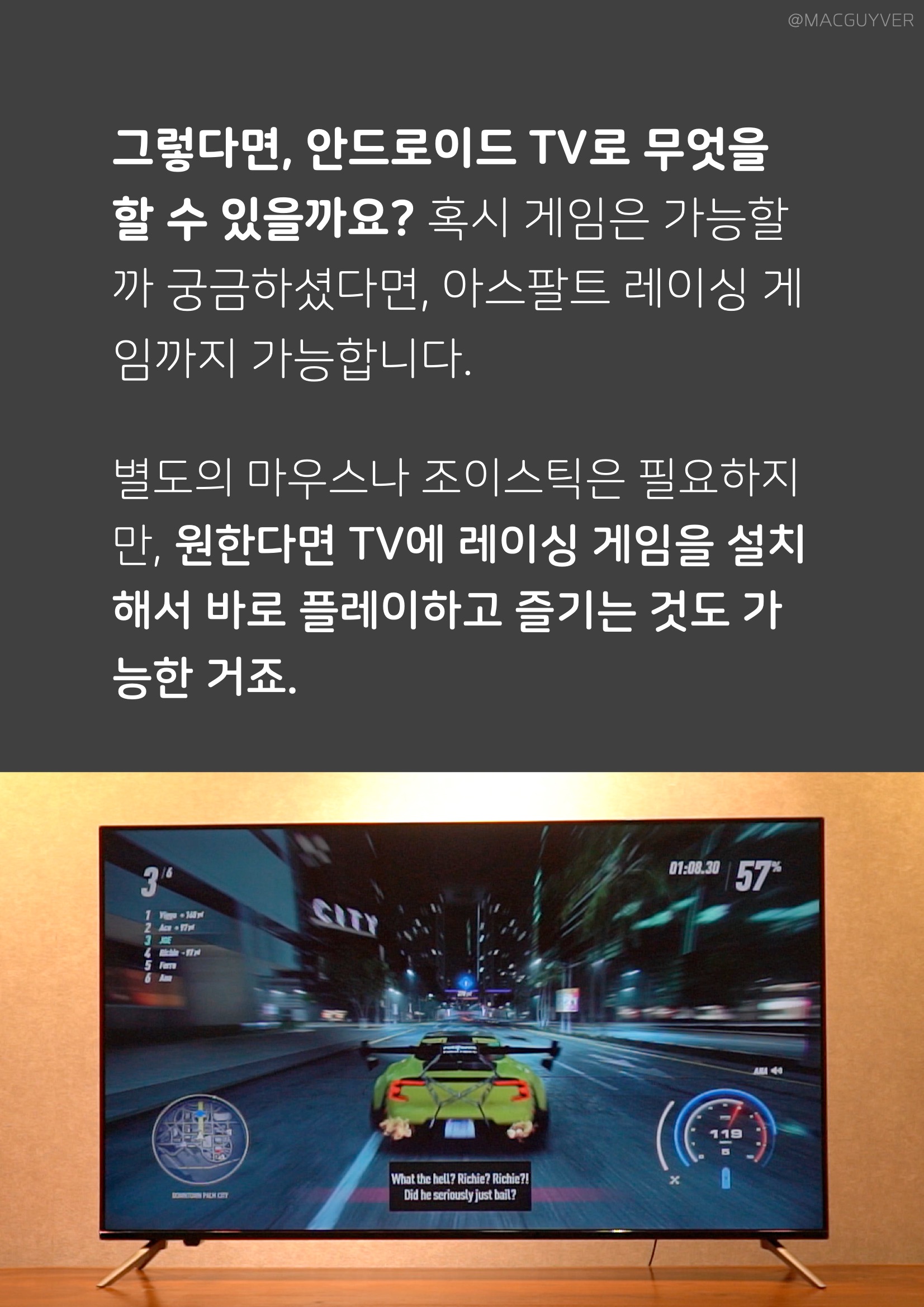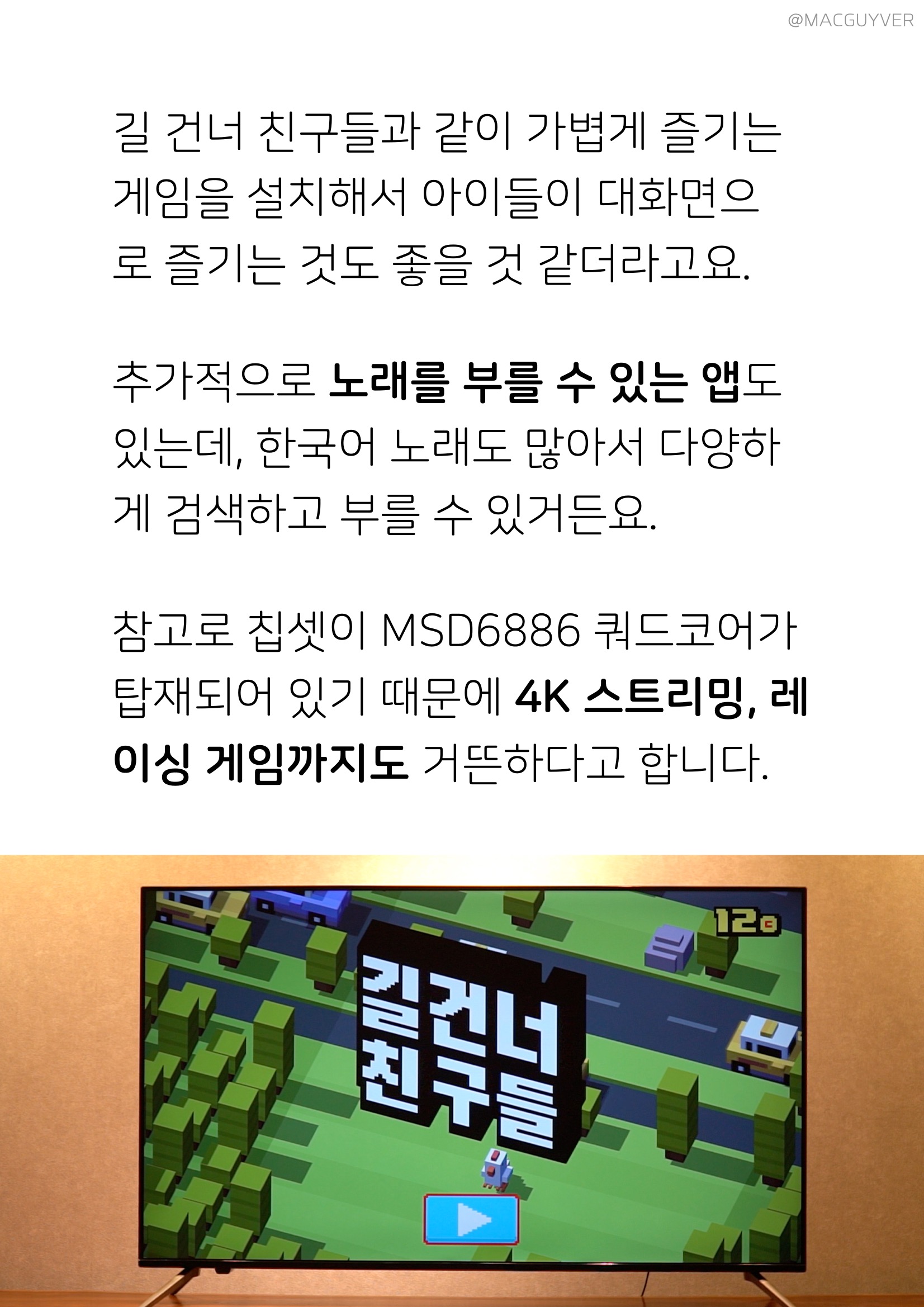 무엇보다 추가되는 앱까지 기대가 가능하다는 점에서 안드로이드 TV는 시간이 지날수록 업그레이드가 된다는 장점도 가지고 있거든요. 그렇다면, 40만원대 TV, 안드로이드 TV로 무엇을 할 수 있을까요? 혹시 게임은 가능할까 궁금하셨다면, 아스팔트 레이싱 게임까지 가능합니다. UHD TV 별도의 마우스나 조이스틱은 필요하지만, 원한다면 TV에 레이싱 게임을 설치해서 바로 플레이하고 즐기는 것도 가능한 거죠. 4K TV 개인적으로는 길 건너 친구들과 같이 가볍게 즐기는 게임을 설치해서 아이들이 대화면으로 즐기는 것도 좋을 것 같더라고요. 추가적으로 노래를 부를 수 있는 앱도 있는데, 한국어 노래도 많아서 다양하게 검색하고 부를 수 있거든요. 참고로 칩셋이 MSD6886 쿼드코어가 탑재되어 있기 때문에 아이리버 TV 4K 스트리밍이나 레이싱 게임까지 거뜬하다고 합니다.