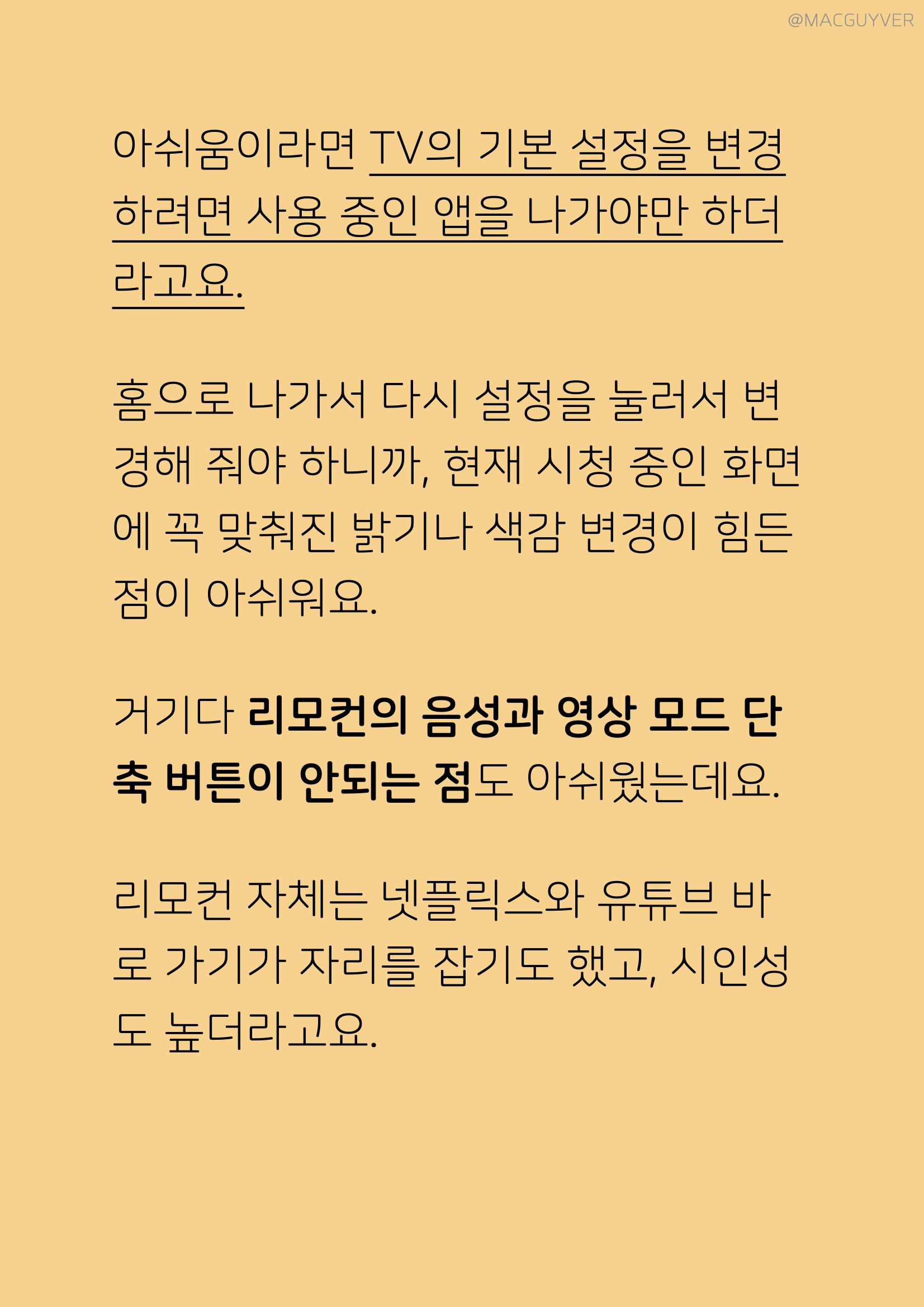 #. 중소기업 TV 기본기는 괜찮을까? 가장 중요한 화면 밝기를 측정해보니까 제법 준수하게 나왔어요. UHD TV 화면이 크다는 점과 함께 색 표현력도 뛰어나서 밤에는 에코 모드에 더해서 밝기를 더 줄일 필요가 있더라고요. 4K TV 낮에도 시청하는데 답답하지 않고 쨍한 느낌으로 볼 수 있었고, 4K 해상도까지 지원하니까 제대로 선명한 화면이라는 느낌도 들었는데요. 가성비 TV 어두운 부분이 뿌옇게 나오는 TV도 많지만 아이리버 TV는 블랙을 블랙으로 정확히 보여주니까 영화를 보기에도 좋은 거죠. 아쉬움이라면 TV의 기본 설정을 변경하려면 사용 중인 앱을 나가야만 하더라고요. 홈으로 나가서 다시 설정을 눌러서 변경해 줘야 하니까, 현재 시청 중인 화면에 꼭 맞춰진 밝기나 색감 변경이 힘든 점이 아쉬워요. 거기다 리모컨에 있는 음성과 영상 모드 단축 버튼이 안되는 점도 아쉬웠는데요. 아이리버 TV 리모컨 자체는 넷플릭스와 유튜브 바로 가기가 자리를 잡기도 했고, 시인성도 높더라고요.