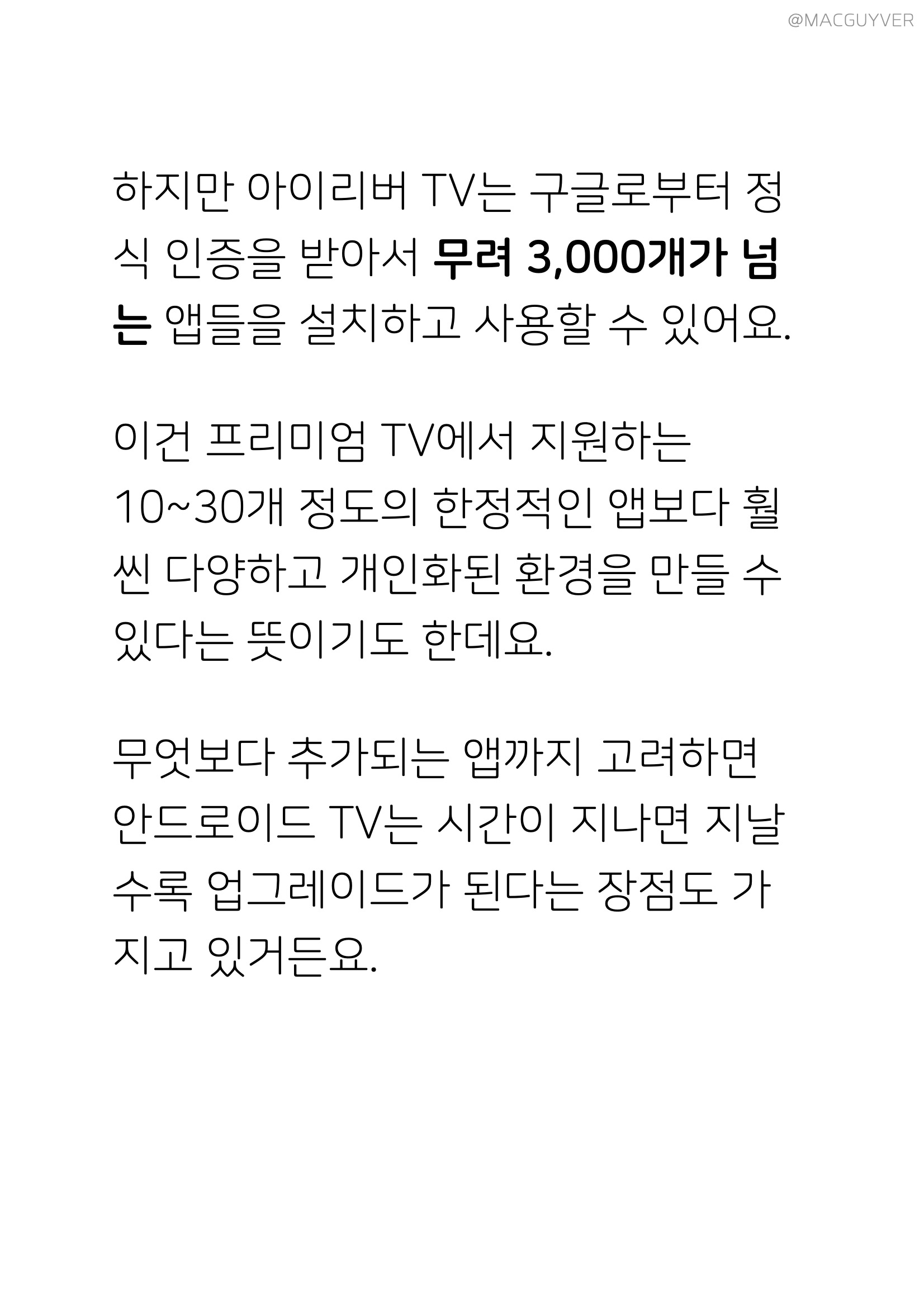 #. 안드로이드 TV? 가장 먼저, 안드로이드 TV란 무엇이고 또 왜 필요할까요? 간단히 말해서 우리가 구입하고 시청하는 TV는 모니터의 역할에 그치는 경우가 많아요. 특히 프리미엄 TV가 아닌 가성비 TV, 40만원대 TV, 중저가형 TV, 중소기업 TV의 경우는 더욱 그렇기도 한데요. 해상도나 표현력, 화면 크기는 강조하더라도 아이리버 TV 혼자서는 아무것도 할 수 없다는 한계가 있었거든요. 특히 부모님들이나 어린아이들은 스마트폰 연결도 복잡하고 어려워서 그냥 유선 방송만 시청하기도 합니다. 하지만 아이리버 TV는 구글로부터 정식 인증을 받으면서, 무려 3,000개가 넘는 앱들을 설치하고 사용할 수 있어요. 이건 프리미엄 TV에서 지원하는 10~30개 정도의 한정적인 앱보다 40만원대 TV로 훨씬 다양하고 개인화된 환경을 만들 수 있다는 뜻이기도 한데요.
