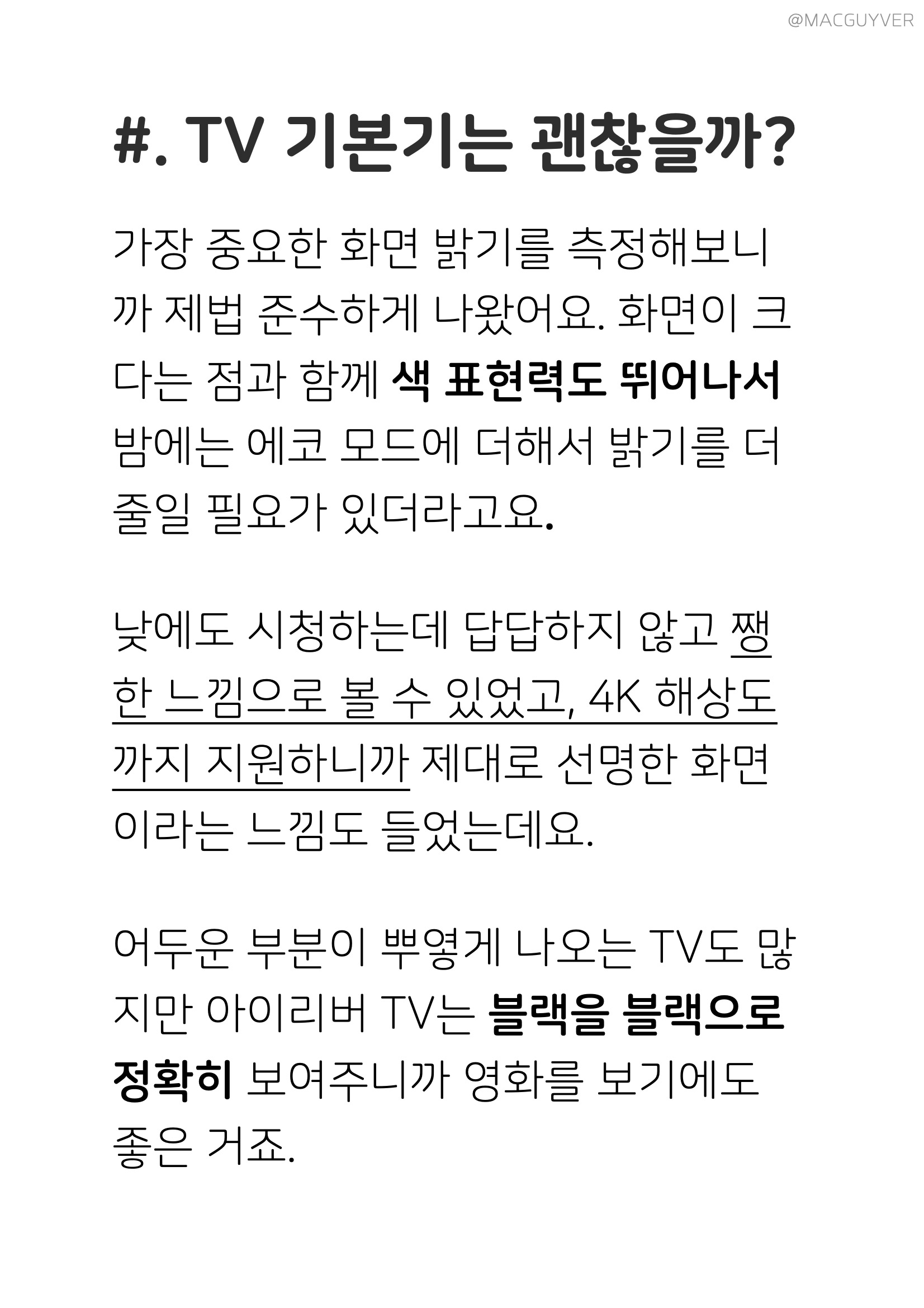 #. 중소기업 TV 기본기는 괜찮을까? 가장 중요한 화면 밝기를 측정해보니까 제법 준수하게 나왔어요. UHD TV 화면이 크다는 점과 함께 색 표현력도 뛰어나서 밤에는 에코 모드에 더해서 밝기를 더 줄일 필요가 있더라고요. 4K TV 낮에도 시청하는데 답답하지 않고 쨍한 느낌으로 볼 수 있었고, 4K 해상도까지 지원하니까 제대로 선명한 화면이라는 느낌도 들었는데요. 가성비 TV 어두운 부분이 뿌옇게 나오는 TV도 많지만 아이리버 TV는 블랙을 블랙으로 정확히 보여주니까 영화를 보기에도 좋은 거죠. 아쉬움이라면 TV의 기본 설정을 변경하려면 사용 중인 앱을 나가야만 하더라고요. 홈으로 나가서 다시 설정을 눌러서 변경해 줘야 하니까, 현재 시청 중인 화면에 꼭 맞춰진 밝기나 색감 변경이 힘든 점이 아쉬워요. 거기다 리모컨에 있는 음성과 영상 모드 단축 버튼이 안되는 점도 아쉬웠는데요. 아이리버 TV 리모컨 자체는 넷플릭스와 유튜브 바로 가기가 자리를 잡기도 했고, 시인성도 높더라고요.