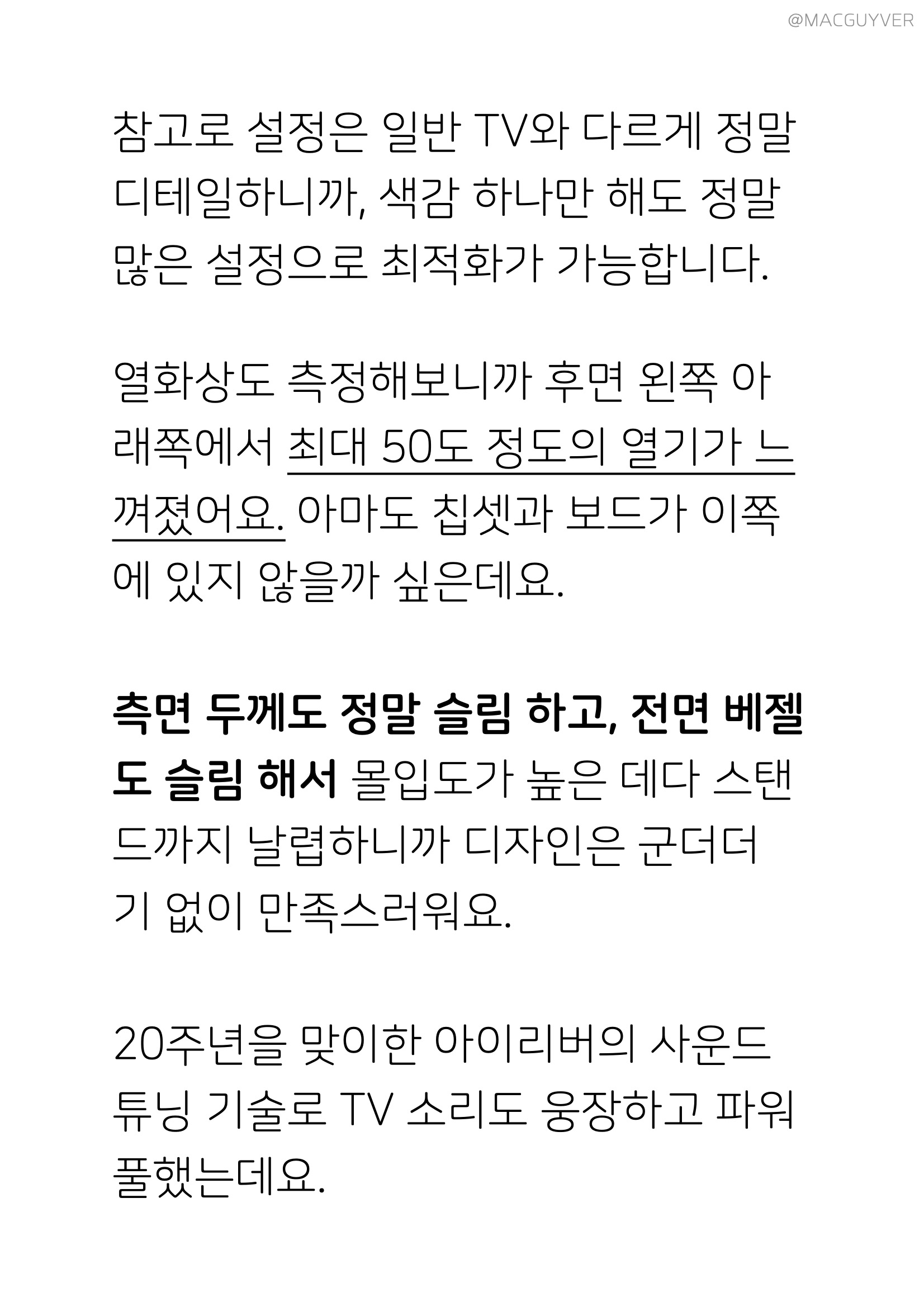 참고로 안드로이드 TV 아이리버 TV 설정은 일반 TV와 다르게 정말 디테일하니까, 색감 하나만 해도 정말 많은 설정으로 최적화가 가능합니다. UHD TV 열화상도 측정해보니까 후면 왼쪽 아래쪽에서 최대 50도 정도의 열기가 느껴졌어요. 아마도 칩셋과 보드가 이쪽에 있지 않을까 싶은데요. 측면 두께도 정말 슬림 하고, 전면 베젤도 슬림 해서 몰입도가 높은 데다 스탠드까지 날렵하니까 디자인은 군더더기 없이 만족스러워요. 20주년을 맞이한 아이리버의 사운드 튜닝 기술로 아이리버 TV 소리도 웅장하고 파워풀했는데요. 사운드 효과도 다양하고 서라운드 기능까지 적용되니까 TV 만으로 시청하기에도 아쉽지 않더라고요.