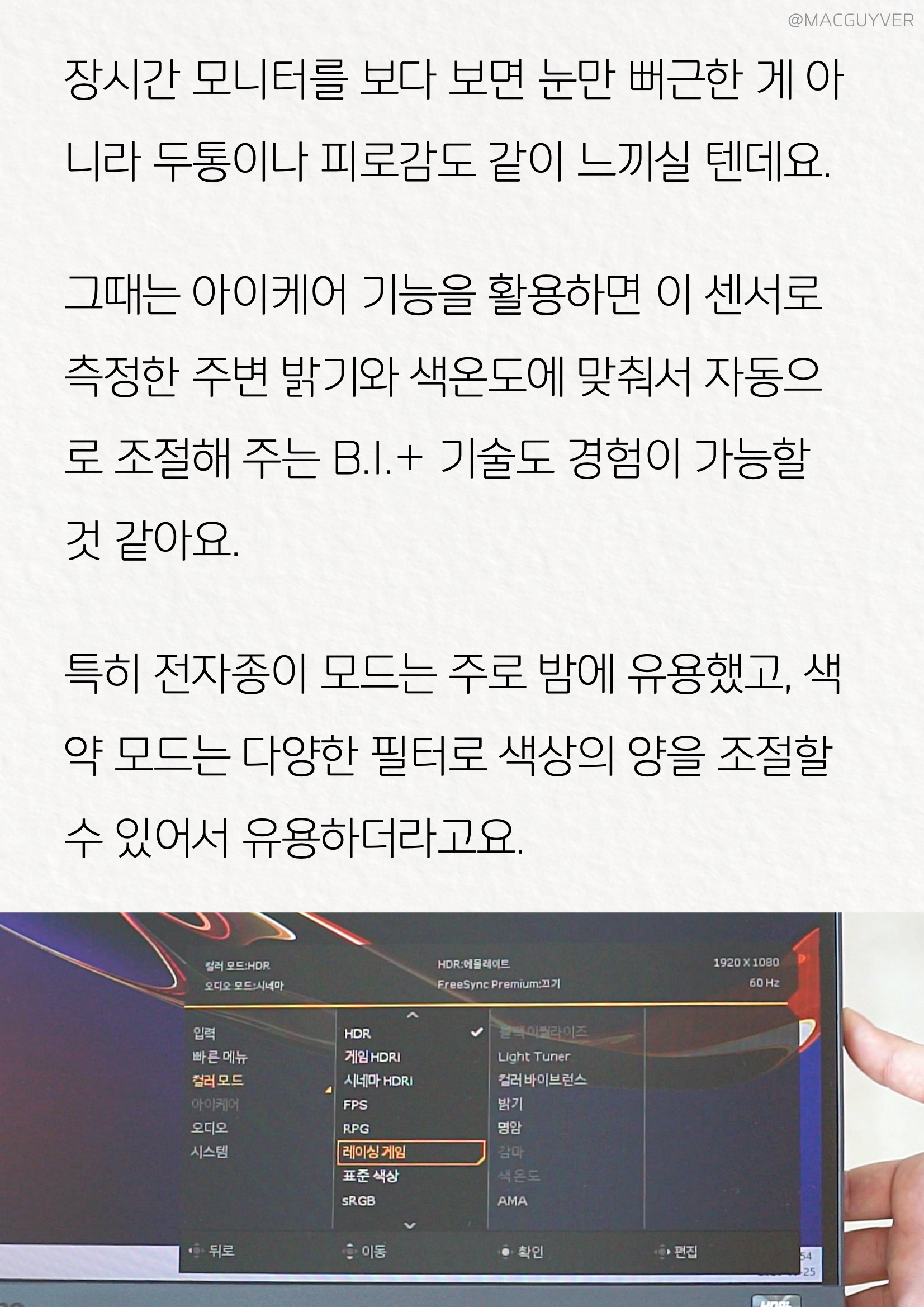 벤큐모니터 오늘 소개해드릴 제품은 깔끔하고 심플한 디자인, 144Hz 주사율과 1ms 응답속도, 눈이 편한 시력 보호 기능까지 겸비한 27인치모니터, 벤큐 MOBIUZ 게이밍 모니터인데요. 벤큐 모니터는 게임을 좀 즐기려는 분들이나, 공간 활용도를 높이고 싶은 분들, 장시간 작업에 눈의 피로를 느끼시는 분들에게 추천해드리고 싶은 제품입니다. 27인치모니터 아마 영화를 즐겨 보시는 분들이나 저처럼 영상 편집을 자주 하시는 분들도 계실 텐데요. 제법 괜찮은 포인트가 많아서 오늘은 그 부분을 중점적으로 소개해드릴 예정입니다. 벤큐모니터, 게이밍모니터 #1. 디자인 군더더기 없고 깔끔한 데다 직선을 제법 잘 쓴 것 같아요. 게임 좀 하시는 분들이라면 좋아할 만한 디자인이거든요. 개인적으로 벤큐모니터 스탠드 부분이 마음에 들었는데, 27인치모니터, 스위블 20도, 틸트는 위로 20도 아래로 5도까지, 엘리베이션도 130mm를 이동해서 최대 이 정도 최소 이 정도로 조절이 가능합니다. 케이블 커버에 스탠드 정리 가이드까지 있어서 깔끔하게 정리가 됩니다. FHD모니터, HDR모니터 버튼은 모양이 달라서 한 번만 만져보시면 바로 인지가 되실 것 같아요. 특히 벤큐모니터 눈에 띄는 부분이 HDR모니터 센서인데요. 대부분의 모니터에서는 보기 힘든 시력 보호 기능을 위한 파티션이라고 보시면 될 것 같습니다.