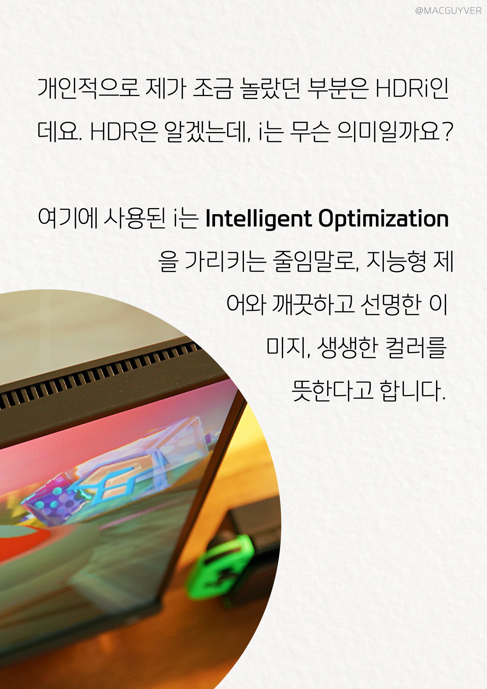 27인치모니터 #2. 조작성 우선 제 마음에 들었던 부분은 실제로 만져보면서 느껴졌는데요. 그냥 조작이 가능한 것을 넘어서 실용적인 조작성에 있거든요. 벤큐모니터, 게이밍모니터 하나씩 조절해보면 디테일한데다 시나리오 맵핑이라는 기능이 눈에 띌 것 같아요. 여러 기기에 맞춰서 최적화된 화면 설정을 즐겨찾기처럼 넣어두고 바로 바꿀 수 있더라고요. 그냥 모드만 변경하는 모니터가 대부분인데, 디테일하게 넣어두고 추가 설정도 바로 되니까 편했습니다. 물론, 일부 설정은 조건에 따라 되는 경우도 있고 안되는 경우도 있는데요. 어떤 기능과 어떤 기능을 함께 사용이 안 되는지도 알려주면 좋을 것 같기는 합니다. 144Hz모니터 #3. 화면 가장 중요한 화면은 사실 할 이야기가 많아요. 27인치모니터 인쇄된 것처럼 밀착된 화면이 인상적이었는데요. 그래서인지 벤큐모니터 화면이 안으로 들어간 느낌 없이 몰입도를 더해주더라고요. 거기다 베젤도 슬림 해서 더 깔끔하기도 한데요. 벤큐모니터 응답 속도부터 보자면, 이렇게 빠르게 조작해봐도 좀처럼 잔상이 보이지 않는 거죠. 확실히 1ms 응답 속도(MPRT)라서 빠른 것 같습니다. HDR모니터 개인적으로 제가 조금 놀랐던 부분은 HDRi인데요. HDR은 알겠는데, i는 무슨 의미일까요? 여기에 사용된 i는 Intelligent Optimization을 가리키는 줄임말로, FHD모니터, 지능형 제어와 깨끗하고 선명한 이미지, 생생한 컬러를 뜻한다고 합니다. 예를 들어서 게이밍모니터 게임을 하다 보면 특히 광원이나 재질에 따른 질감의 차이가 어떻게 표현되는지가 몰입도에서 큰 역할을 하거든요. 그런데 일부 설정에서는 너무 뿌옇고 입체감이 없거나 과한 광원을 보여주기도 하죠. HDR모니터 이때 '게임 HDRi'를 켜보면 각 개체별로 모서리가 정확하게 구분되는데다 색감이 선명해지고 짙어지면서 입체감이 살아나더라고요.