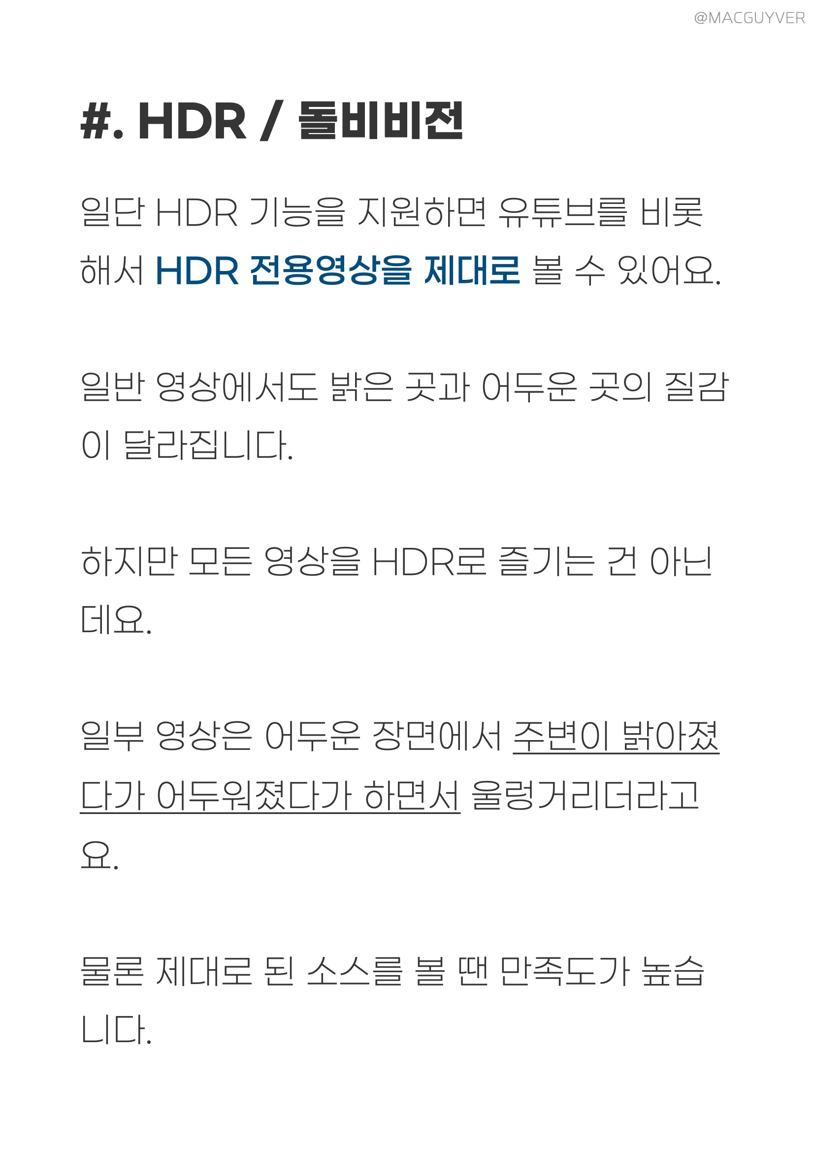 디스플레이 :: 기본 옵션과의 가장 큰 차이점이 화면스펙이라서, 성능을 알아보기 앞서 먼저 디스플레이부터 짚어볼게요. #. 500니트 야외에서 사용할 때 특히 강점인데요. 어두우면 화면에 다른 상이 맺혀서 눈이 불편할 수 있는데, 500니트라서 글래어패널인데도 화면에 제 얼굴이 비춰보이지 않아서 좋네요. 평소엔 눈부셔서 100%로 사용하진 못하고, 80%로 사용합니다. #. 4K 해상도 4K는 체감이 가능한가 싶으실 수 있는데, 노트북이 TV나 스마트폰보다 해상도 차이를 훨씬 뚜렷하게 체감할 수 있는 것 같아요. 화면이 적당히 큰데 가까이서 보니까요. 유튜브 영상을 FHD와 4K로 재생해보면 차이를 꽤 많이 느낄 수 있어요. 일반 화면의 선명도도 만족도를 더해줍니다. 물론 게이밍이라면 해상도보단 주사율이 더 많이 체감될 수 있지만 고화질 영상을 자주 보는 제 입장에선 4K가 만족도에서 많은 부분을 차지합니다. #. HDR / 돌비비전 일단 HDR 기능을 지원하면 유튜브를 비롯해서 HDR 전용영상을 제대로 볼 수 있어요. 일반 영상에서도 밝은 곳과 어두운 곳의 질감이 달라집니다. 하지만 모든 영상을 HDR로 즐기는 건 아닌데요. 일부 영상은 어두운 장면에서 주변이 밝아졌다가 어두워졌다가 하면서 울렁거리더라고요. 물론 제대로 된 소스를 볼 땐 만족도가 높습니다. #. 추천 사용자 디스플레이가 제법 돈값을 하긴 하는데요. 어디까지나 14인치 화면안에서입니다. 일반 400니트 화면을 선택하면 27만원이 절감되는데, 그 돈이면 저렴한 확장 모니터를 한대 구입할 수 있죠. 야외 사용이 잦은 분들이라면 LTE까지 있어서 야외 사용성이 특출난 이 옵션도 충분히 매력적입니다. 반면 실내에서 확장모니터를 주로 사용하실 분들은 하위 옵션의 가성비가 훨씬 만족스러울 것 같네요.