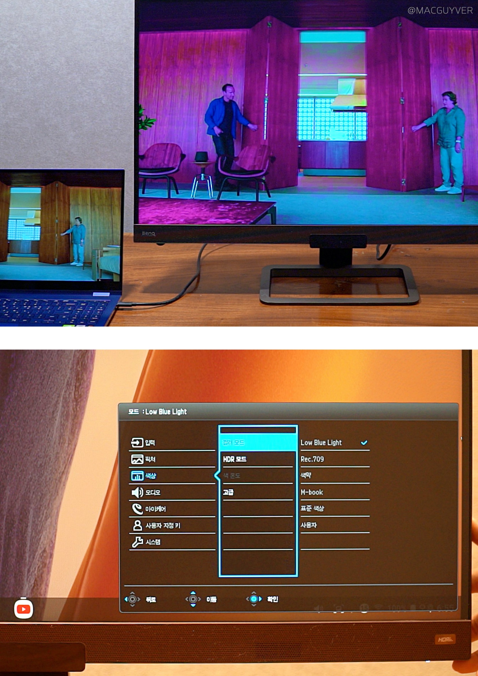 본질적으로 스피커 기능만 넣어둔게 아니라 벤큐 4K 모니터 자체적으로 TreVolo라는 사운드 팀이 있는데 거기서 튜닝하고 다듬은 사운드라서 일반적인 모니터의 사운드와 비교가 안되는 울림이나 정돈된 소리를 들려주더라고요. 참고로 벤큐 모니터 EQ에 따라서 울림이 더 커지거나 강의를 듣기에 적합한 소리를 들려주기도 하니까 그냥 재생하기보다는 설정을 만져보는 것을 추천합니다. 두번째로 벤큐 32인치 모니터의 소개해드릴 기능은 이 제품의 기본기가 뛰어나다는 것을 알 수 있는 '색약 모드'인데요. 단순히 화면의 톤 변경만으로 제대로 된 색약 모드를 지원할 수는 없기 때문에 BenQ EW3280U 모니터의 색약 모드를 사용해보면 특정 컬러를 잘 볼 수 없는 분들이 아쉬운 컬러를 채워서 원색처럼 볼 수 있는 장점을 경험할 수 있어요. 게이밍 모니터 참고로 HDR 모니터 논 글래어라서 주변 조명이 그대로 맺히지는 않지만 뿌옇게 번지거나 흐릿해 보이는 경우는 있으니까 빛이 화면을 직접 비추거나 강하게 쏘지 않도록 조절하면 더 편하게 보실 수 있을 것 같습니다.