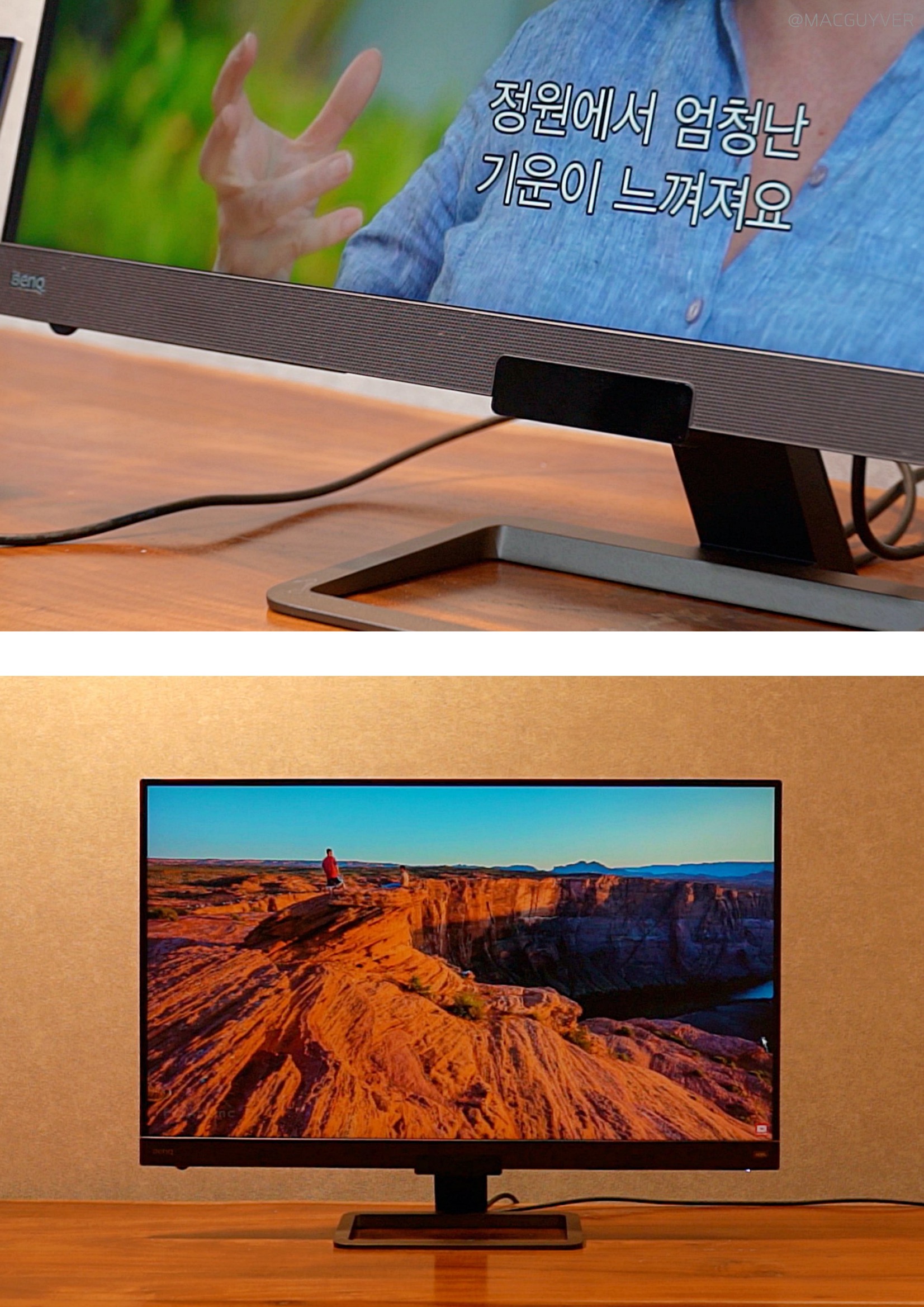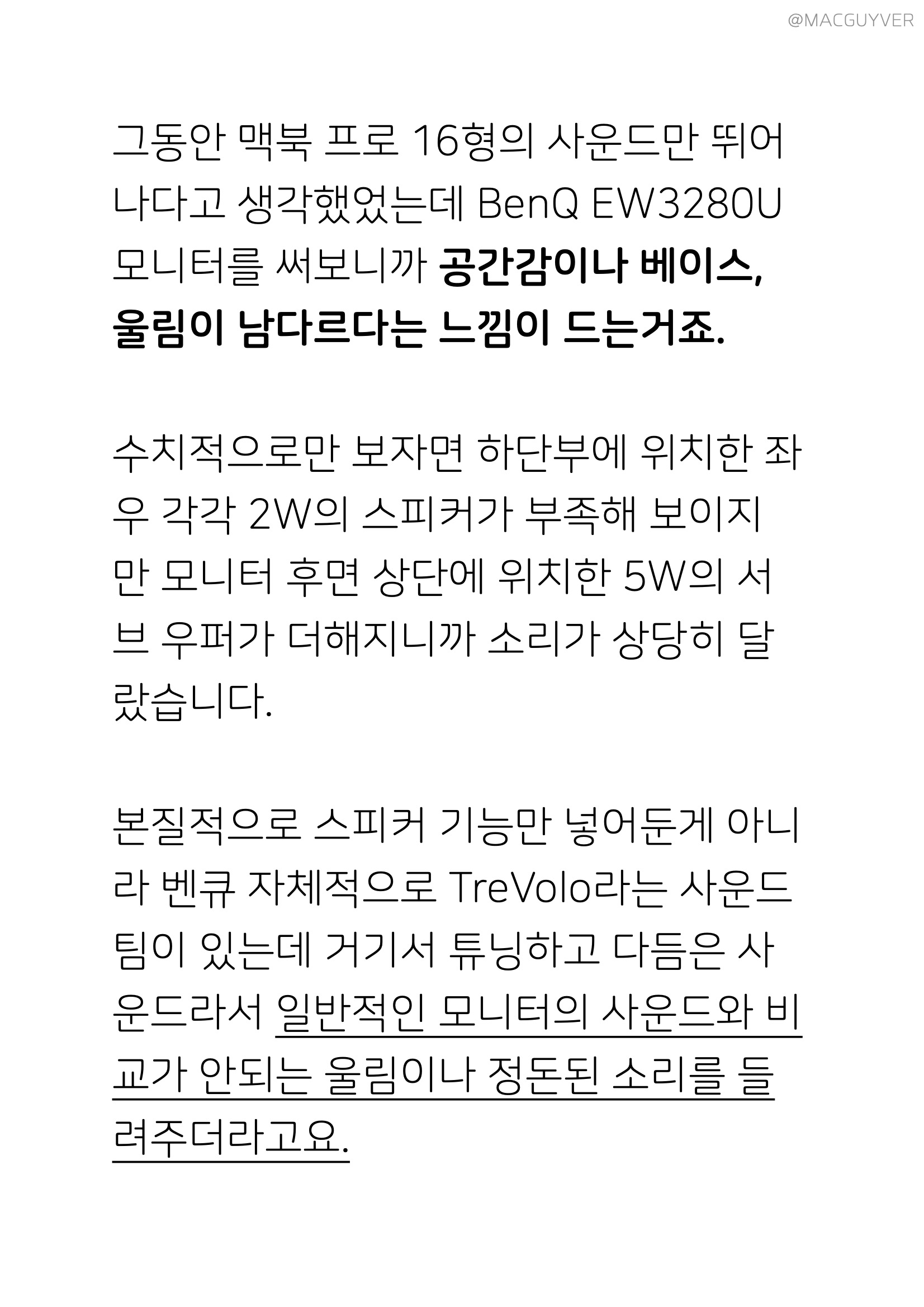 가볍게 게임만 즐기려는 분들도 계시지만, 게임도 하고 영화도 감상하고 영상 편집까지 다양하게 활용하고 싶은 분들도 요즘에는 많으신 것 같은데요. 바로 그런 니즈에 꼭 맞춰진 HDR 모니터, 전문가용 모니터가 있어서 살펴본 소감을 소개해드릴게요. BenQ EW3280U 모니터의 특징이라면 32인치 화면, 4K HDR, 고음질 사운드가 있거든요. 아마 영상 리뷰를 먼저 보셨다면 사운드를 바로 들어보셨을 것 같은데요. 게이밍 모니터 소리가 정말 끝내주니까 보는 경험에 더해서 몰입도가 상당히 높아지더라고요. 그동안 맥북 프로 16형의 사운드만 뛰어나다고 생각했었는데 BenQ EW3280U 모니터를 써보니까 확실히 공간감이나 베이스, 울림이 남다르다는 느낌이 드는거죠. 벤큐 모니터 수치적으로만 보자면 하단부에 위치한 좌우 각각 2W의 스피커가 부족해 보이지만 모니터 후면 상단에 위치한 5W의 서브 우퍼가 더해지니까 소리가 상당히 달랐습니다.