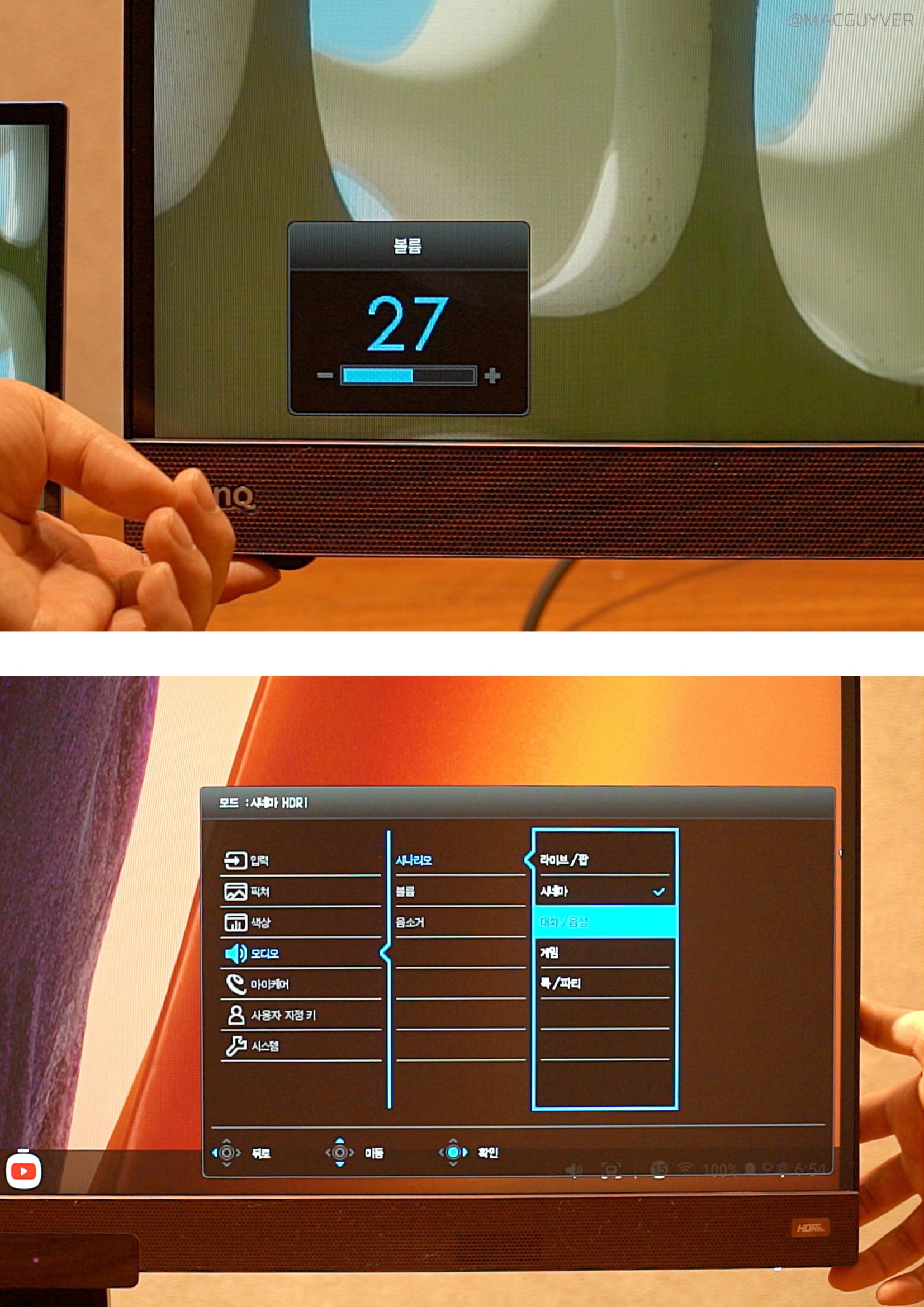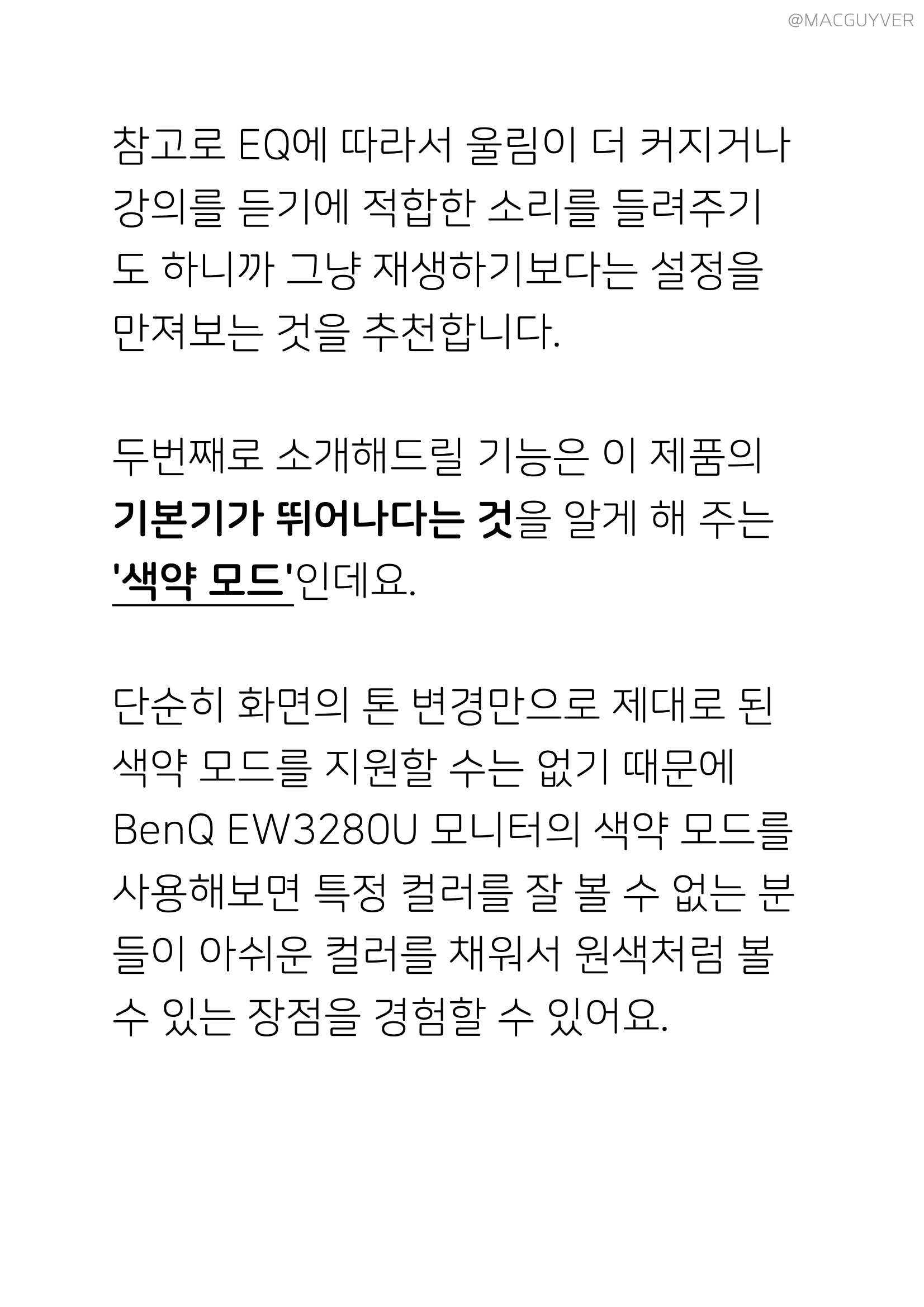 본질적으로 스피커 기능만 넣어둔게 아니라 벤큐 4K 모니터 자체적으로 TreVolo라는 사운드 팀이 있는데 거기서 튜닝하고 다듬은 사운드라서 일반적인 모니터의 사운드와 비교가 안되는 울림이나 정돈된 소리를 들려주더라고요. 참고로 벤큐 모니터 EQ에 따라서 울림이 더 커지거나 강의를 듣기에 적합한 소리를 들려주기도 하니까 그냥 재생하기보다는 설정을 만져보는 것을 추천합니다. 두번째로 벤큐 32인치 모니터의 소개해드릴 기능은 이 제품의 기본기가 뛰어나다는 것을 알 수 있는 '색약 모드'인데요. 단순히 화면의 톤 변경만으로 제대로 된 색약 모드를 지원할 수는 없기 때문에 BenQ EW3280U 모니터의 색약 모드를 사용해보면 특정 컬러를 잘 볼 수 없는 분들이 아쉬운 컬러를 채워서 원색처럼 볼 수 있는 장점을 경험할 수 있어요. 게이밍 모니터 참고로 HDR 모니터 논 글래어라서 주변 조명이 그대로 맺히지는 않지만 뿌옇게 번지거나 흐릿해 보이는 경우는 있으니까 빛이 화면을 직접 비추거나 강하게 쏘지 않도록 조절하면 더 편하게 보실 수 있을 것 같습니다.
