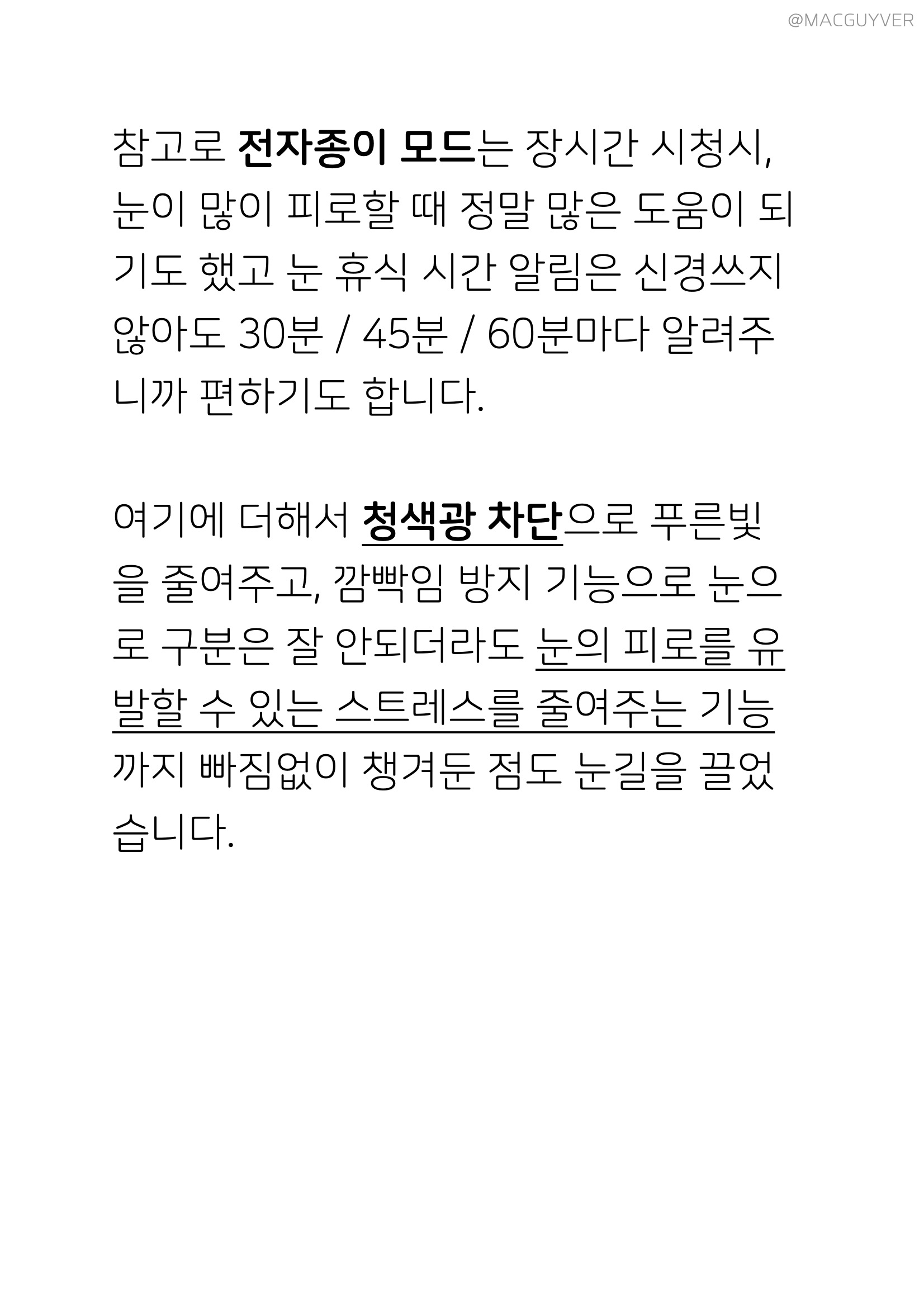 색약에 더해서 BenQ EW3280U 4K 모니터는 아이케어 기능을 제대로 지원하는데요. 일반적인 모니터에서는 만나볼 수 없는 센서가 모니터 중앙 하단에 자리하고 있거든요. 그래서 이 HDR 모니터 센서로 조도와 색온도를 측정하게 되는데, 그 수치에 따라서 자동으로 밝기를 조절해주고 색감, 화이트 밸런스까지 맞춰주니까 눈의 피로를 줄여주는거죠. 참고로 벤큐 모니터 전자종이 모드는 장시간 시청시, 눈이 많이 피로할 때 정말 많은 도움이 되기도 했고 눈 휴식 시간 알림은 신경쓰지 않아도 30분 / 45분 / 60분마다 알려주니까 편하기도 합니다. 게이밍 모니터 32인치 모니터 여기에 더해서 청색광 차단으로 푸른빛을 줄여주고, 깜빡임 방지 기능으로 눈으로 구분은 잘 안되더라도 눈의 피로를 유발할 수 있는 스트레스를 줄여주는 기능까지 빠짐없이 챙겨둔 점도 눈길을 끌었습니다.