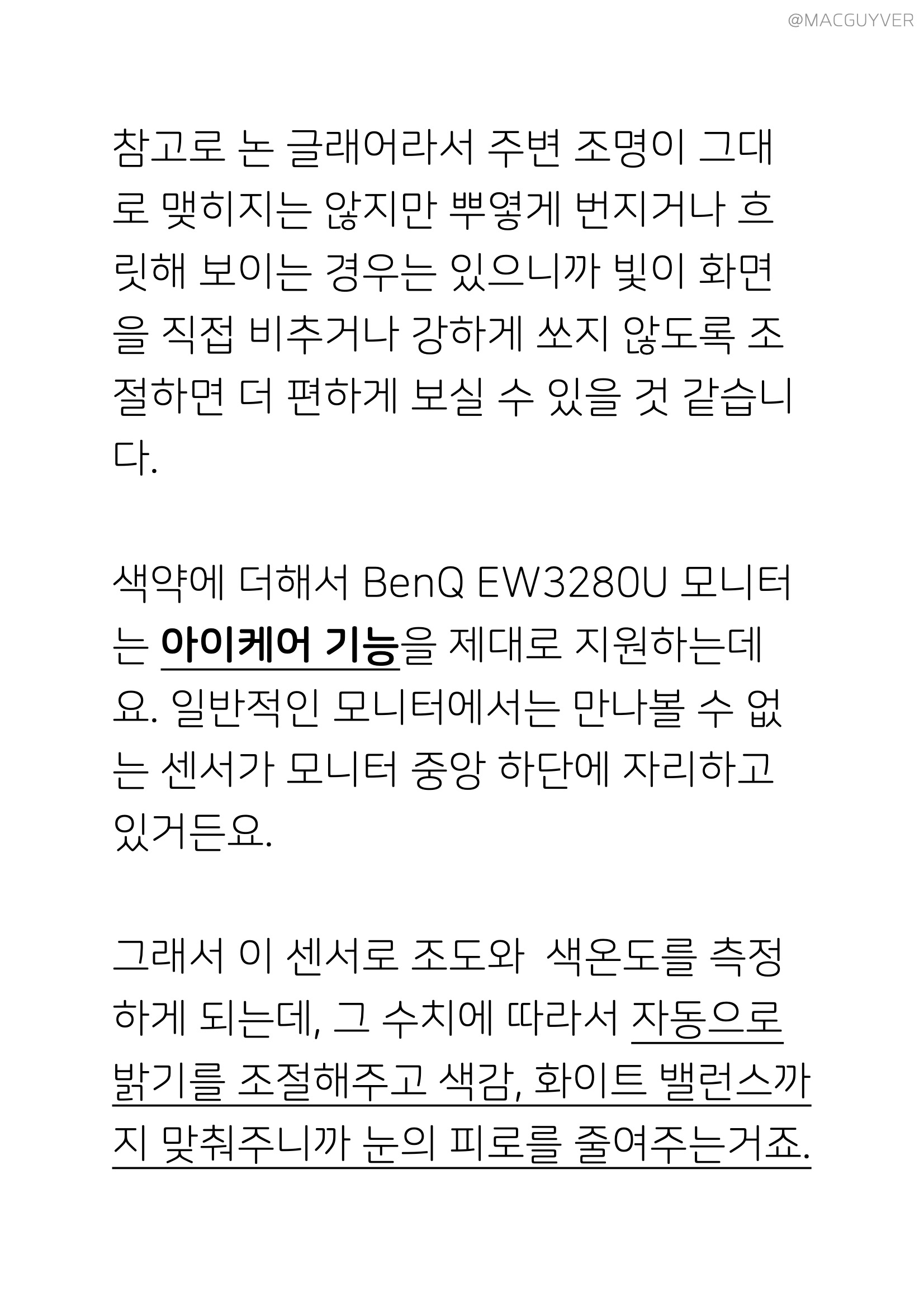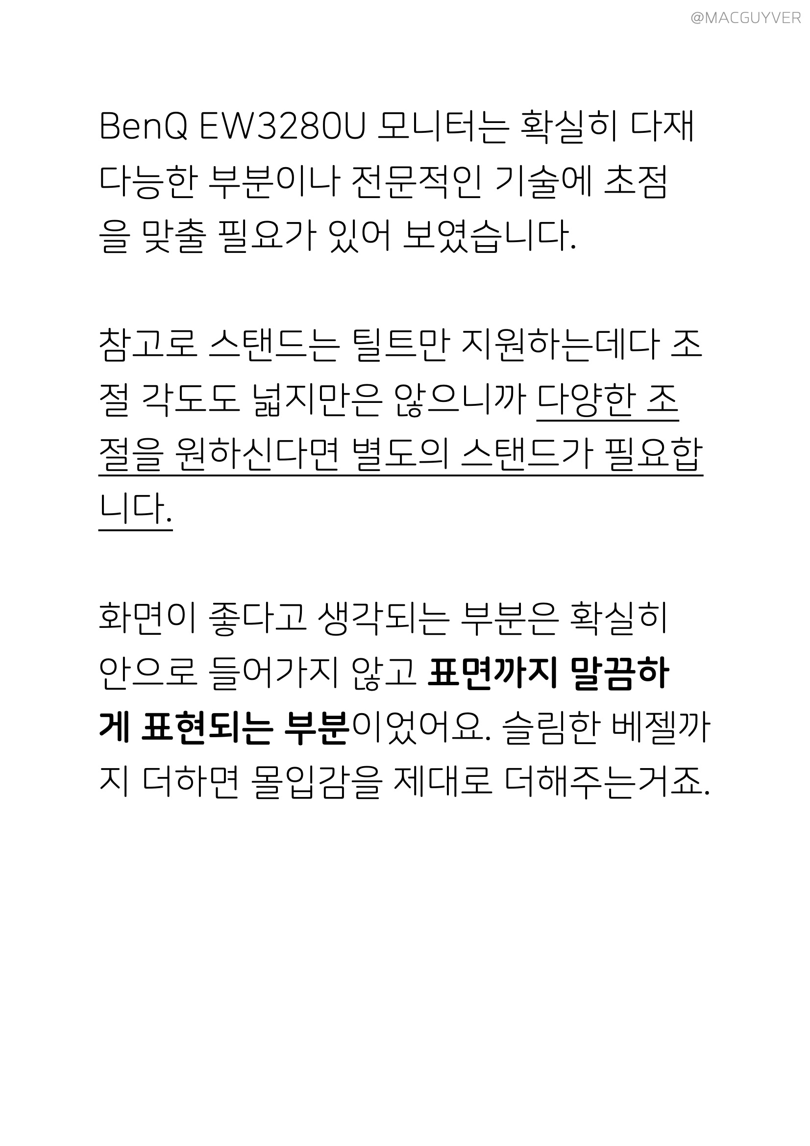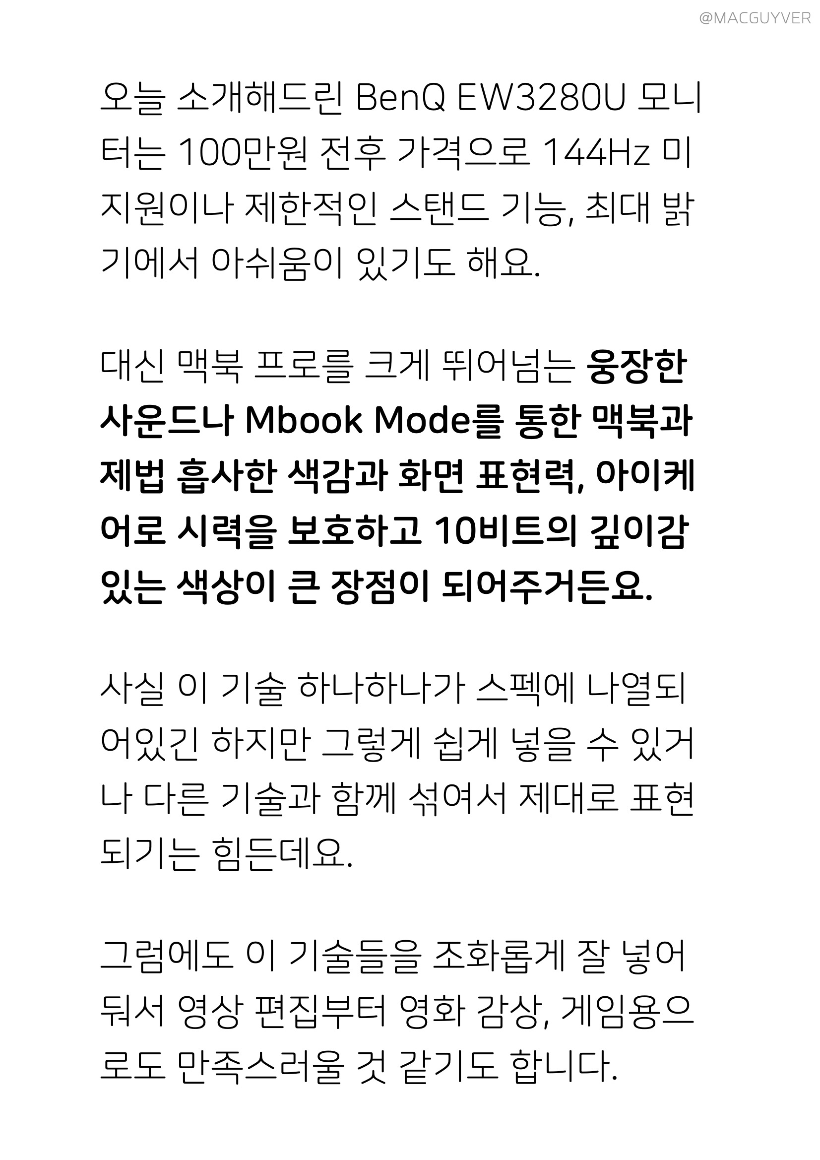 오늘 소개해드린 BenQ EW3280U 모니터, HDR 모니터는 100만원 전후 가격으로 144Hz 미지원이나 제한적인 스탠드 기능, 최대 밝기에서 아쉬움이 있기도 해요. 시력보호 모니터 대신 맥북 프로를 크게 뛰어넘는 웅장한 사운드나 Mbook Mode를 통한 맥북과 제법 흡사한 색감과 화면 표현력, 아이케어로 시력을 보호하고 10비트의 깊이감 있는 색상이 큰 장점이 되어주거든요. 전문가용 모니터 사실 이 기술 하나하나가 스펙에 나열되어있긴 하지만 그렇게 쉽게 넣을 수 있거나 다른 기술과 함께 섞여서 제대로 표현되기는 힘든데요. 그럼에도 벤큐 모니터는 이 기술들을 조화롭게 잘 넣어둬서 영상 편집부터 영화 감상, 게임용으로도 만족스러울 것 같기도 합니다. 게이밍 모니터 개인적으로는 벤큐 4K 모니터를 C타입 케이블로 스마트폰과 빠르게 연결해보고 HDRi 기술로 깊이감 있는 감상을 해보는 것도 만족스러웠습니다. 전문가용 모니터 다른 모니터에 있는 일부 기능이 제외된 건 아쉽기도 하지만, 다른 모니터에 없거나 부족한 기능들을 오히려 충실히 채워둔 부분도 눈길을 끌더라고요. 시력보호 모니터 한 번 구입하면 오래 사용하는데 더해 시력에 미치는 영향도 무시할 수 없는 모니터를 선택할 때 단순히 '가성비'만 선택의 이유가 되는 것보다는 이러한 기본기를 따져보는 것도 중요하지 않을까 합니다. BenQ EW3280U 모니터에 대해 더 알아보고 싶으신 분들은 아래 배너를 통해 자세히 알아보실 수 있습니다.