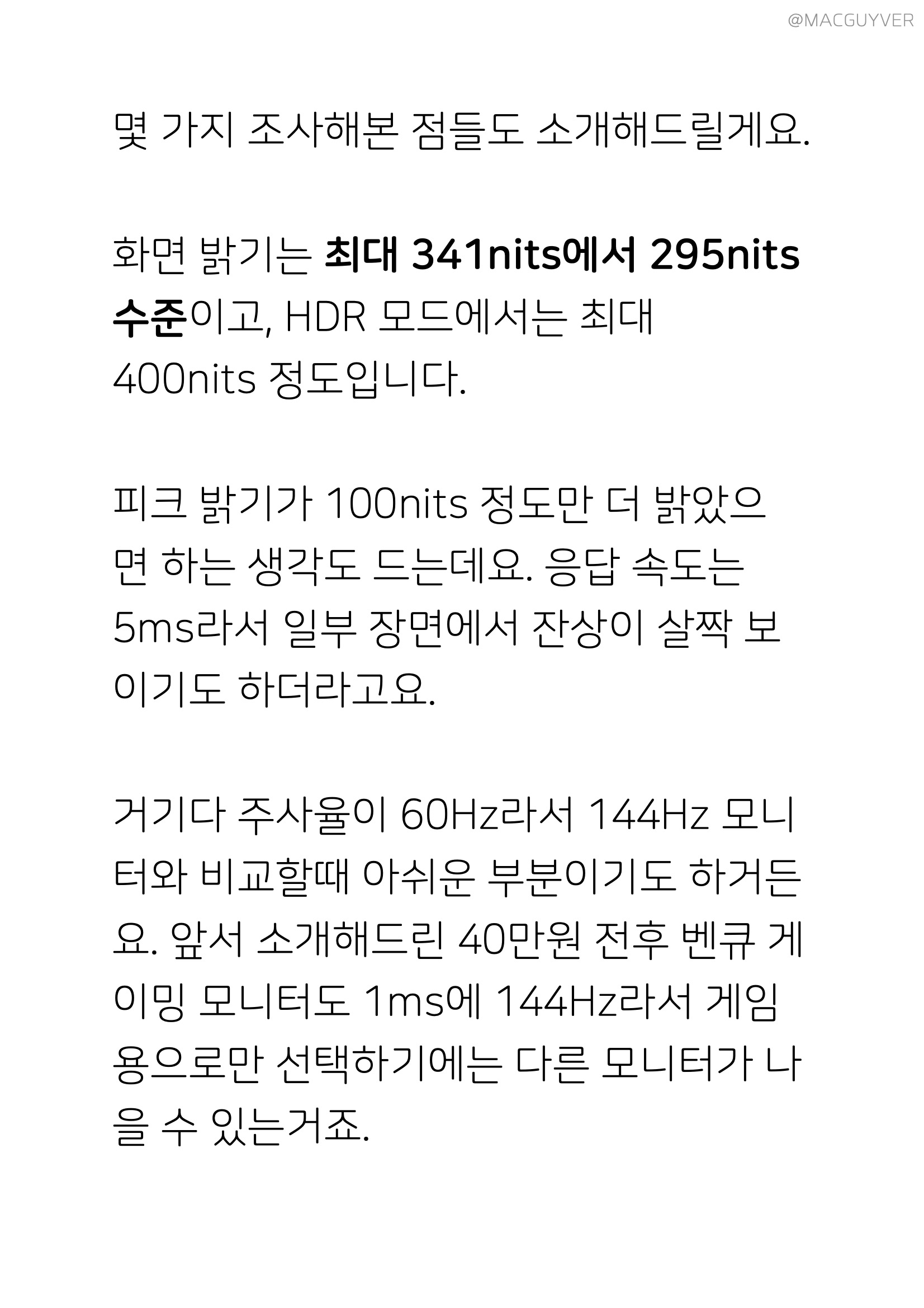 벤큐 4K 모니터 몇 가지 조사해본 점들도 소개해드릴게요. 화면 밝기는 최대 341nits에서 295nits 수준이고, HDR 모드에서는 최대 400nits 정도입니다. 벤큐 모니터 피크 밝기가 100nits 정도만 더 밝았으면 하는 생각도 드는데요. 응답 속도는 5ms라서 일부 장면에서 잔상이 살짝 보이기도 하더라고요. HDR 모니터 거기다 주사율이 60Hz라서 144Hz 모니터와 비교할때 아쉬운 부분이기도 하거든요. 앞서 소개해드린 40만원 전후 벤큐 게이밍 모니터도 1ms에 144Hz라서 게임용으로만 선택하기에는 다른 모니터가 나을 수 있는거죠. BenQ EW3280U 모니터는 확실히 다재다능한 부분이나 전문적인 기술에 초점을 맞출 필요가 있어 보였습니다. 참고로 스탠드는 틸트만 지원하는데다 조절 각도도 넓지만은 않으니까 다양한 조절을 원하신다면 별도의 스탠드가 필요합니다.