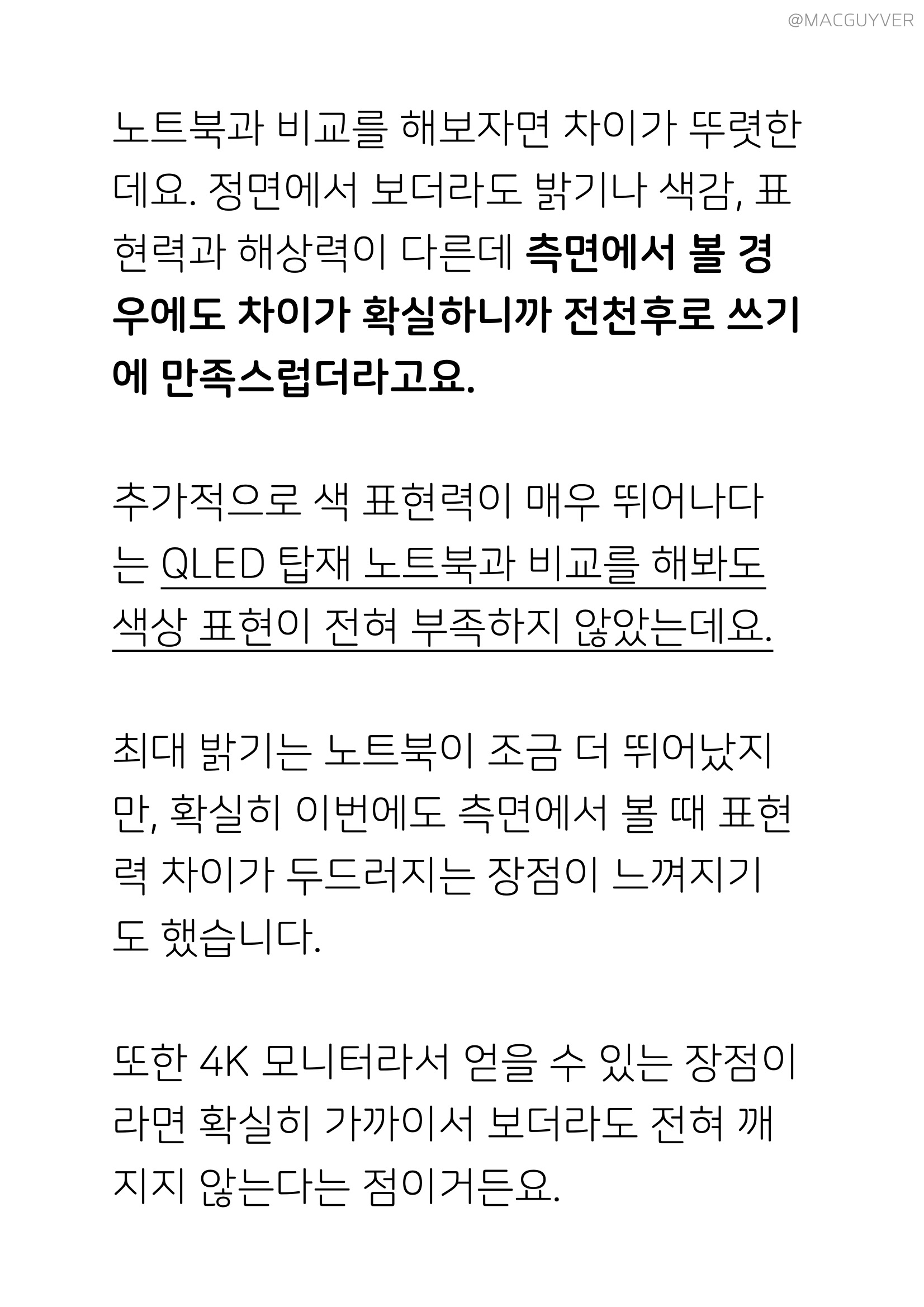 화면이 좋다고 생각되는 부분은 확실히 안으로 들어가지 않고 표면까지 말끔하게 표현되는 부분이었어요. 슬림한 베젤까지 더하자면 몰입감을 제대로 더해주는거죠. 벤큐 4K 모니터 노트북과 비교를 해보자면 차이가 뚜렷한데요. 정면에서 보더라도 밝기나 색감, 표현력과 해상력이 다른데 측면에서 볼 경우에도 차이가 확실하니까 전천후로 쓰기에 만족스럽더라고요. 시력보호 모니터 추가적으로 색 표현력이 매우 뛰어나다는 QLED 탑재 노트북과 비교를 해봐도 색상 표현이 전혀 부족하지 않았는데요. HDR 모니터 최대 밝기는 노트북이 조금 더 뛰어났지만, 확실히 이번에도 측면에서 볼 때 표현력 차이가 두드러지는 장점이 느껴지기도 했습니다. 게임용 모니터 또한 4K 모니터라서 얻을 수 있는 장점이라면 확실히 가까이서 보더라도 전혀 깨지지 않는다는 점이거든요. 벤큐 모니터 단지 화면만 큰게 아니라 이 넓은 화면을 고르게 뛰어난 화면을 보여주면서 디테일이 살아있고 표현을 제대로 해주니까 만족스러운거죠. 게임용 모니터 요즘에는 4K 컨텐츠도 많아져서 확실히 BenQ EW3280U 모니터로 얻을 수 있는 장점이 많을 것 같기도 합니다. 개인적으로는 4K 영상 편집을 하거나 FHD 영상을 좌우로 동시에 재생하면서 편집할때도 유용하더라고요.