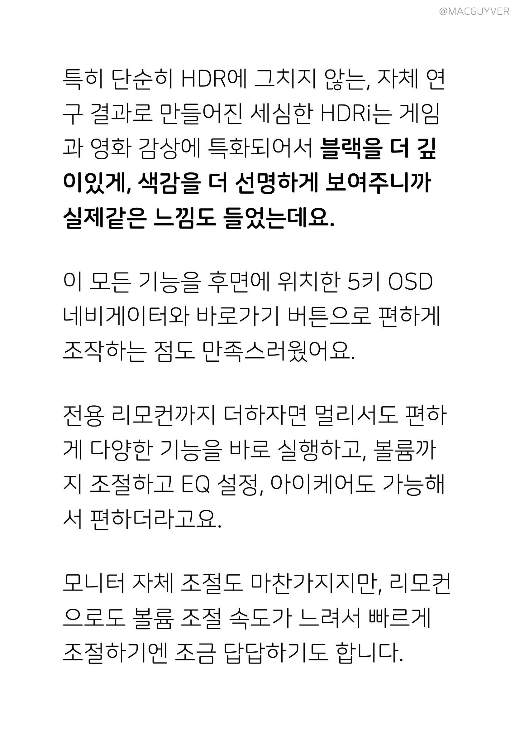 정리하자면 전문가용 모니터 BenQ EW3280U 모니터는 P3 95% 광색역 표현에 HDR 기술, FreeSync 및 C타입 케이블 지원으로 다양한 최신 기술과 표준에 맞춰져 있었어요. 시력보호 모니터 특히 단순히 HDR에 그치지 않는, 자체 연구 결과로 만들어진 세심한 HDRi는 게임과 영화 감상에 특화되어서 블랙을 더 깊이있게, 색감을 더 선명하게 보여주니까 실제같은 느낌도 들었는데요. 벤큐 모니터 이 모든 기능을 4K 모니터 후면에 위치한 5키 OSD 네비게이터와 바로가기 버튼으로 편하게 조작하는 점도 만족스러웠어요. 게임용 모니터 전용 리모컨까지 더하자면 멀리서도 편하게 다양한 기능을 바로 실행하고, 볼륨까지 조절하고 EQ 설정, 아이케어도 가능해서 편하더라고요. 게이밍 모니터 물론 벤큐 32인치 모니터 자체 조절도 마찬가지지만, 리모컨으로도 볼륨 조절 속도가 느려서 빠르게 조절하고 싶을때는 조금 답답하기도 합니다.