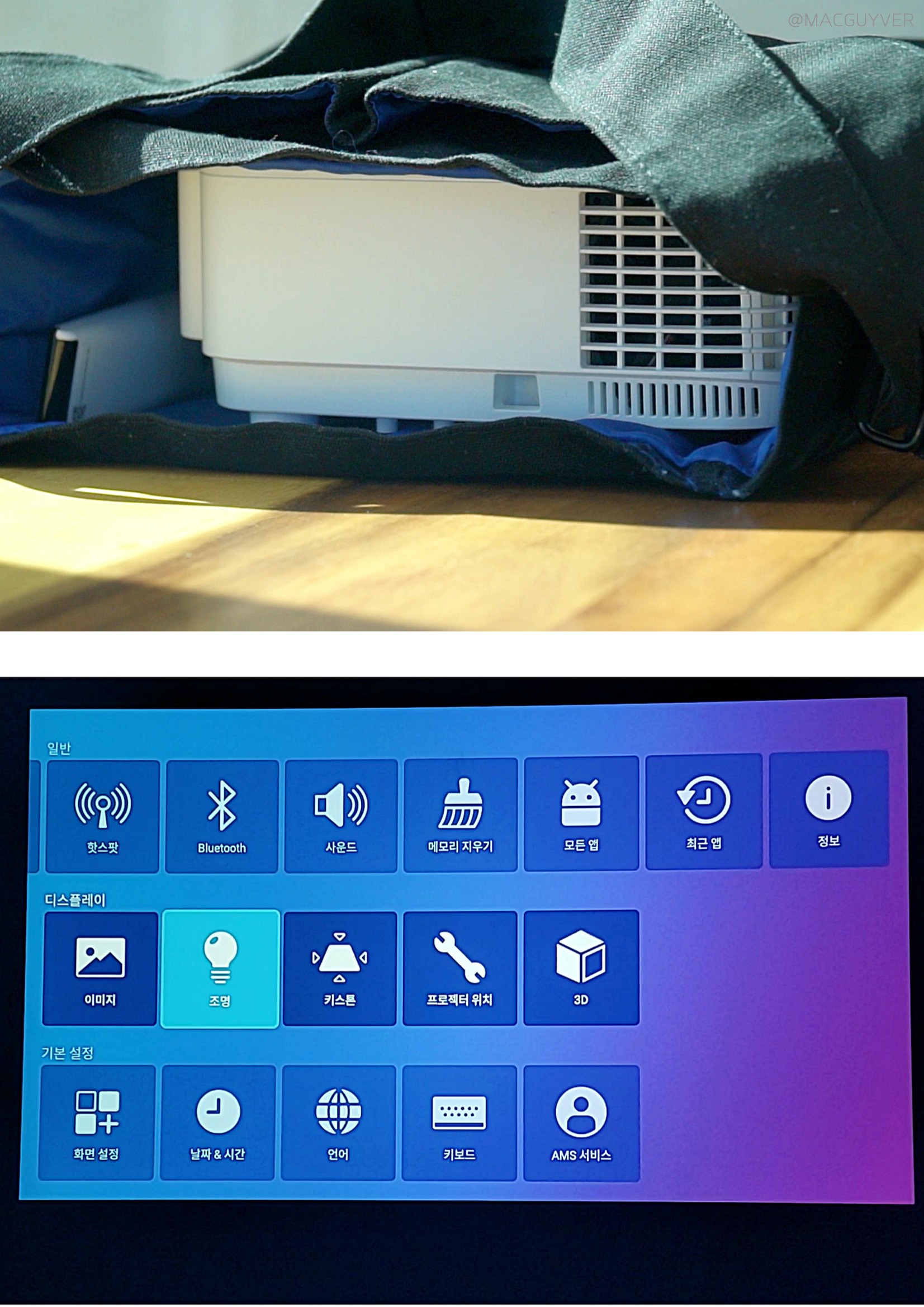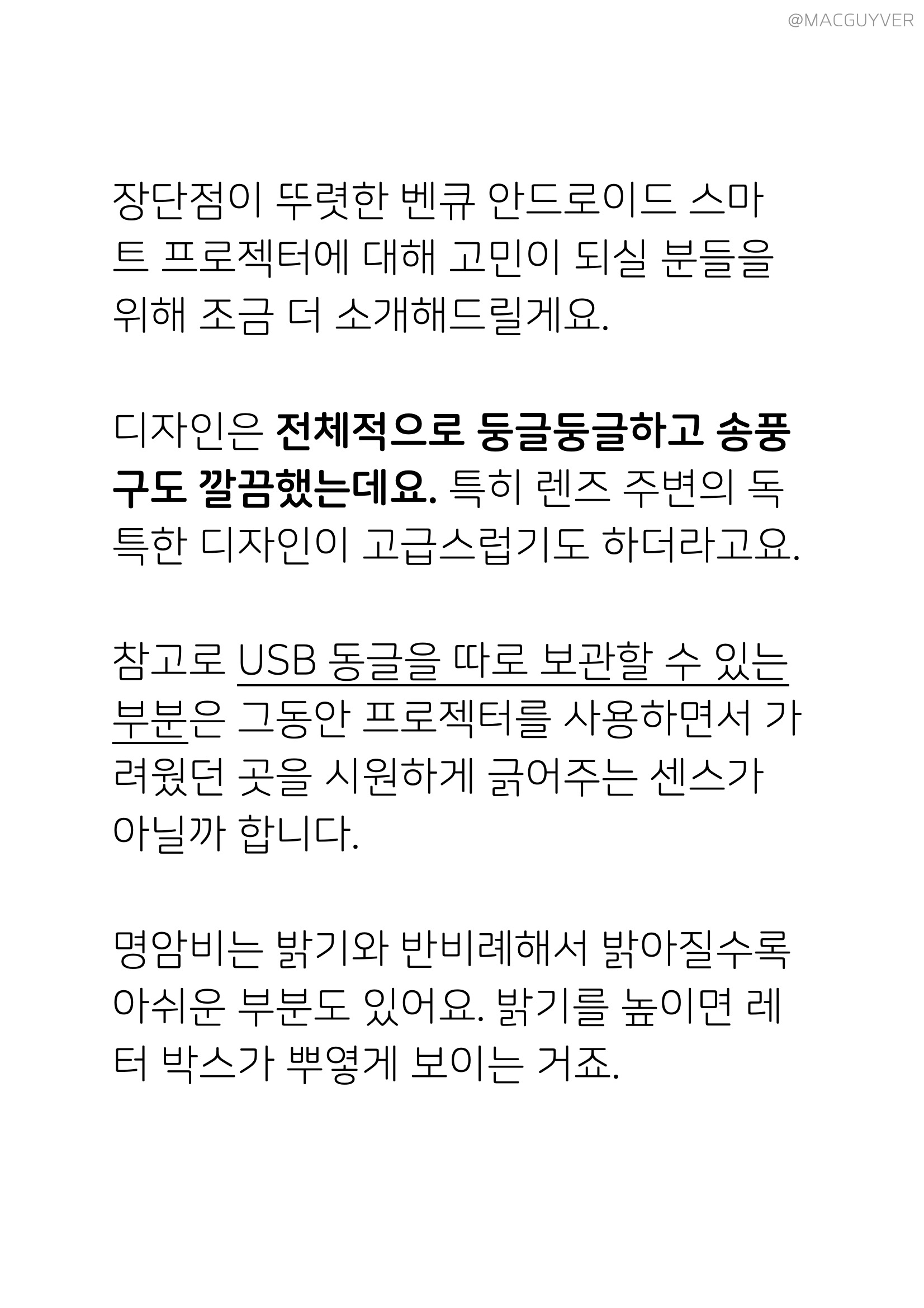 물론 장점만 있는 게 아니라 몇 가지 아쉬움도 있었어요. #1. 빔 프로젝터 사운드가 많이 아쉬워요. 그래서 여럿이서 대화하거나 줌으로 화상 회의를 할 때 별도의 블루투스 스피커를 찾게 되더라고요. #2. 제가 리뷰용으로 사용한 제품은 단초점 모델이 아니라서 2m에서는 60인치 정도, 3m를 넘어서야 100인치를 볼 수 있기도 했어요. #3. 프로젝터에서 은근히 유용한 자체 줌 기능도 1.1배 줌만 지원하니까 같은 거리에서 더 크게 또는 더 작게 보고 싶어도 기기 자체를 이동해야 하는 한계가 있더라고요. #4. 후면 단자도 종류가 많아 보이지만 요즘 자주 사용되는 C타입 단자가 없었어요. #5. 일반 모드나 에코 모드와 관련 없이 느껴지는 열기는 비슷해요. #6. 전용 앱을 이용한 자체 마우스 조작은 조금 굼뜨고 세밀하지 않더라고요.