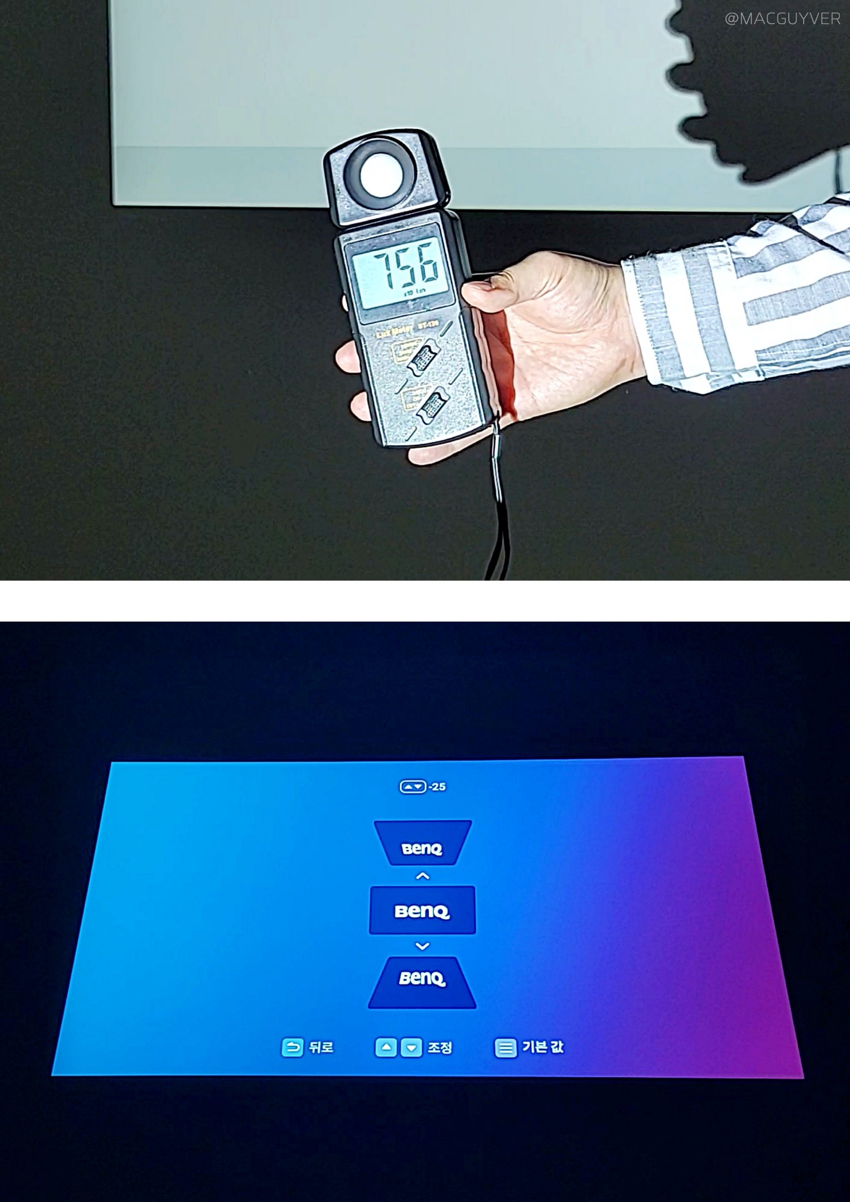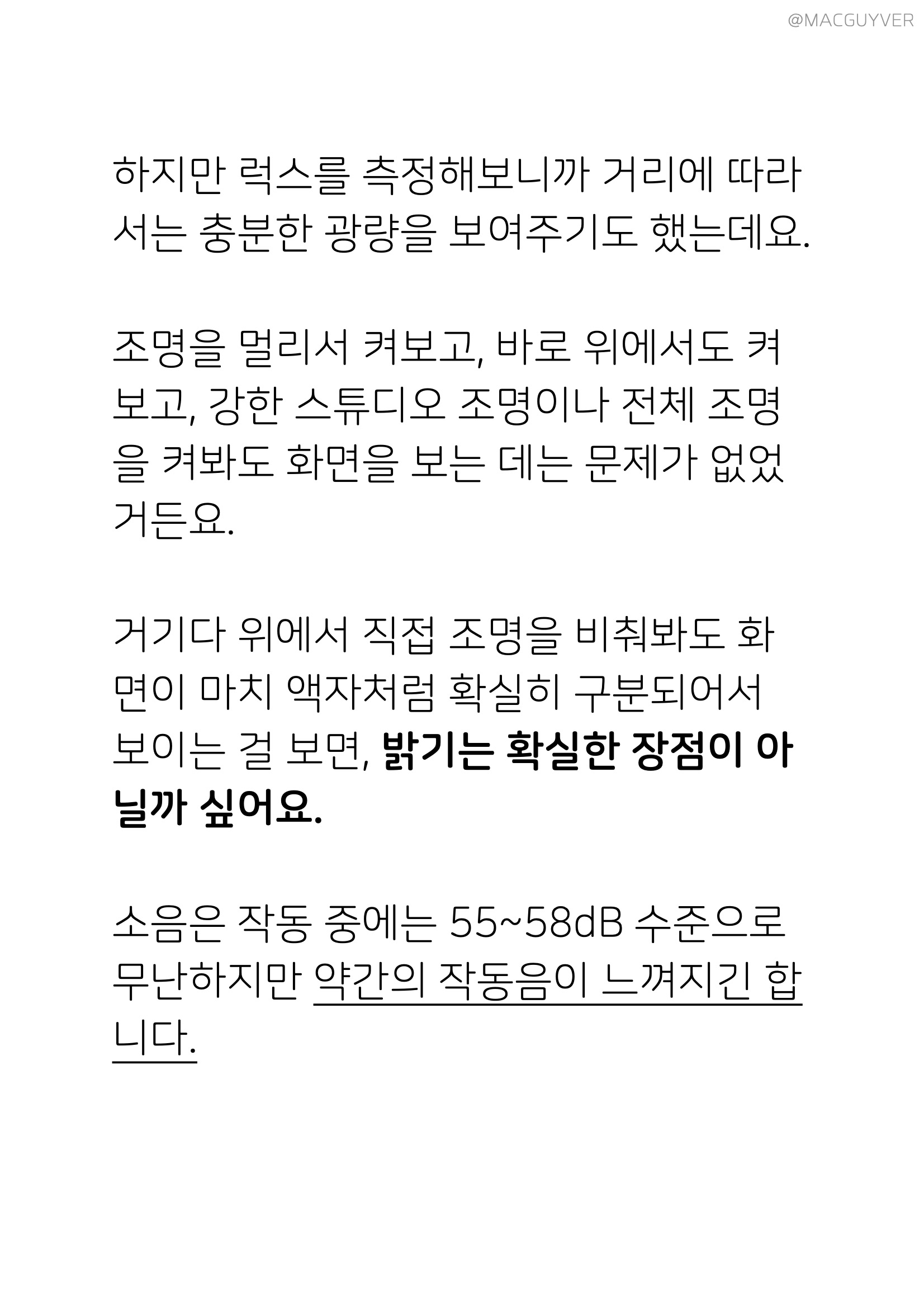 장단점이 뚜렷한 벤큐 안드로이드 스마트 프로젝터에 대해 고민이 되실 분들을 위해 조금 더 소개해드릴게요. 고성능 프로젝터 디자인은 전체적으로 둥글둥글하고 송풍구도 깔끔했는데요. 특히 렌즈 주변의 독특한 디자인이 고급스럽기도 하더라고요. 참고로 USB 동글을 따로 보관할 수 있는 부분은 그동안 프로젝터를 사용하면서 가려웠던 곳을 시원하게 긁어주는 센스가 아닐까 합니다. 고성능 프로젝터 명암비는 밝기와 반비례해서 밝아질수록 아쉬운 부분도 있어요. 밝기를 높이면 레터 박스가 뿌옇게 보이는 거죠. 하지만 럭스를 측정해보니까 거리에 따라서는 충분한 광량을 보여주기도 했는데요. 조명을 멀리서 켜보고, 바로 위에서 켜보고, 강한 스튜디오 조명이나 전체 조명을 켜봐도 빔 프로젝터 화면을 보는 데는 문제가 없었거든요. 또 위에서 바로 조명을 비춰도 화면이 마치 액자처럼 확실히 구분되어서 보이는 걸 보면, 밝기는 확실한 장점이 아닐까 싶어요. 소음은 작동 중에는 55~58dB 수준으로 무난하지만 약간의 작동음이 느껴지긴 합니다.