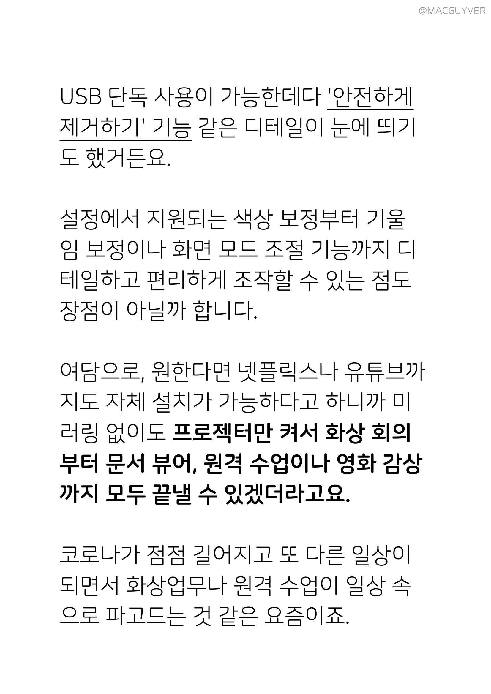 램프의 수명은 표준 모드에서 5,000시간이지만 에코 모드에서는 15,000시간까지 늘어나니까 사용 환경이나 패턴에 따라 수명이 크게 달라지는데요. 벤큐 프로젝터 키스톤 보정은 생각보다 반응이 빨랐고, 이동에 강점을 지닌 제품답게 기기 무게는 가벼운 편이라 휴대가 간편하기도 했어요. 특히 메뉴 구성이 직관적인 데다 예쁘기까지 하니까 스마트폰 같은 느낌도 들어서, 이만하면 누구나 편리한 사용이 가능할 것 같더라고요. 3500안시 프로젝터 거기다 기능들을 세심하게 배치해둬서 설정을 찾아 헤매지 않아도 되었는데요. 벤큐 프로젝터는 USB 단독 사용이 가능한데다 '안전하게 제거하기' 기능을 보니까 디테일이 눈에 띄기도 했거든요. 빔 프로젝터 설정에서 지원되는 색상 보정부터 기울임 보정이나 화면 모드 조절 기능까지 디테일하고 편리하게 조작할 수 있는 점도 장점이 아닐까 합니다. 밝은 프로젝터 여담으로, 원한다면 넷플릭스나 유튜브까지도 자체 설치가 가능하다고 하니까 미러링 없이도 프로젝터만 켜서 화상 회의부터 문서 뷰어, 원격 수업이나 영화 감상까지 모두 끝낼 수 있더라고요.