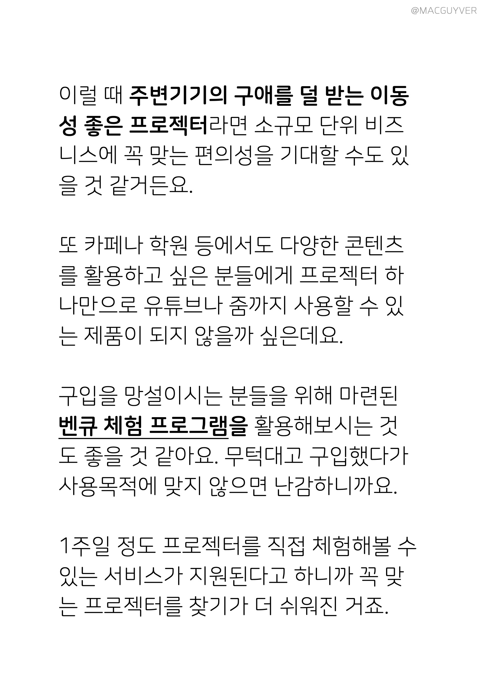 코로나가 점점 길어지고 또 다른 일상이 되면서 화상회의, 원격 수업, 원격 비즈니스, 화상 회의 시스템이 일상 속으로 파고드는 것 같은 요즘이죠. 이럴 때 주변기기의 구애를 덜 받는 이동성 좋은 프로젝터, 벤큐 프로젝터라면 화상 회의 시스템, 소규모 단위 비즈니스에 꼭 맞는 고성능 프로젝터의 편의성을 기대할 수도 있을 것 같거든요. 또 카페나 학원 등에서도 다양한 콘텐츠를 활용하고 싶은 분들에게 프로젝터 하나만으로 유튜브나 줌까지 사용할 수 있는 3500안시 프로젝터 제품이 되지 않을까 싶은데요. 벤큐 프로젝터 구입을 망설이시는 분들을 위해 마련된 벤큐 체험 프로그램을 활용해보시는 것도 좋을 것 같아요. 3500안시 프로젝터 무턱대고 구입했다가 사용목적에 맞지 않으면 난감하니까요. 밝은 프로젝터 1주일 정도 프로젝터를 직접 체험해볼 수 있는 서비스가 지원된다고 하니까 꼭 맞는 프로젝터를 찾기가 더 쉬워진 거죠.