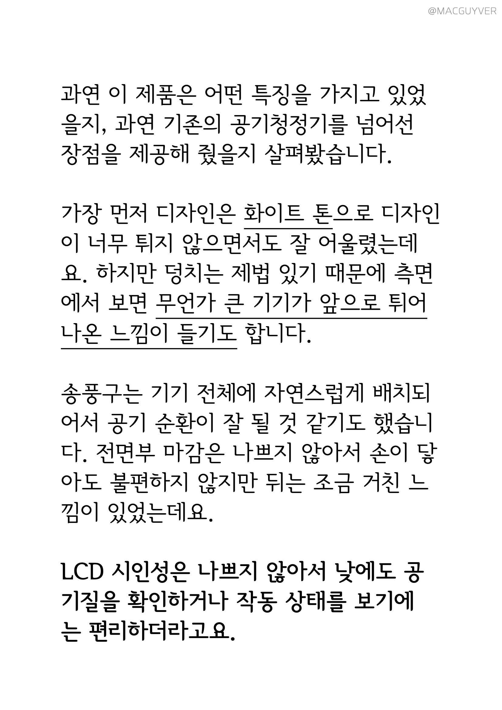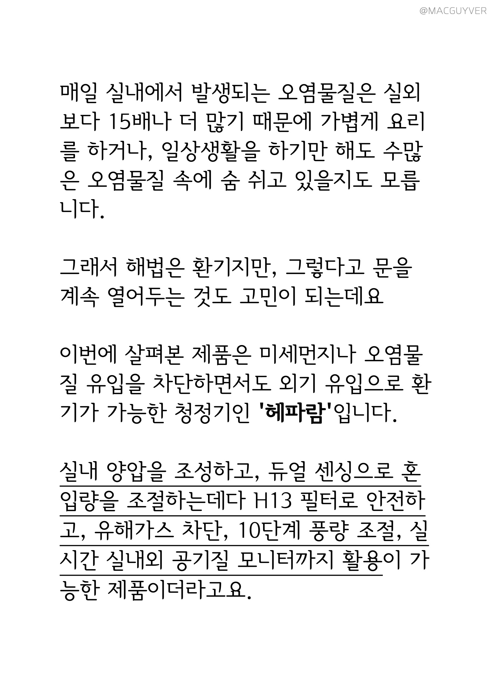 공기청정기 추천 공기청정기가 필수품이 된 요즘, 실내 공기질이 좋다고만 생각하기 쉽지만 오히려 오염이 심해졌다는 이야기도 많더라고요. 공기가 답답하고 두통으로 인한 피로감도 호소하는데요. 이유는 간단하지만 해결은 쉽지 않은 '환기' 때문인 경우가 많습니다. 흔히 공기청정기만으로 모든 공기 속 나쁜 균이나 먼지, 가스를 해결해 준다고 생각하기 쉽지만 사실은 그렇지 않거든요. 매일 실내에서 발생되는 실내 공기질 오염물질은 실외보다 15배나 더 많기 때문에 가볍게 요리를 하거나, 일상생활을 하기만 해도 수많은 실내 공기질 오염물질 속에 숨 쉬고 있을지도 모릅니다. 그래서 해법은 외기 유입 환기 청정기 환기지만, 그렇다고 문을 계속 열어두는 것도 고민이 되기도 합니다.