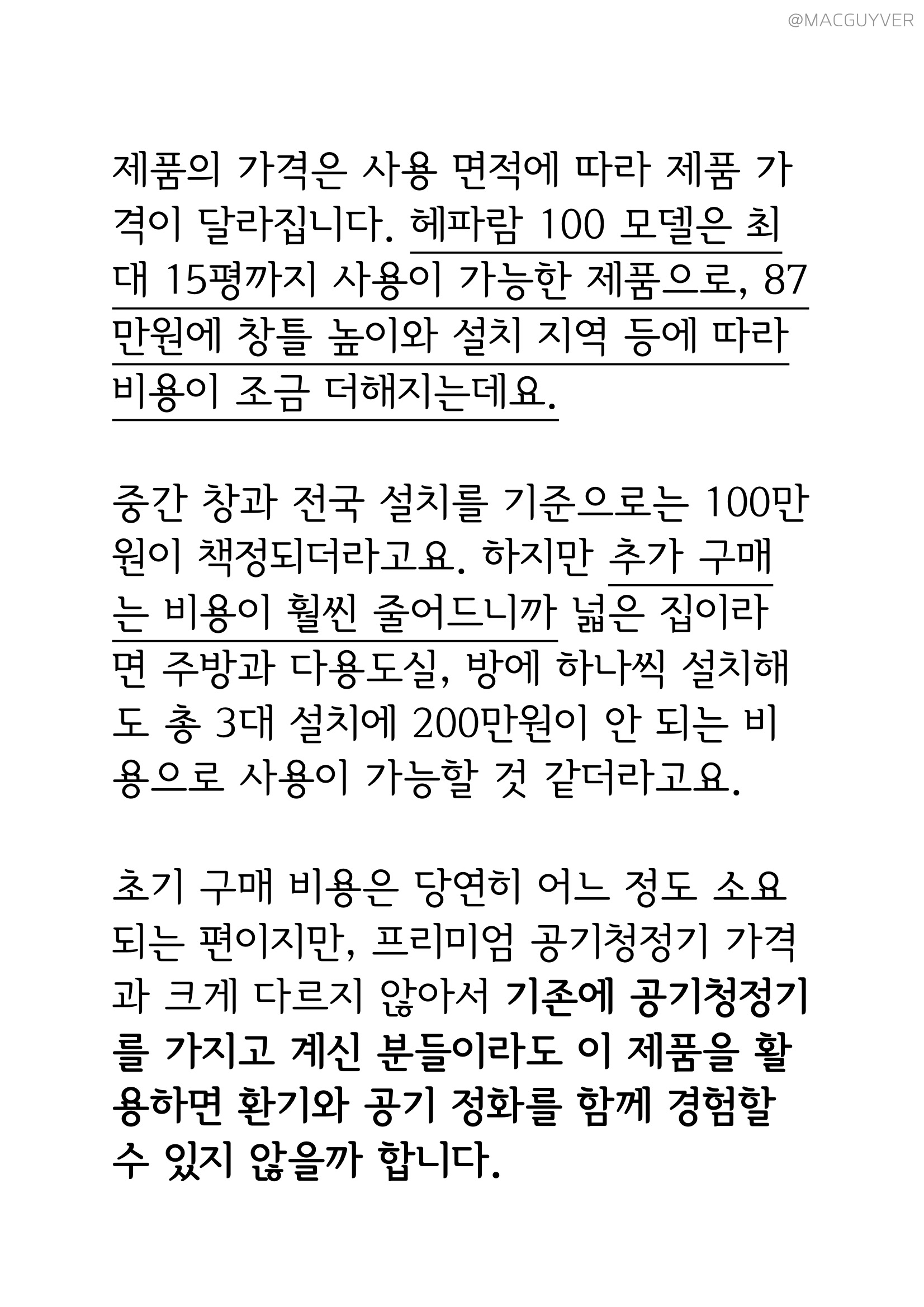 청소할 때도 일반적인 환기를 하게 되면 먼지가 앉거나 꽃가루 때문에 불편한 경우도 많지만 그러한 불편함이 없다는 점도 장점이 되어줬습니다. 헤파람 공기청정기 제품의 가격은 사용 면적에 따라 제품 가격이 달라집니다. 헤파람 공기청정기 100 모델은 최대 15평까지 사용이 가능한 제품으로, 87만원에 창틀 높이와 설치 지역 등에 따라 비용이 조금 더해지는데요. 헤파람 외기 유입 청정기는 중간 창과 전국 설치를 기준으로는 100만원이 책정되더라고요. 하지만 헤파람 외기 유입 청정기의 추가 구매는 비용이 훨씬 줄어드니까 넓은 집이라면 주방과 다용도실, 방에 하나씩 설치해도 총 3대 설치에 200만원이 안 되는 비용으로 사용이 가능할 것 같더라고요. 헤파람 초기 구매 비용은 당연히 어느 정도 소요되는 편이지만, 프리미엄 공기청정기 가격과 크게 다르지 않아서 기존에 공기청정기를 가지고 계신 분들이라도 이 제품을 활용하면 환기와 공기 정화를 함께 경험할 수 있지 않을까 합니다.
