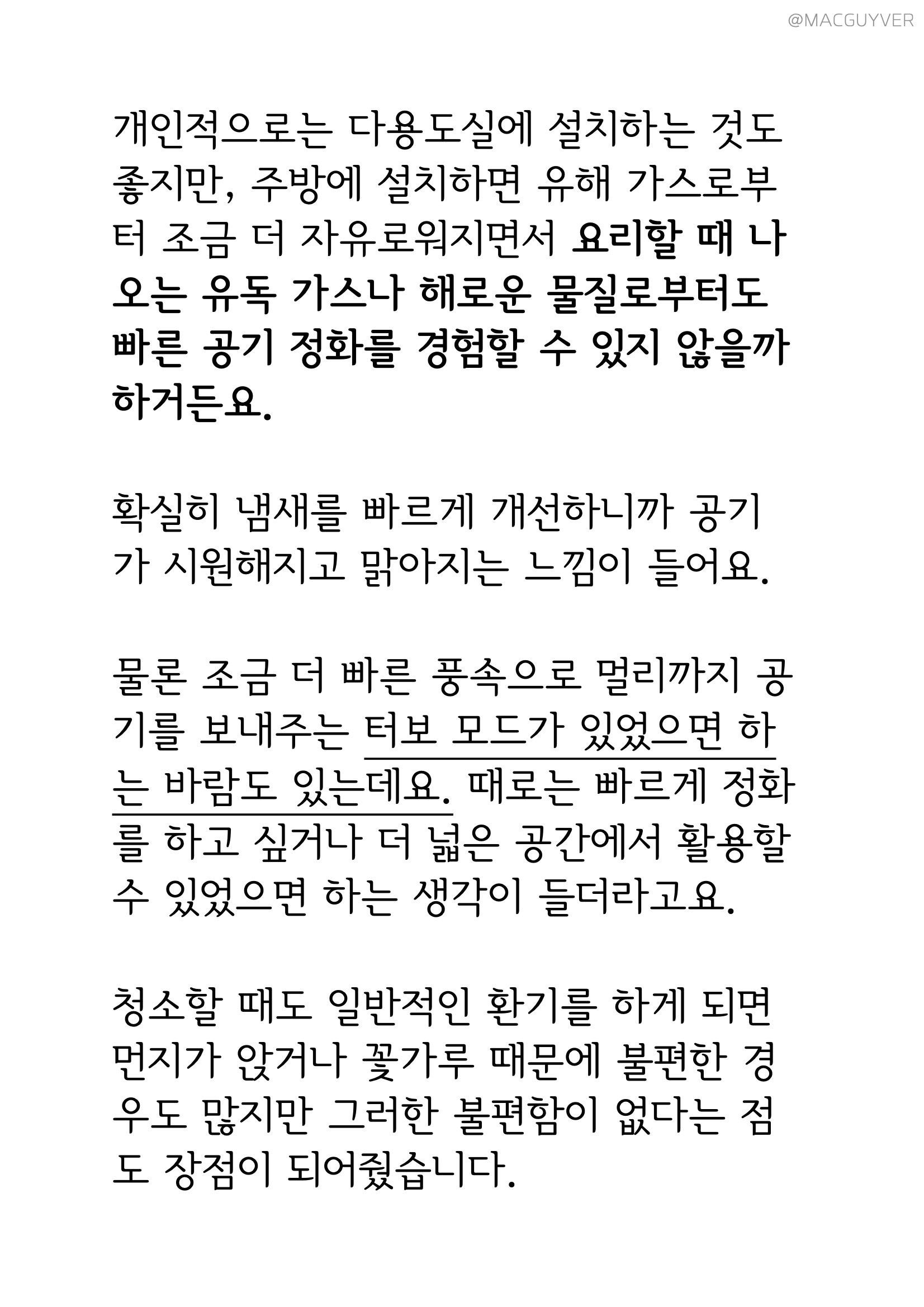 개인적으로는 공기청정기 다용도실에 설치하는 것도 좋지만, 주방에 설치하면 유해 가스로부터 조금 더 자유로워지면서 요리할 때 나오는 유독 가스나 해로운 물질로부터도 빠른 공기 정화를 경험할 수 있지 않을까 하거든요. 확실히 헤파람 공기청정기가 냄새를 빠르게 개선해 주니까 머리가 시원해지고 맑아지는 느낌이 드는 거죠. 물론 헤파람 외기 유입 청정기에 조금 더 빠른 풍속으로 멀리까지 공기를 보내주는 터보 모드가 있었으면 하는 바람도 있는데요. 때로는 빠르게 정화를 하고 싶거나 더 넓은 공간에서 활용할 수 있었으면 하는 생각이 들더라고요.
