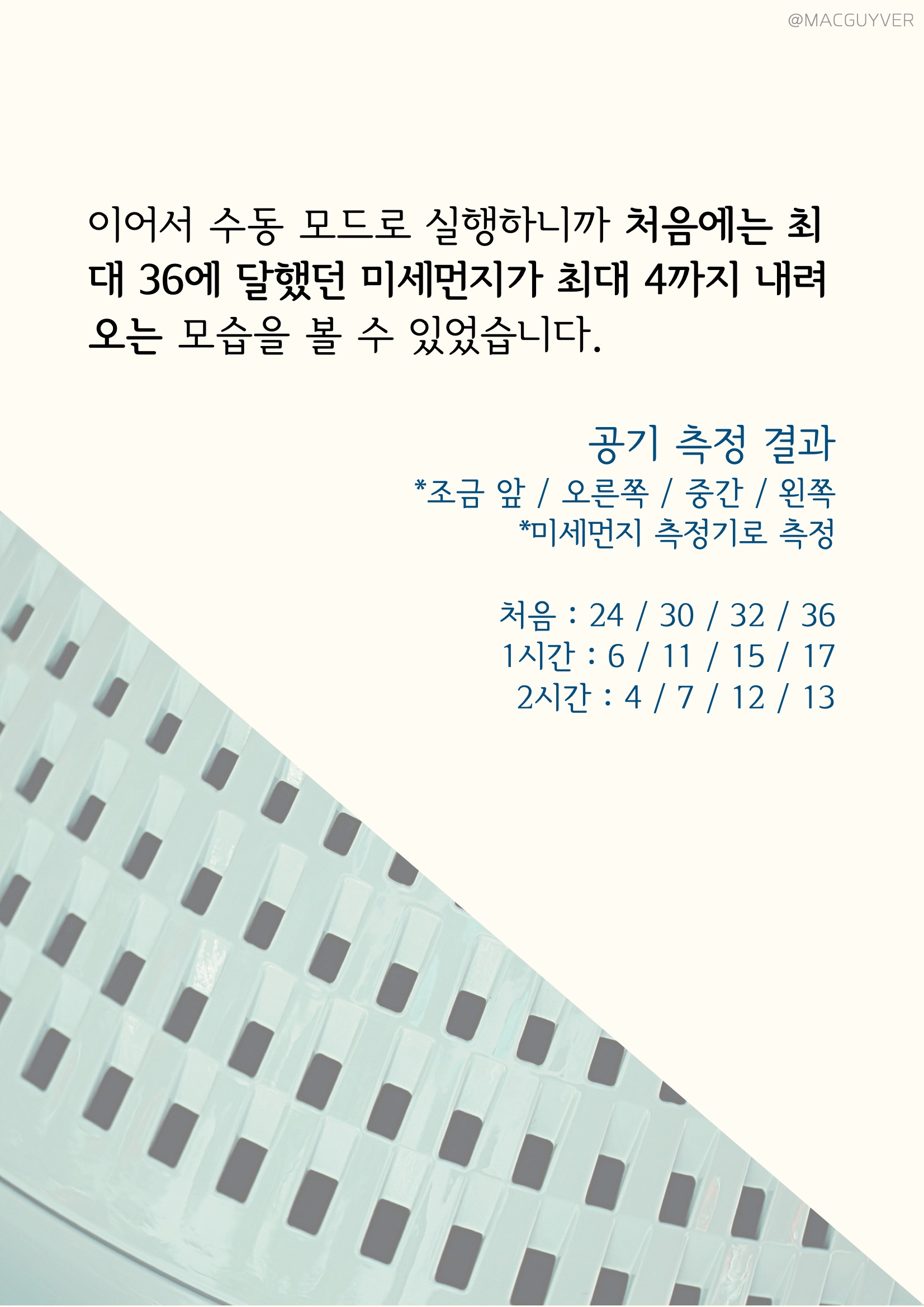 환기청정기, 공기청정기 추천 다양한 공기질 실험을 해봤는데요. 환기청정기 자동 모드로 실행하니까 처음에는 최대 51까지 올라갔던 초미세먼지와 미세먼지 수치는 작동 30분 이후에는 최대 22 정도로 내려갔고, 1시간 이후에는 최대 20까지, 2시간 뒤에는 최대 6까지 내려가더라고요. 공기질 공기 측정 처음 : 19 / 49 / 22 / 51 30분 : 14 / 15 / 16 / 22 60분 : 10 / 20 / 11 / 13 120분 : 7 / 11 / 6 / 10 *공기청정기 추천 미세먼지 측정기로 측정 *공기청정기 추천 조금 앞 / 오른쪽 / 중간 / 왼쪽 측정치 이어서 수동 모드로 실행하니까 처음에는 최대 36에 달했던 미세먼지가 최대 4까지 내려오는 모습을 볼 수 있었습니다. 공기질 공기 측정 처음 : 24 / 30 / 32 / 36 1시간 : 6 / 11 / 15 / 17 2시간 : 4 / 7 / 12 / 13 *공기청정기 추천 미세먼지 측정기로 측정 *공기청정기 추천 조금 앞 / 오른쪽 / 중간 / 왼쪽 측정치 확실히 미세먼지와 초미세먼지 수치가 크게 떨어지면서 외부 공기를 실내로 보내주면서도 공기 오염이 아니라 깨끗하게 걸러진 공기라서 안심이 되기도 한 거죠.