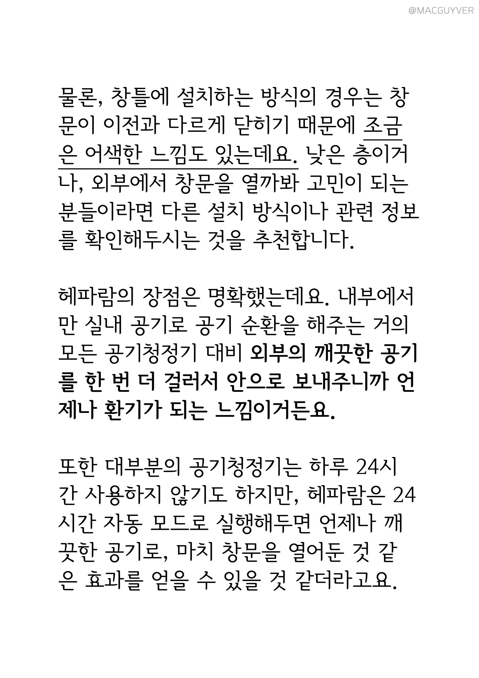 사용해보니까 헤파람의 장점은 명확했는데요. 내부에서만 실내 공기로 공기 순환을 해주는 거의 모든 공기청정기 대비 외부의 깨끗한 공기를 한 번 더 걸러서 안으로 보내주니까 언제나 환기가 되는 느낌이거든요. 또한 대부분의 공기청정기는 하루 24시간 사용하지 않기도 하지만, 헤파람은 24시간 자동 모드로 실행해두면 언제나 깨끗한 공기로, 마치 창문을 열어둔 것 같은 효과를 얻을 수 있을 것 같더라고요. 참고로 당연히 헤파람 공기청정기에 케이블 연결이 필요하기 때문에 어댑터가 있는지 확인이 필요하기도 하고, 공기질이 나쁘다면 밤중에도 빠르게 돌아가서 약간의 존재감이 있기도 합니다.