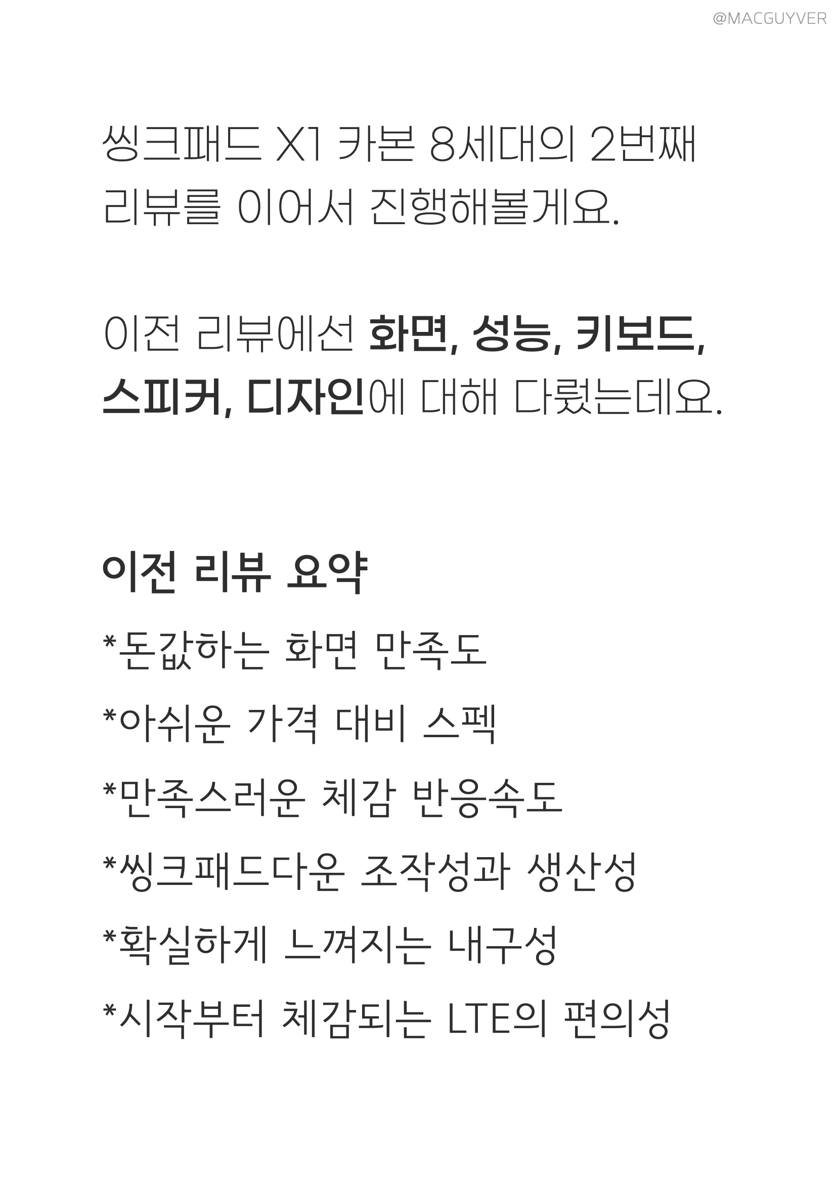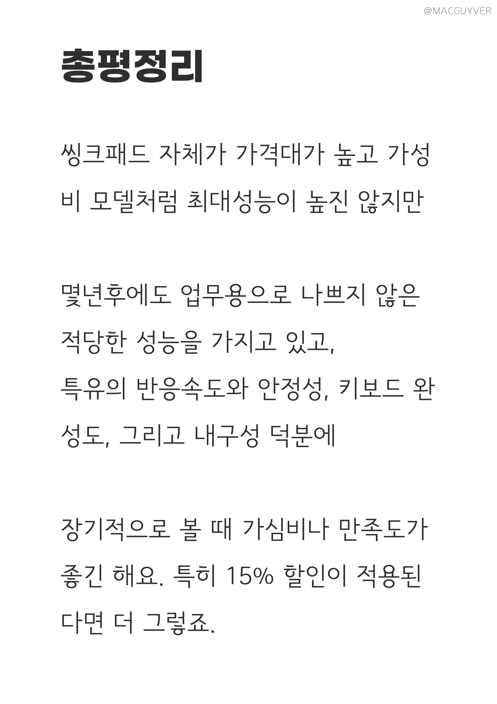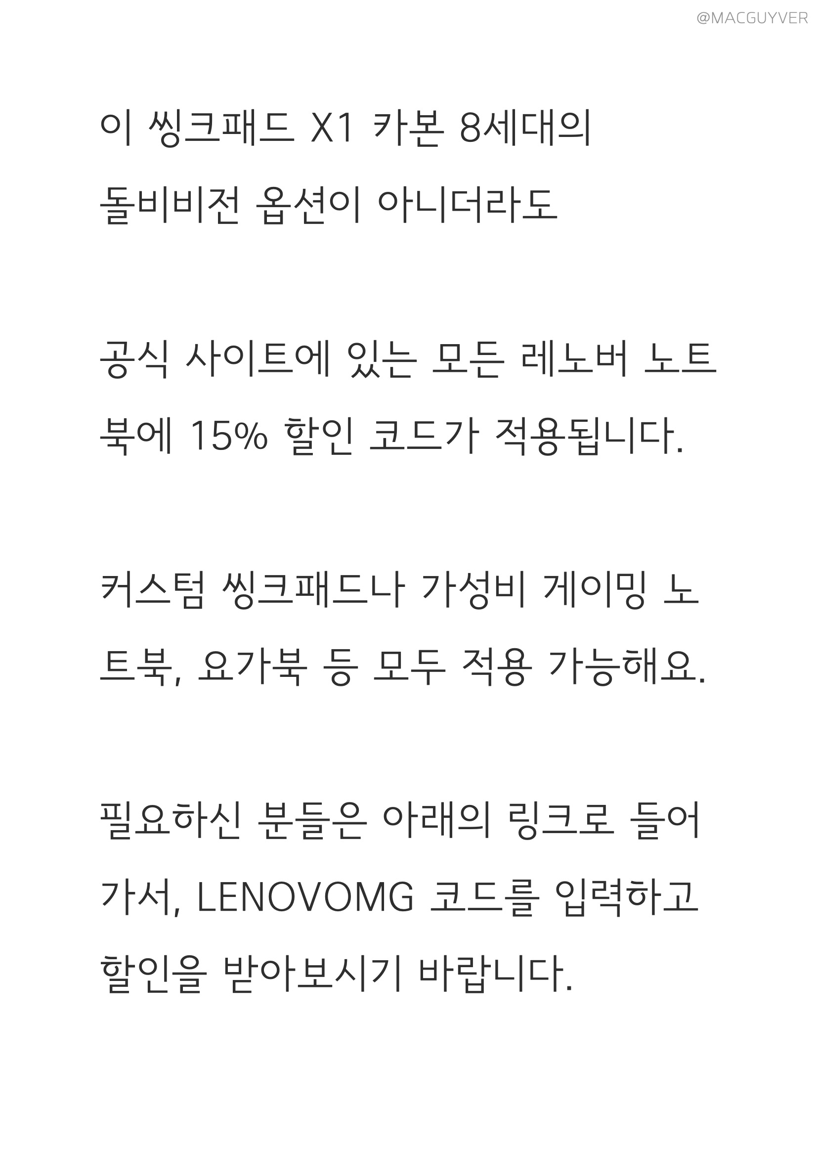 총평정리 씽크패드 자체가 가격대가 높고 가성비 모델처럼 최대성능이 높진 않지만 몇년후에도 업무용으로 나쁘지 않은 적당한 성능을 가지고 있고, 특유의 반응속도와 안정성, 키보드 완성도, 그리고 내구성 덕분에 장기적으로 볼 때 가심비나 만족도가 좋긴 해요. 특히 15% 할인이 적용된다면 더 그렇죠. 그리고 디스플레이 추가 옵션은 야외작업이 많으신 분들, 확장 모니터 보단 노트북 단독으로 사용할 일이 많으신 분들이라면 생각해볼만 합니다. LTE는 전적으로 개인 취향이고요. 이 두 옵션의 확실한 장점은 마치 스마트폰처럼 (물론 폰만큼 편한 건 아니지만) 야외에서 사용할 때 스트레스 받을 일을 줄여준다는 점인데요. 이 씽크패드 X1 카본 8세대의 돌비비전 옵션이 아니더라도 공식 사이트에 있는 모든 레노버 노트북에 15% 할인 코드가 적용됩니다. 커스텀 씽크패드나 가성비 게이밍 노트북, 요가북 등 모두 적용 가능해요. 필요하신 분들은 아래의 링크로 들어가서, LENOVOMG 코드를 입력하고 할인을 받아보시기 바랍니다. MACGUYVER 15% 할인 쿠폰 코드: LENOVOMG - 모든 레노버 노트북에 15% 할인이 적용됩니다 ex)기존 300만원 -> 255만원 *다른 할인코드와 중복되진 않습니다. *장바구니에서 노트북 선택 후 할인 코드를 입력하실 수 있습니다.