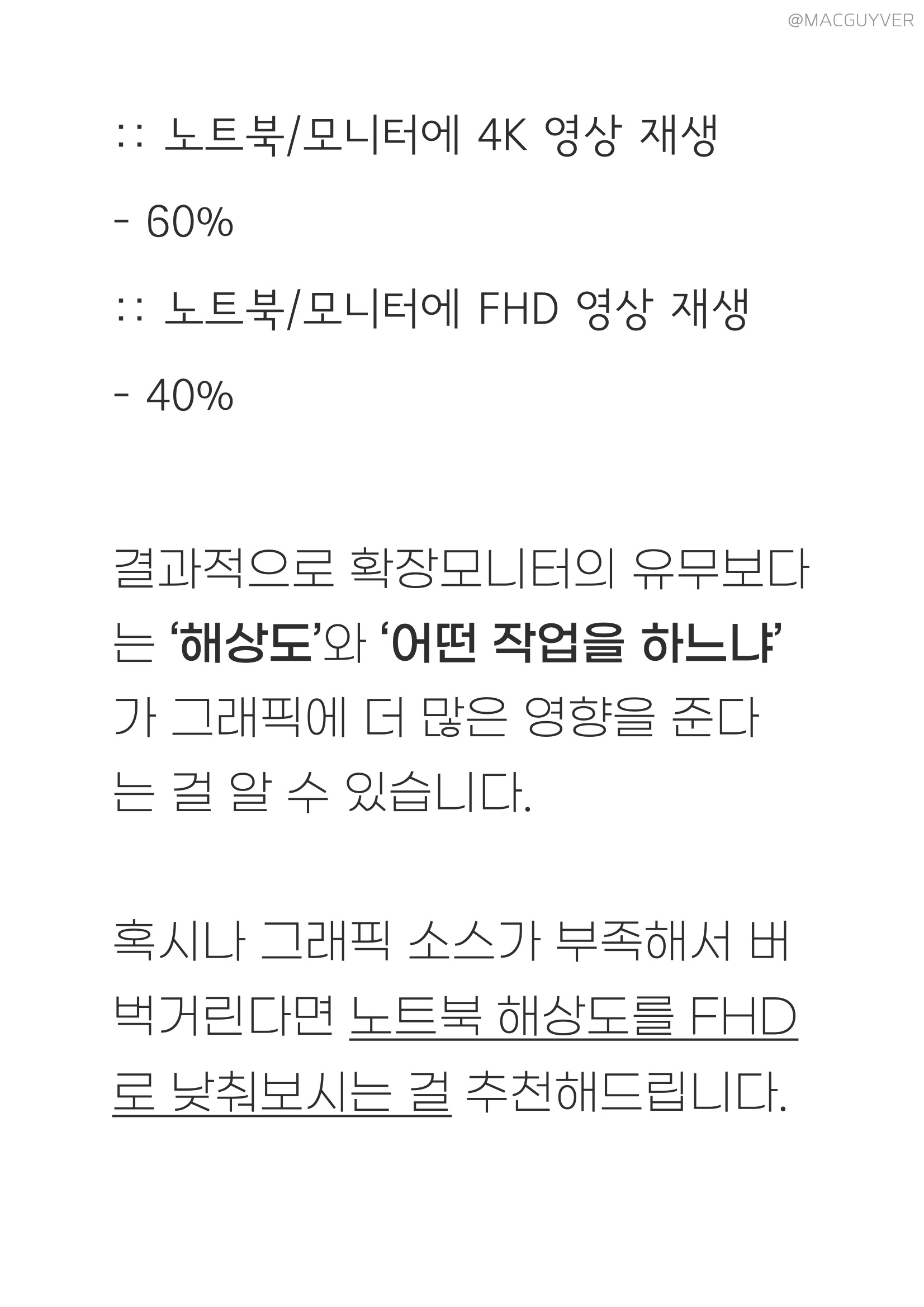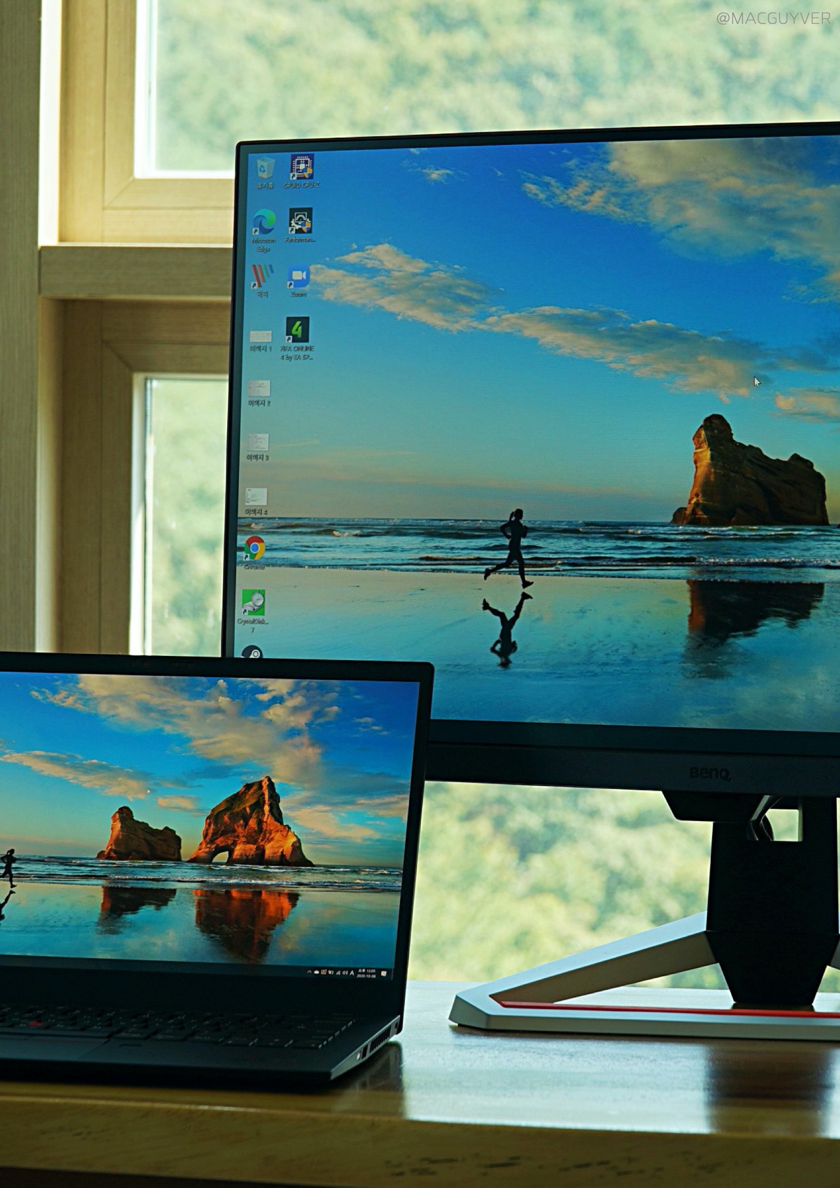 모니터 확장 ‘노트북 내장그래픽으로 확장 모니터 연결이 가능한가’ 하고 궁금해하시는 분들도 계신데요. PCMARK10 단독 사용 :: 3998점 모니터 화면 복제 :: 4102점 우선 PC마크 결과로는 FHD 모니터를 하나 추가해도 씽크패드의 업무 퍼포먼스에는 차이가 없었습니다. 하지만 화면에 변화가 클수록 GPU 사용량이 크기 때문에 영상을 보면 다를 수 있는데요. GPU 사용량 변화 *노트북 4K / 모니터 FHD // 화면 확장 :: 노트북에 4K 영상 재생 - 55% :: 노트북에 FHD 영상 재생 - 35% :: 모니터에 4K 영상 재생 - 25% :: 모니터에 FHD 영상 재생 - 25% :: 노트북/모니터에 4K 영상 재생 - 60% :: 노트북/모니터에 FHD 영상 재생 - 40% 결과적으로 확장모니터의 유무보다는 ‘해상도’와 ‘어떤 작업을 하느냐’가 그래픽에 더 많은 영향을 준다는 걸 알 수 있습니다. 혹시나 그래픽 소스가 부족해서 버벅거린다면 이 씽크패드 노트북 해상도를 FHD로 낮춰보시는 걸 추천해드립니다. 참고로 배터리 소모량은 모니터 자체에 전원선이 있으니까 차이가 거의 없는 수준이고, 확장모니터를 연결한 상태로 노트북에 4K 영상을 재생하니까 팬소음이 나기 시작했습니다. *팬소음은 전반적으로 조용한 편입니다.