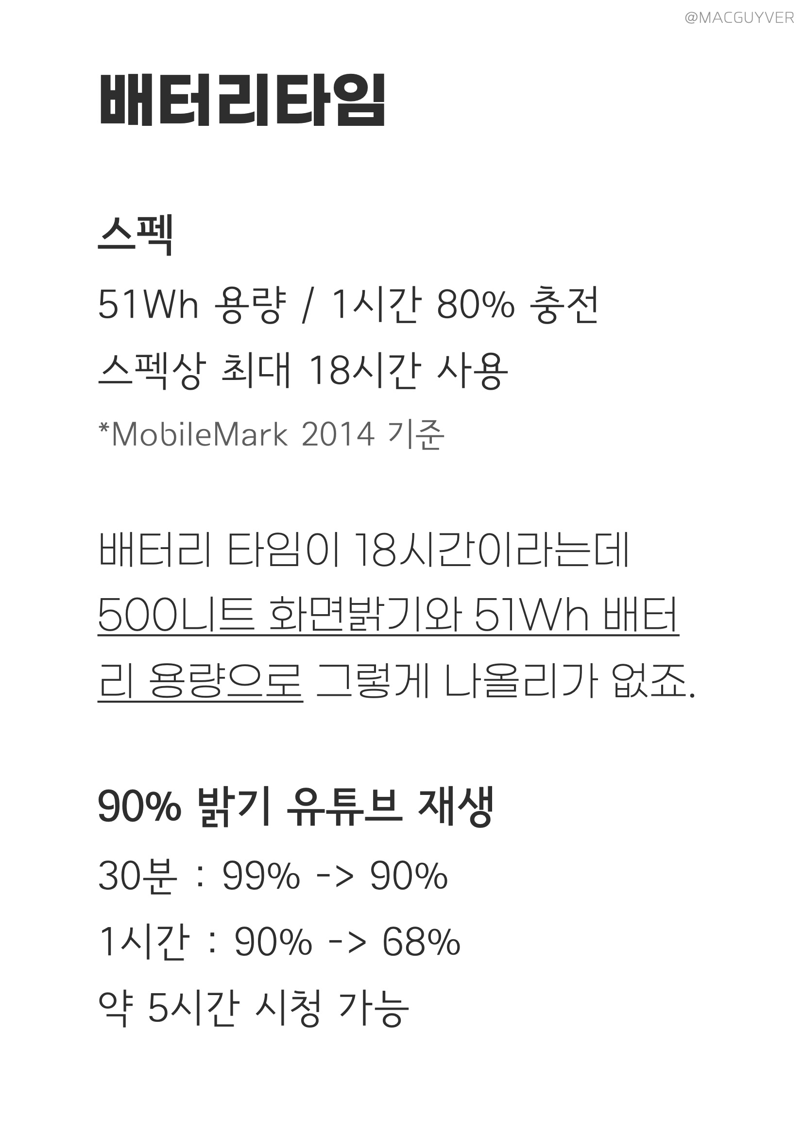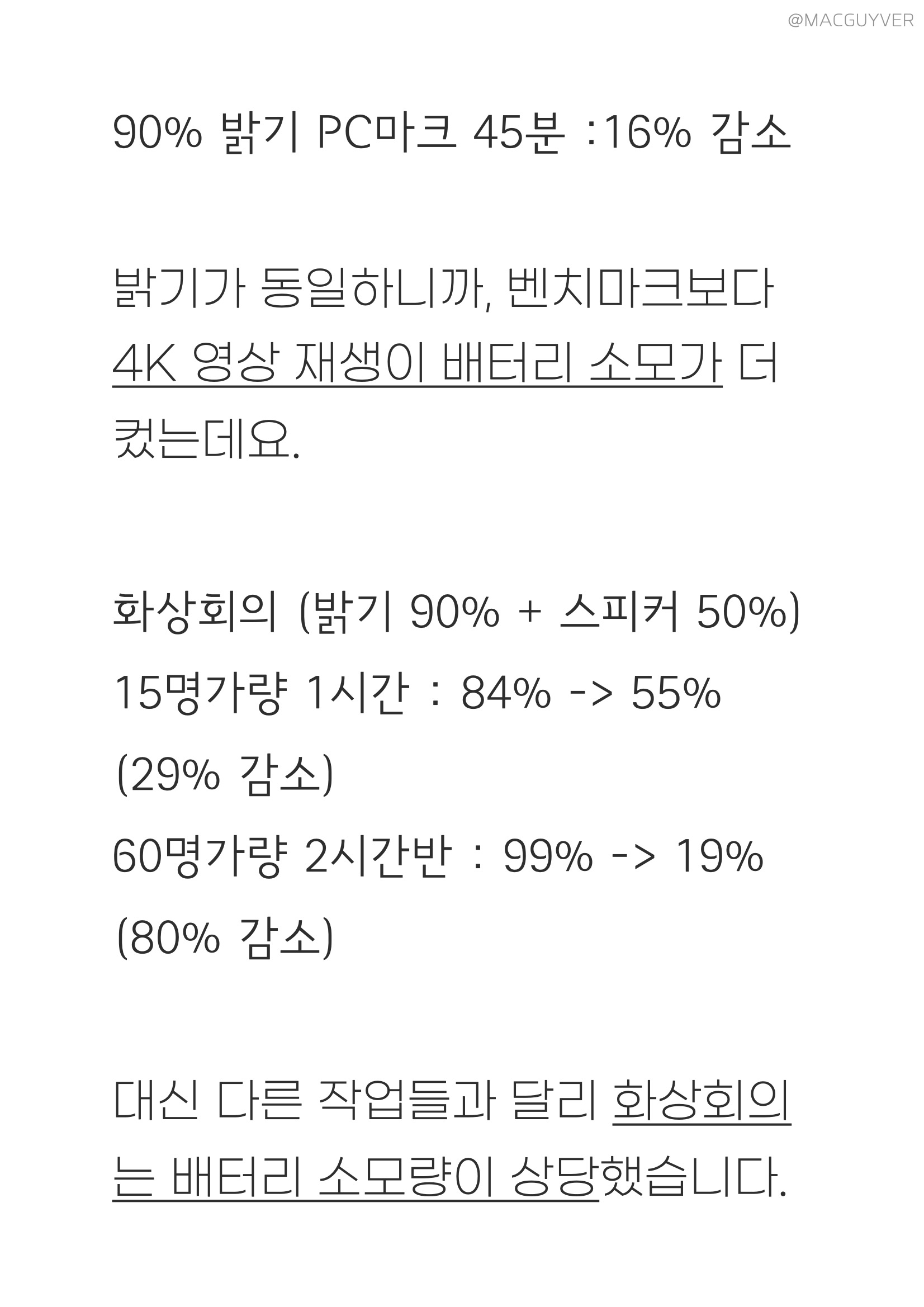 배터리타임 스펙 51Wh 용량 / 1시간 80% 충전 스펙상 최대 18시간 사용 *MobileMark 2014 기준 배터리 타임이 18시간이라는데 500니트 화면밝기와 51Wh 배터리 용량으로 그렇게 나올리가 없죠. 90% 밝기 유튜브 재생 30분 : 99% -> 90% 1시간 : 90% -> 68% 약 5시간 시청 가능 90%면 430니트 수준이라 일반 노트북 최대 밝기보단 밝은데요. 90% 밝기 1시간 재생 (+30% 이어폰) : 26% 감소 밝기 50% 1시간 재생 (+30% 이어폰) : 17% 감소 화면 밝기에 따른 배터리 감소량 차이가 상당했습니다. 90% 밝기 PC마크 45분 :16% 감소 밝기가 동일하니까, 벤치마크보다 4K 영상 재생이 배터리 소모가 더 컸는데요. 화상회의 (밝기 90% + 스피커 50%) 15명가량 1시간 : 84% -> 55% (29% 감소) 60명가량 2시간반 : 99% -> 19% (80% 감소) 대신 다른 작업들과 달리 화상회의는 배터리 소모량이 상당했습니다. 일반적인 작업을 할 때 이 비즈니스 노트북으로 5시간 정도 사용할 수 있었습니다. 올데이로 쓰기엔 무리가 있죠. 대신 충전 속도는 되게 빨랐어요. 30분 충전 : 50% -> 77% 55분 충전 : 5% -> 76% 이 직장인 노트북은 배터리 잔량에 따라 30분에 50%까지 충전할 수 있었거든요. * 두 썬더볼트 포트 모두 PD 충전을 지원하고 올웨이즈 온 충전은 하나만 가능합니다.