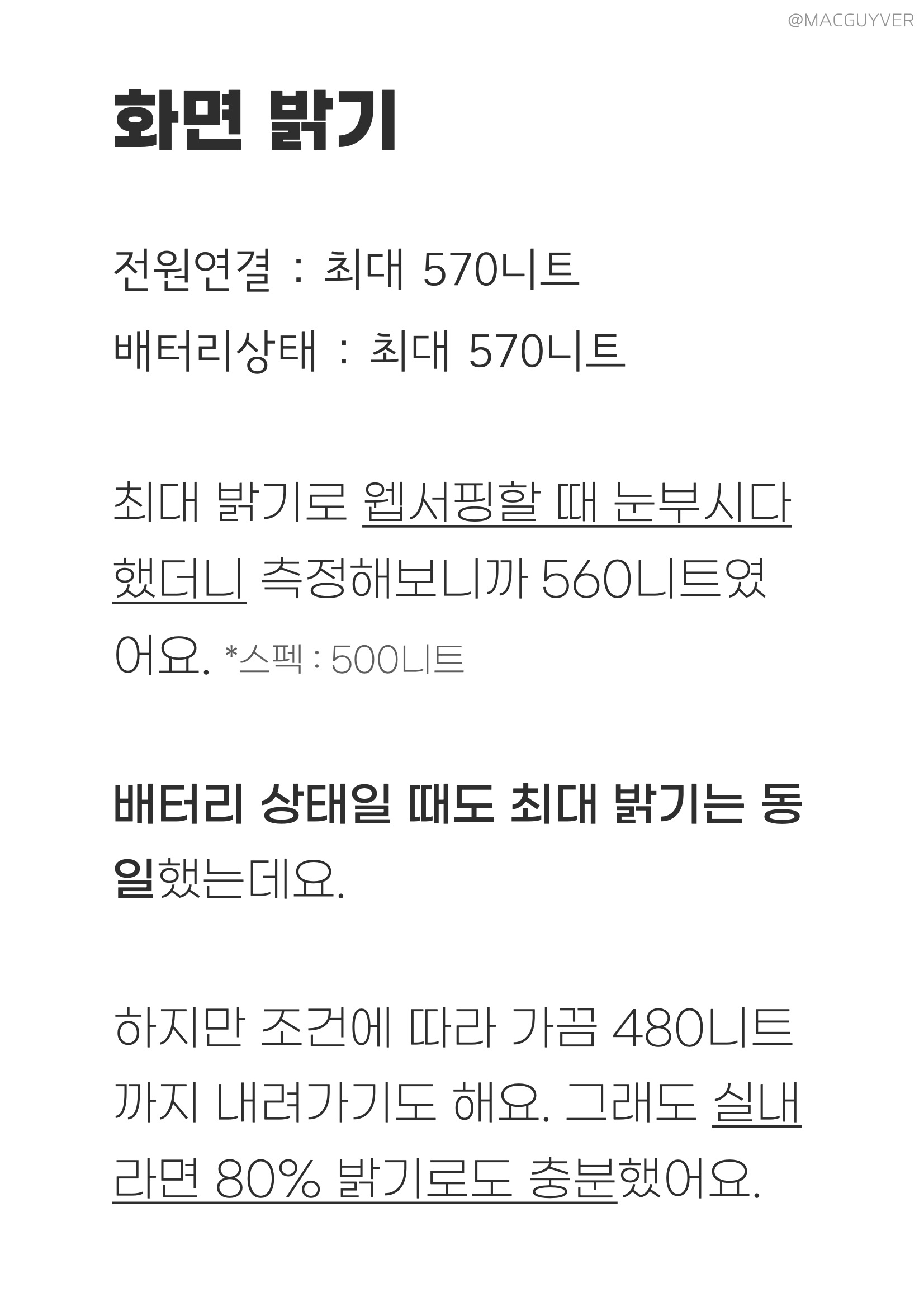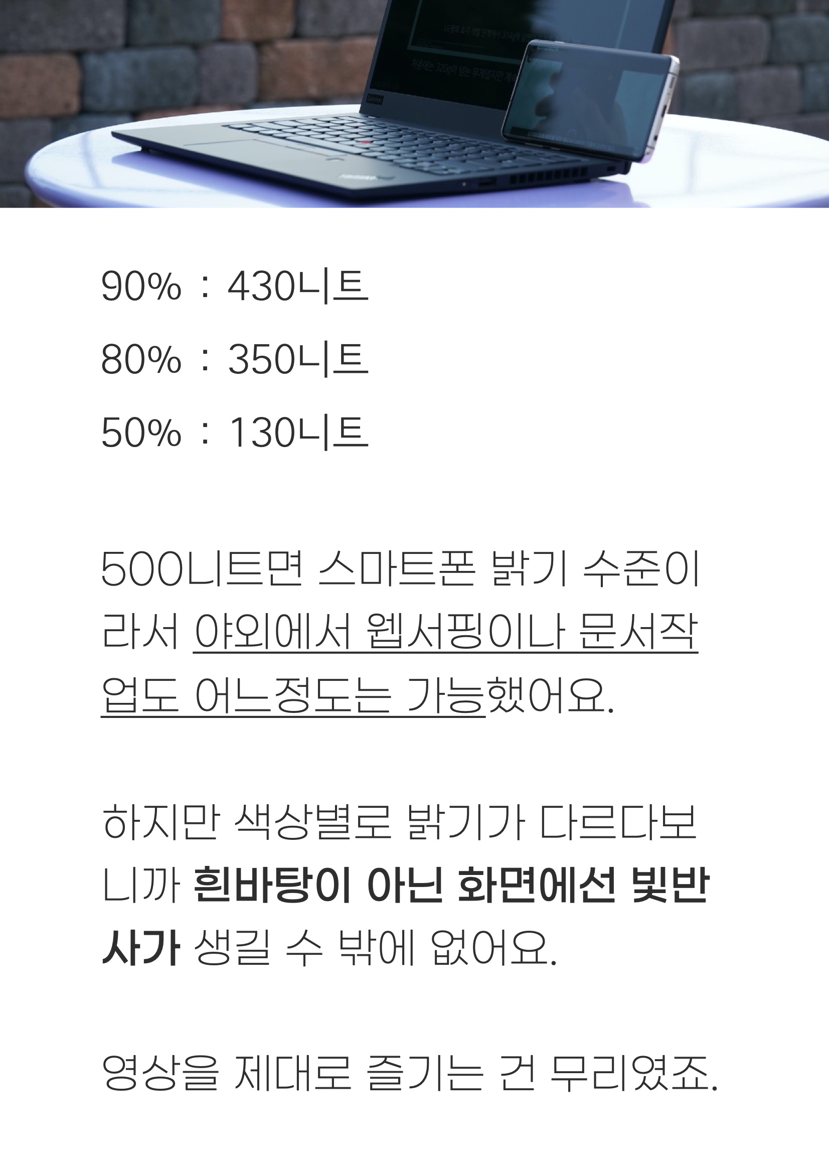 화면 밝기 전원연결 : 최대 570니트 배터리상태 : 최대 570니트 최대 밝기로 웹서핑할 때 눈부시다 했더니 측정해보니까 560니트였어요. *스펙 : 500니트 배터리 상태일 때도 이 직장인 노트북의 최대 밝기는 동일했는데요. 하지만 조건에 따라 가끔 480니트까지 내려가기도 해요. 그래도 실내라면 80% 밝기로도 충분했어요. 90% : 430니트 80% : 350니트 50% : 130니트 500니트면 스마트폰 밝기 수준이라서 야외에서 웹서핑이나 문서작업도 어느정도는 가능했어요. 직장인 노트북으로 추천할만한 이유죠. 하지만 색상별로 밝기가 다르다보니까 흰바탕이 아닌 화면에선 빛반사가 생길 수 밖에 없어요. 영상을 제대로 즐기는 건 무리였죠. 확실히 500니트는 야외 사용을 가능하게 해준다는 점에서 의미가 있었어요. 그리고 일반 확장 모니터랑 다르게 돌비비전을 지원해서 HDR 전용 영상을 볼 수 있다는 것도 확실한 장점이었는데요. 여러분이 ‘야외에서 작업을 종종 해야하고, 실내에서 HDR 영상을 보는 걸 즐긴다’면 27만원의 화면 옵션도 투자할만 할 겁니다. 하지만 ‘야외에서 영상을 보지 못하면 의미없고, 실내에서는 확장 모니터를 주로 사용한다’면 이 씽크패드 비즈니스 노트북의 기본 디스플레이 옵션도 충분할 것 같아요. *300 or 400 Nits