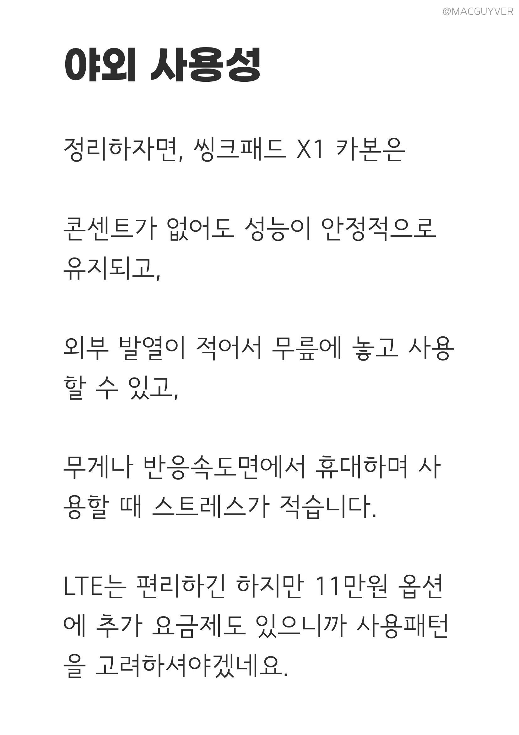야외 사용성 정리하자면, 씽크패드 X1 카본 직장인 노트북은 콘센트가 없어도 성능이 안정적으로 유지되고, 외부 발열이 적어서 무릎에 놓고 사용할 수 있고, 무게나 반응속도면에서 휴대하며 사용할 때 스트레스가 적습니다. LTE는 편리하긴 하지만 11만원 옵션에 추가 요금제도 있으니까 사용패턴을 고려하셔야겠네요.