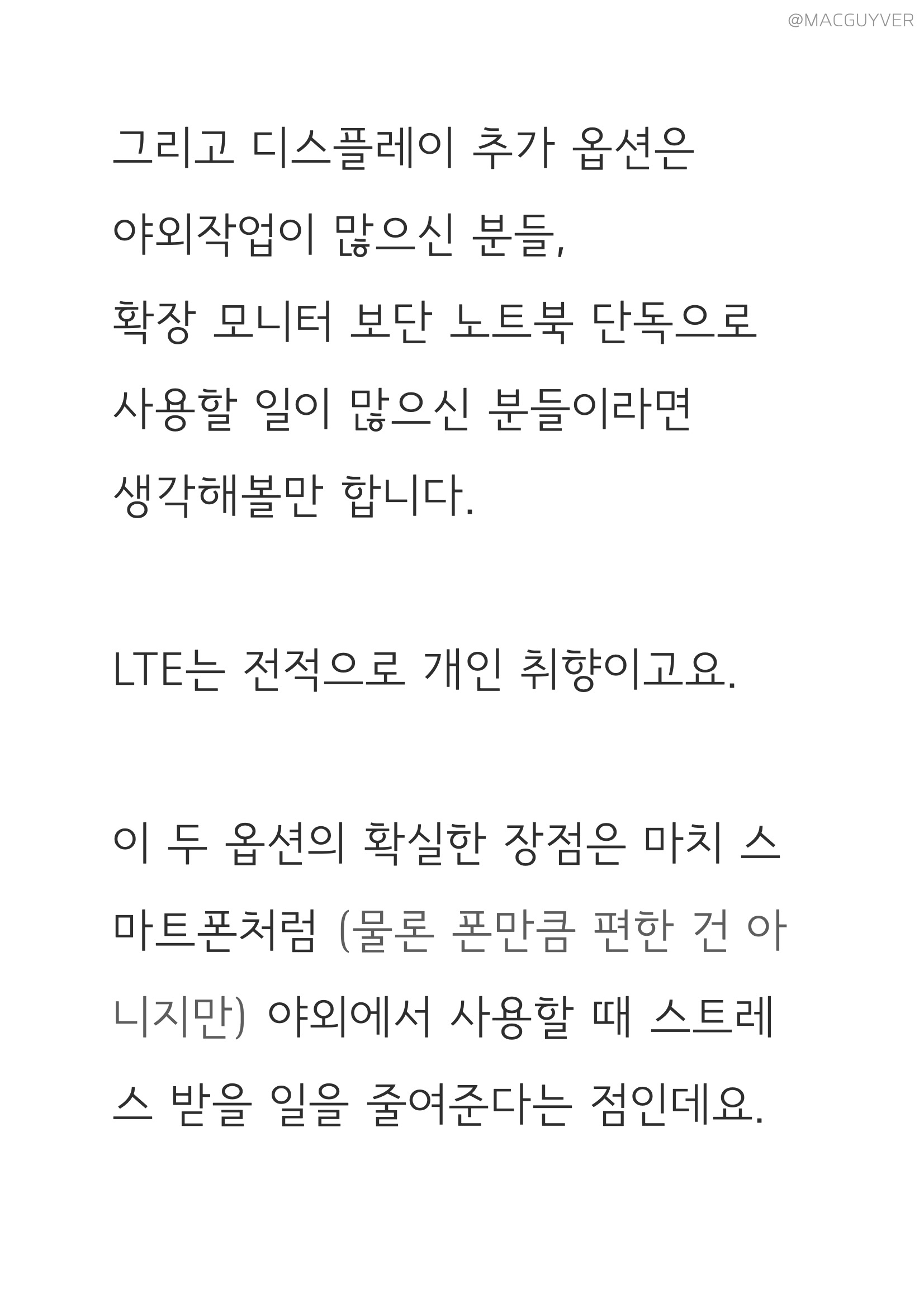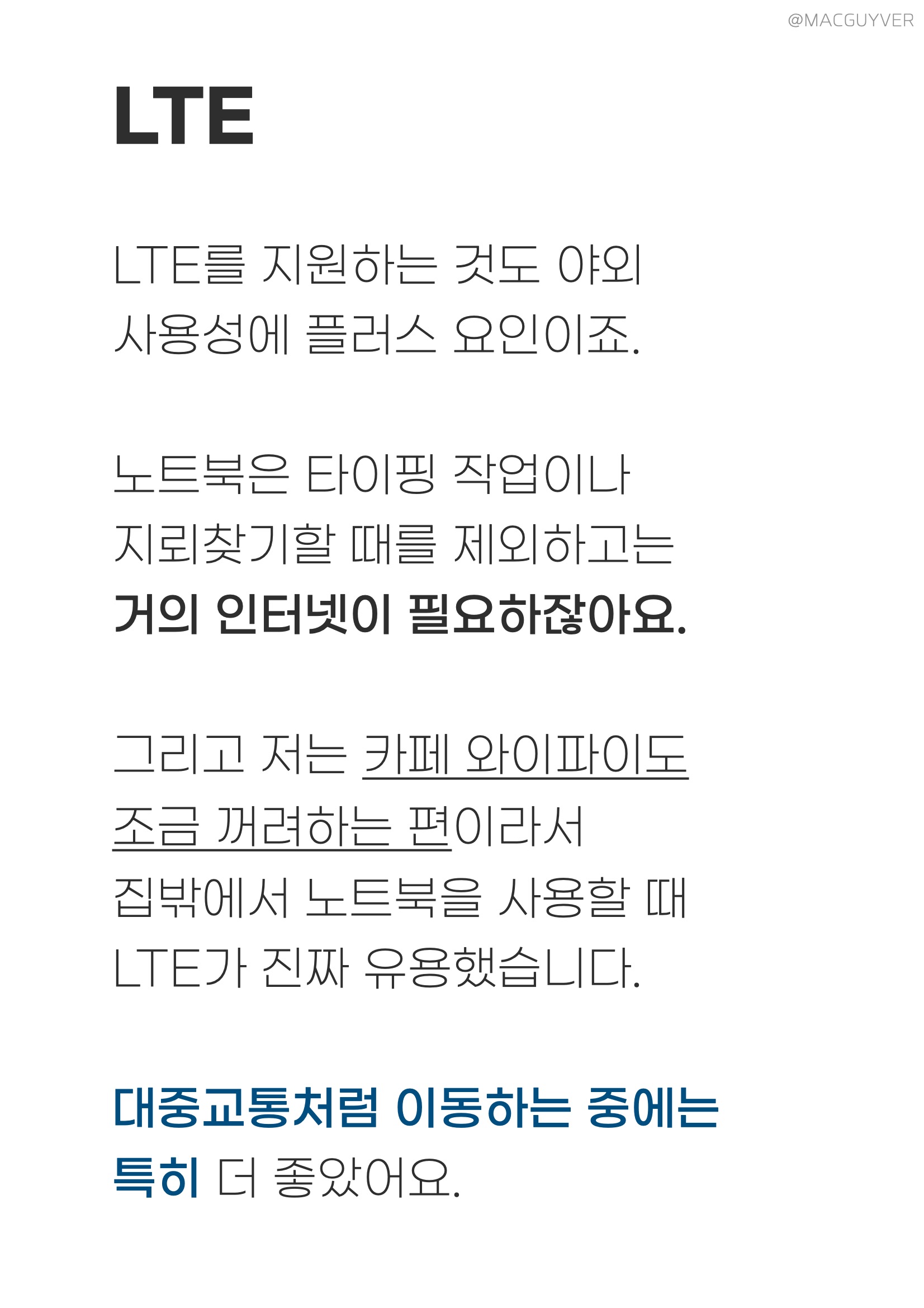 LTE LTE를 지원하는 것도 야외 사용성에 플러스 요인이죠. 노트북은 타이핑 작업이나 지뢰찾기할 때를 제외하고는 거의 인터넷이 필요하잖아요. 그리고 저는 카페 와이파이도 조금 꺼려하는 편이라서 집밖에서 노트북을 사용할 때 LTE가 진짜 유용했습니다. 대중교통처럼 이동하는 중에는 특히 더 좋았어요.