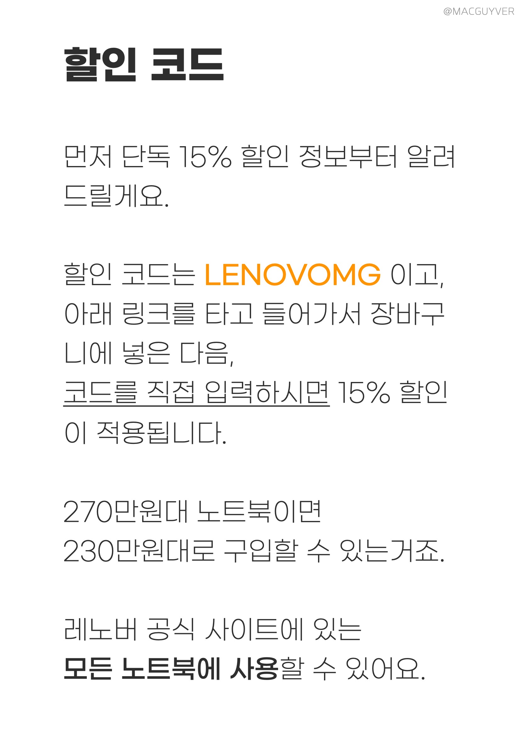 할인 코드 먼저 단독 15% 노트북 할인 정보부터 알려드릴게요. 할인 코드는 LENOVOMG 이고, 아래 링크를 타고 들어가서 장바구니에 넣은 다음, 코드를 직접 입력하시면 15% 노트북 할인이 적용됩니다. 270만원대 비즈니스 노트북이면 230만원대로 구입할 수 있는거죠. 레노버 공식 사이트에 있는 모든 노트북에 사용할 수 있어요.
