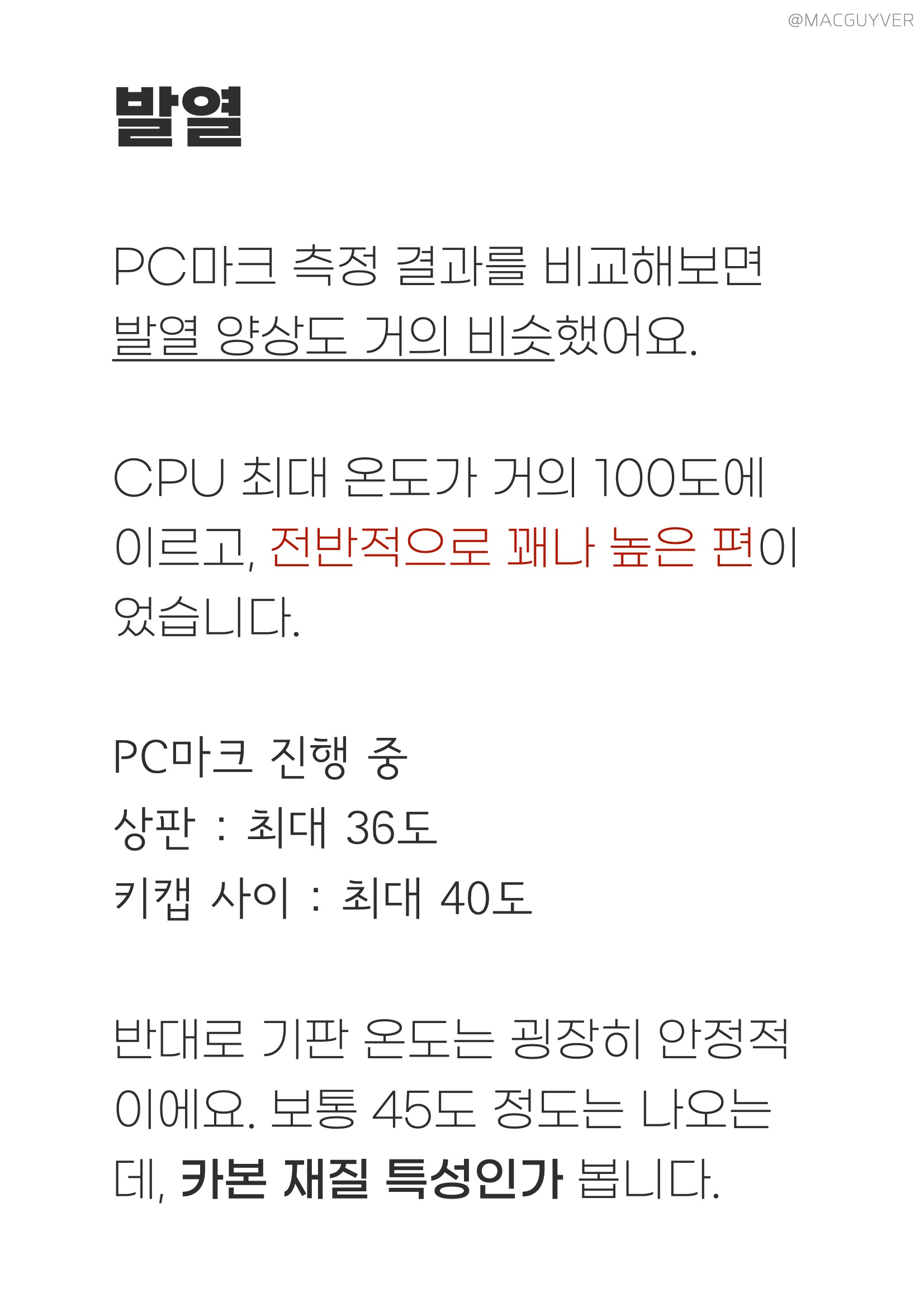 발열 PC마크 측정 결과를 비교해보면 발열 양상도 거의 비슷했어요. CPU 최대 온도가 거의 100도에 이르고, 전반적으로 꽤나 높은 편이었습니다. PC마크 진행 중 상판 : 최대 36도 키캡 사이 : 최대 40도 반대로 이 씽크패드 직장인 노트북의 기판 온도는 굉장히 안정적이에요. 보통 45도 정도는 나오는데, 카본 재질 특성인가 봅니다.