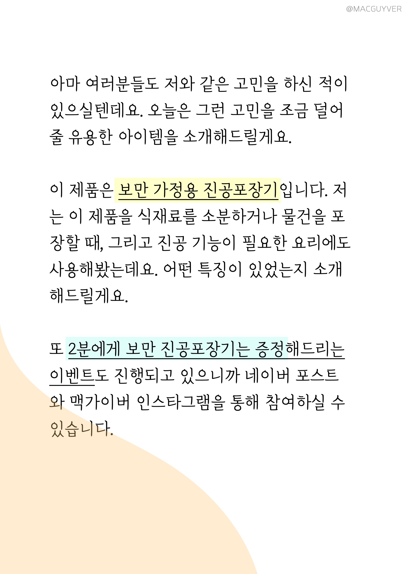#.평가 제가 사용해본 보만 진공 포장기에는 이런 장점이 있었어요. 첫 번째로 재료가 신선하게 유지된다는 점에서 가장 안심이 되었어요. 두 번째로 식품 포장기계로 포장해서 신선한 상태로 보관 기간을 늘릴 수 있으니까 버려지는 식재료가 줄어들었다는 점이죠. 세 번째로 보만 포장기를 사용하면 비닐에 2중, 3중으로 싸지 않아도 되니까 버려지는 비닐의 양도 줄었고, 또 어떤 재료인지 바로 확인이 가능했어요. 진공 포장기를 쓰기 전에는 주방 필수품으로 느껴지지 않았는데, 쓰면 쓸수록 유용한 아이템이었어요. 사실 진공포장기를 사용하기 전에는 식품 포장기계는 식구 수가 적은 집에는 필요가 없다고만 생각했는데, 오히려 재료를 나누어 사용할 일이 많으니까 더 많이 사용하게 되는 제품이었거든요. 건강과 위생을 중요하게 여기는 요즘, 꼭 필요한 아이템이 보만 진공포장기 아닐까요? 보만 진공 포장기 대한 더 자세한 정보는 아래 링크를 통해 보실 수 있습니다.