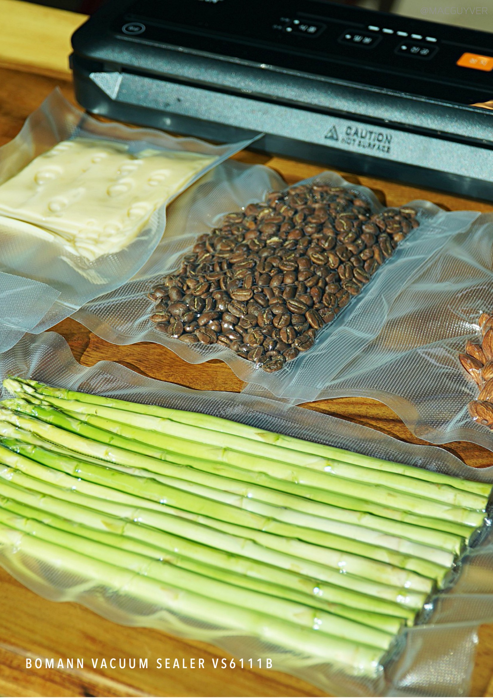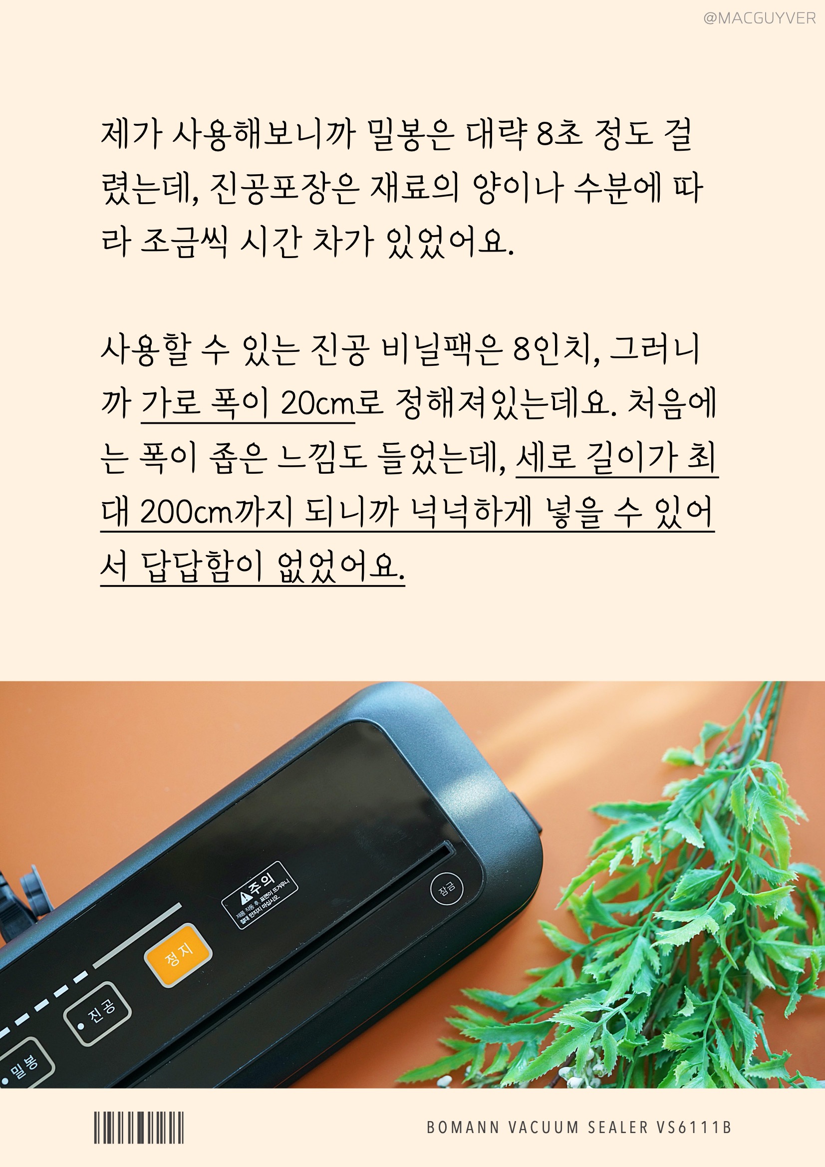 #.보만 가정용 진공포장기의 사용방법은 간단해요. 먼저 식품 포장기계 진공팩을 필요한 크기만큼 잘라서 한 쪽을 밀봉해 줘야 하는데요. 가위나 칼을 찾지 않으셔도 돼요. 보만 실링기 버튼 아래에 커팅칼이 있으니까 자르기 원하는 위치에 놓고, 이렇게 반대쪽으로 옮겨주면 돼요. 비닐팩이 말린 방향으로 비닐의 끝부분이 물받이 홈의 중간 정도에 위치하도록 넣어주세요. 팩을 놓을 때 구겨지지 않도록 바르게 펴주면 빈틈 없이 밀봉이 잘 돼요. 이렇게 놓고 딸깍 뚜껑이 소리가 나도록 닫은 다음 밀봉 버튼을 누르고 표시 등이 꺼지면 양쪽의 고정 버튼을 풀어 꺼내주면 됩니다. 이제 재료를 넣고, 보만 포장기의 밀봉이나 진공을 기능을 사용하시면 되는데요. 진공 기능을 사용하실 경우 재료의 상태에 따라 식품의 유형을 수분 또는 건조로 먼저 선택하시면 됩니다. 제가 보만 포장기를 사용해보니까 밀봉은 대략 8초 정도 걸렸는데, 진공포장은 재료의 양이나 수분에 따라 조금씩 시간 차가 있었어요. 사용할 수 있는 식품 포장기계 진공 비닐팩은 8인치, 그러니까 가로 폭이 20cm로 정해져있는데요. 처음에는 폭이 좁은 느낌도 들었는데, 세로 길이가 최대 200cm까지 되니까 넉넉하게 넣을 수 있어서 답답함이 없었어요.
