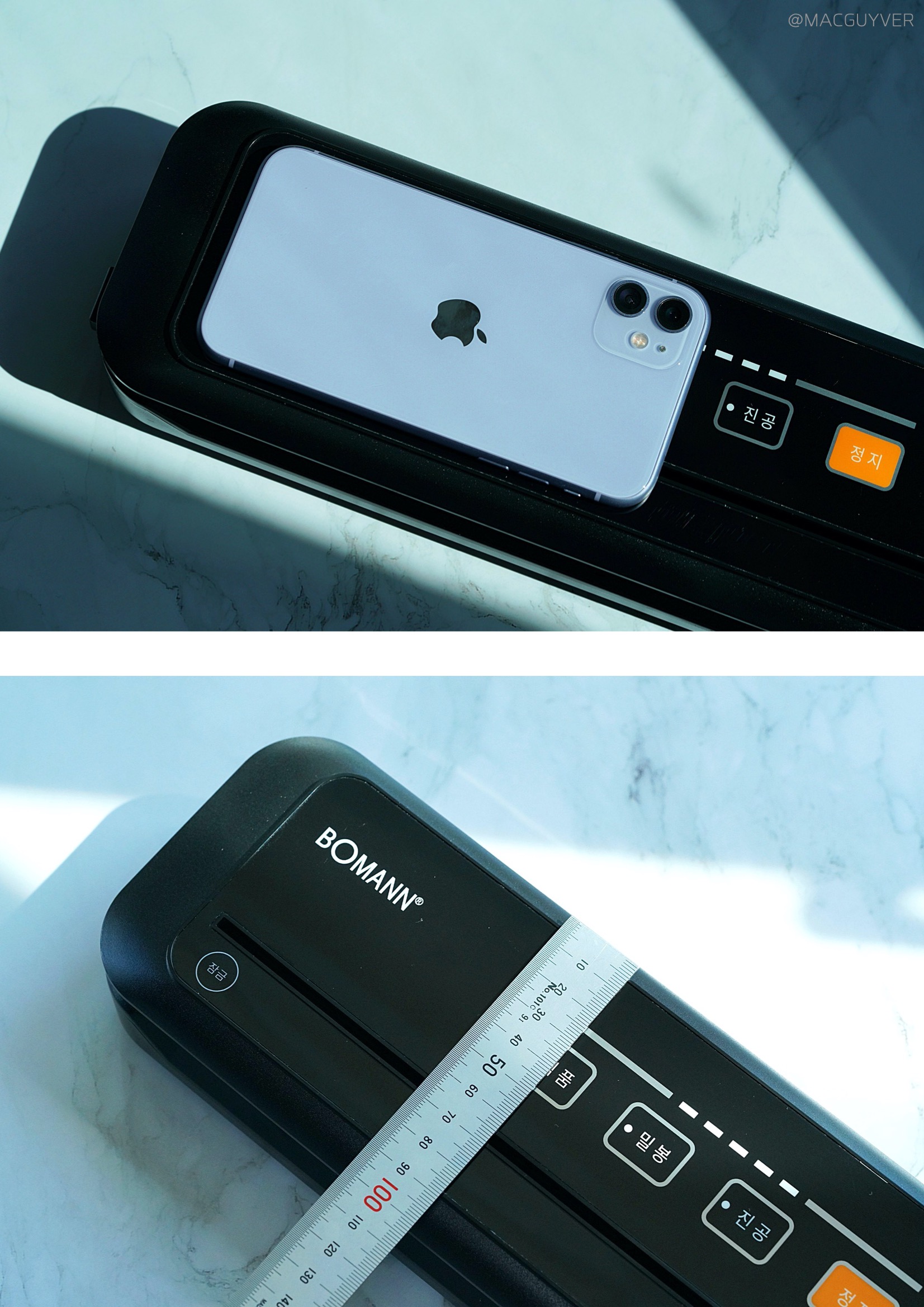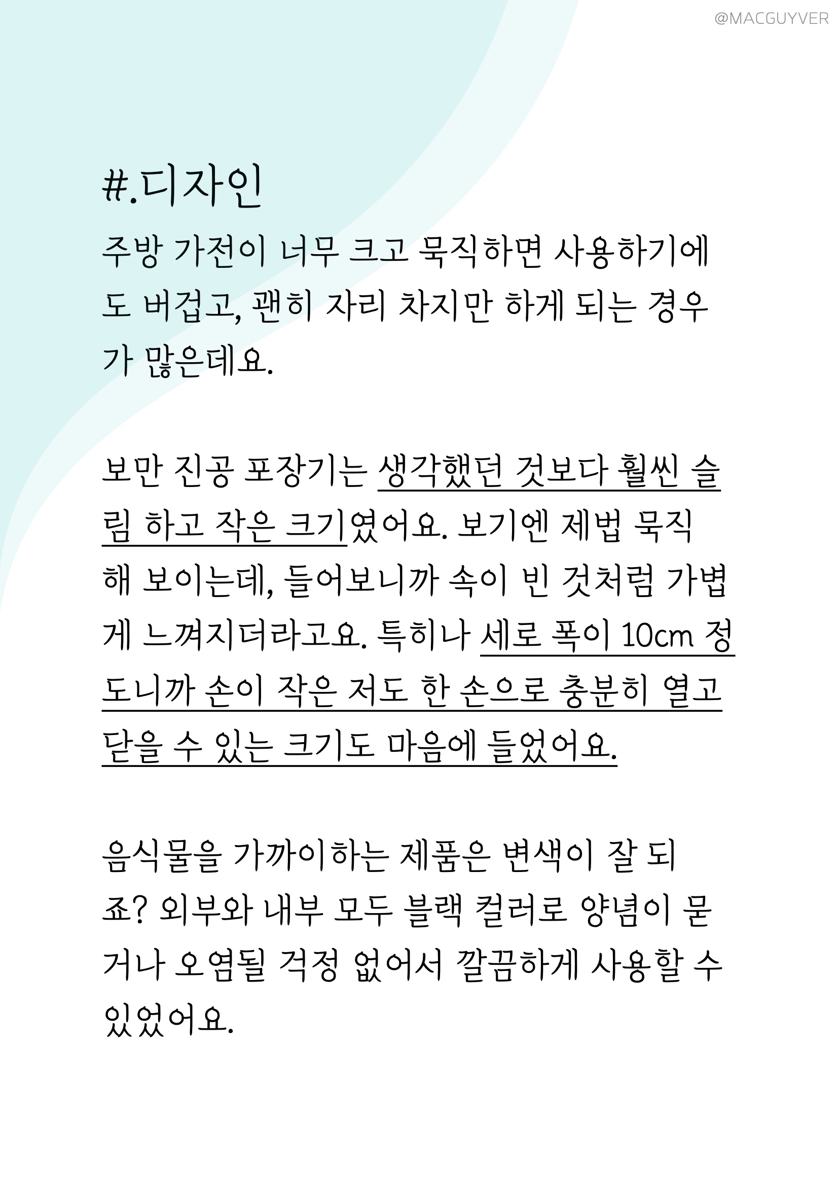 #.보만 가정용 진공포장기 디자인 주방 가전이 너무 크고 묵직하면 사용하기에도 버겁고, 괜히 자리 차지만 하게 되는 경우가 많은데요. 보만 진공 포장기는 생각했던 것보다 훨씬 슬림 하고 작은 크기였어요. 보기엔 보만 가정용 진공포장기가 제법 묵직해 보이는데, 들어보니까 속이 빈 것처럼 가볍게 느껴지더라고요. 특히나 세로 폭이 10cm 정도니까 손이 작은 저도 한 손으로 충분히 열고 닫을 수 있는 크기도 마음에 들었어요. 음식물을 가까이하는 보만 가정용 진공포장기 같은 제품은 변색이 잘 되죠? 보만 식품 압축기 외부와 내부 블랙 컬러로 양념이 묻거나 오염될 걱정 없어서 깔끔하게 사용할 수 있었어요. 보만 진공포장기는 세련되고 심플한 디자인에 포인트는 이 버튼 정도라고 할까요? 보만 포장기는 이렇게 단순한 작동 방식이어서 새로운 기기 사용이 익숙지 않은 분들도 쉽게 사용하실 수 있을 것 같아요. 저는 식품 압축기 같은 보조 기기들은 밖에 두기보다는 서랍에 넣어두고 필요할 때 꺼내 쓰는 편인데요. 본체와 어댑터는 이렇게 분리가 되니까 자리 차지도 크지 않더라고요. 식품 압축기 어댑터가 빠져 있는 동안 본체에 이물질이 들어가지 않도록 고무 패킹이 있는 점이나 바닥면의 미끄럼 방지 처리도 이 제품의 완성도를 높여주는 점들이었어요.