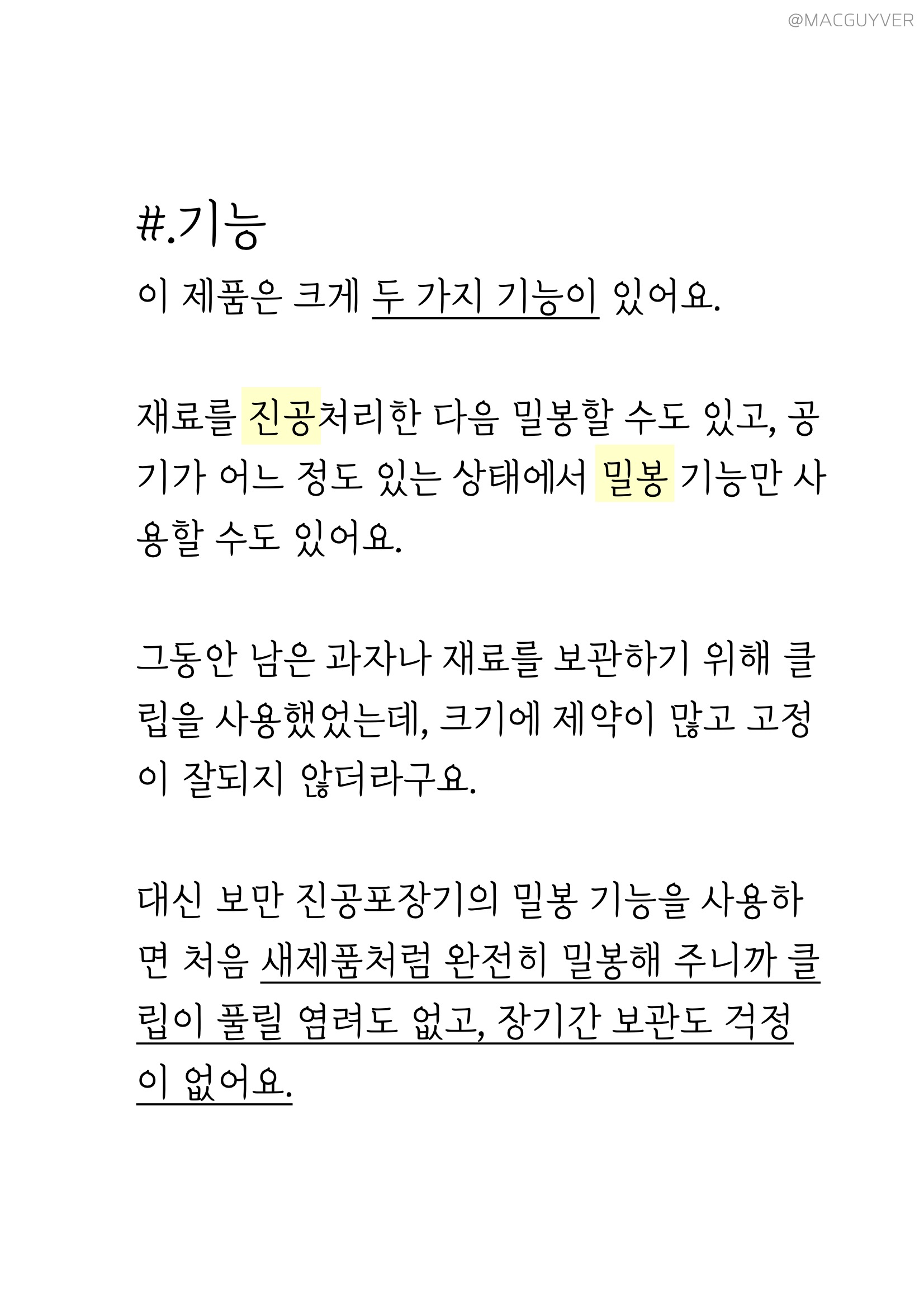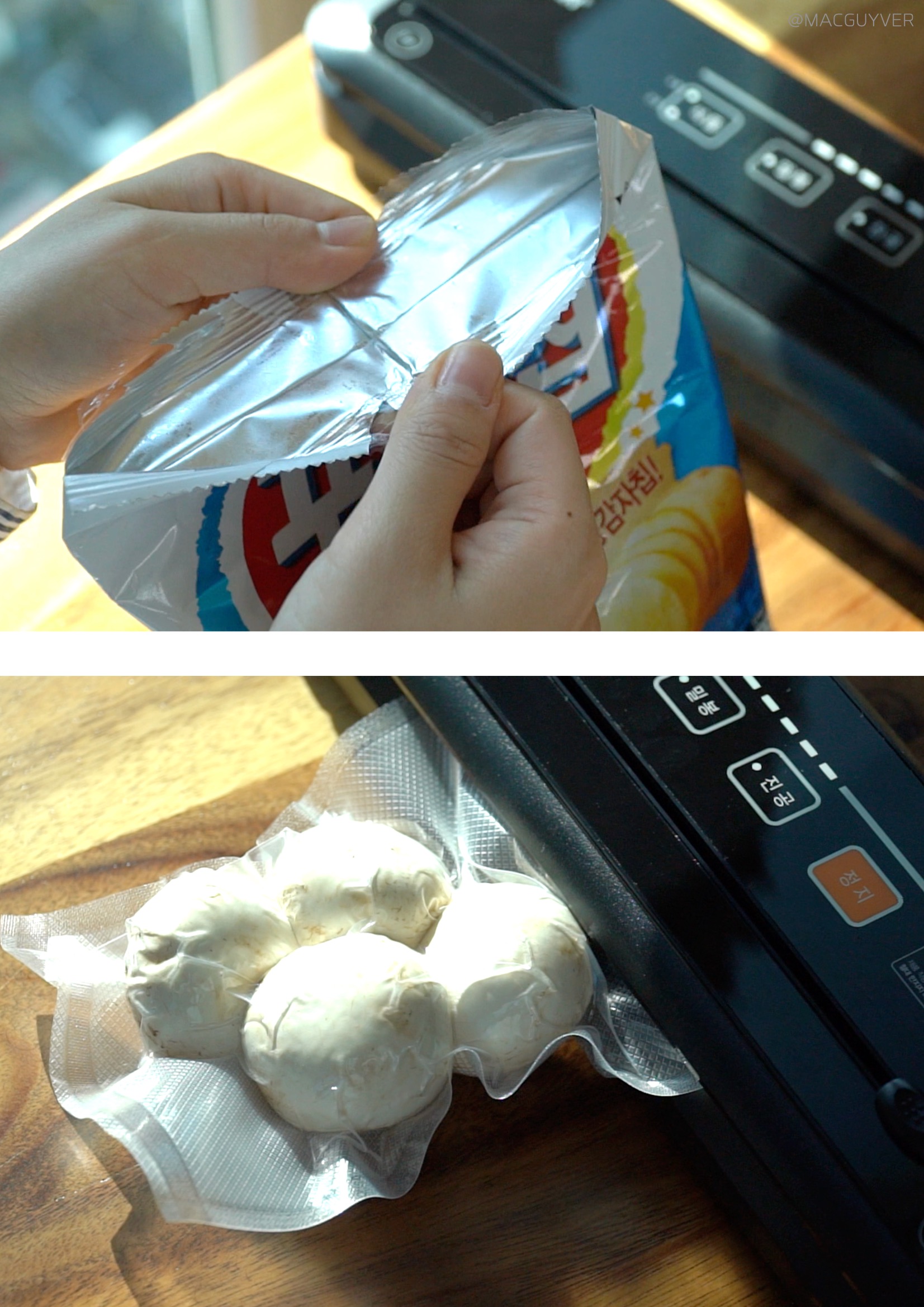 #.기능 보만 가정용 진공포장기는 크게 두 가지 기능이 있어요. 재료를 진공처리한 다음 밀봉할 수도 있고, 보만 실링기로 공기가 어느 정도 있는 상태에서 밀봉 기능만 사용할 수도 있어요. 개인적으로 남은 과자나 재료를 보관하기 위해 클립을 사용했었는데, 크기에 제약이 많고, 고정이 잘되지 않더라구요. 대신 식품 포장기계 보만 진공포장기의 밀봉 기능을 사용하면 처음처럼 완전히 밀봉해 주니까 클립이 풀릴 염려도 없고, 보만 실링기로 장기간 보관도 걱정이 없었어요.