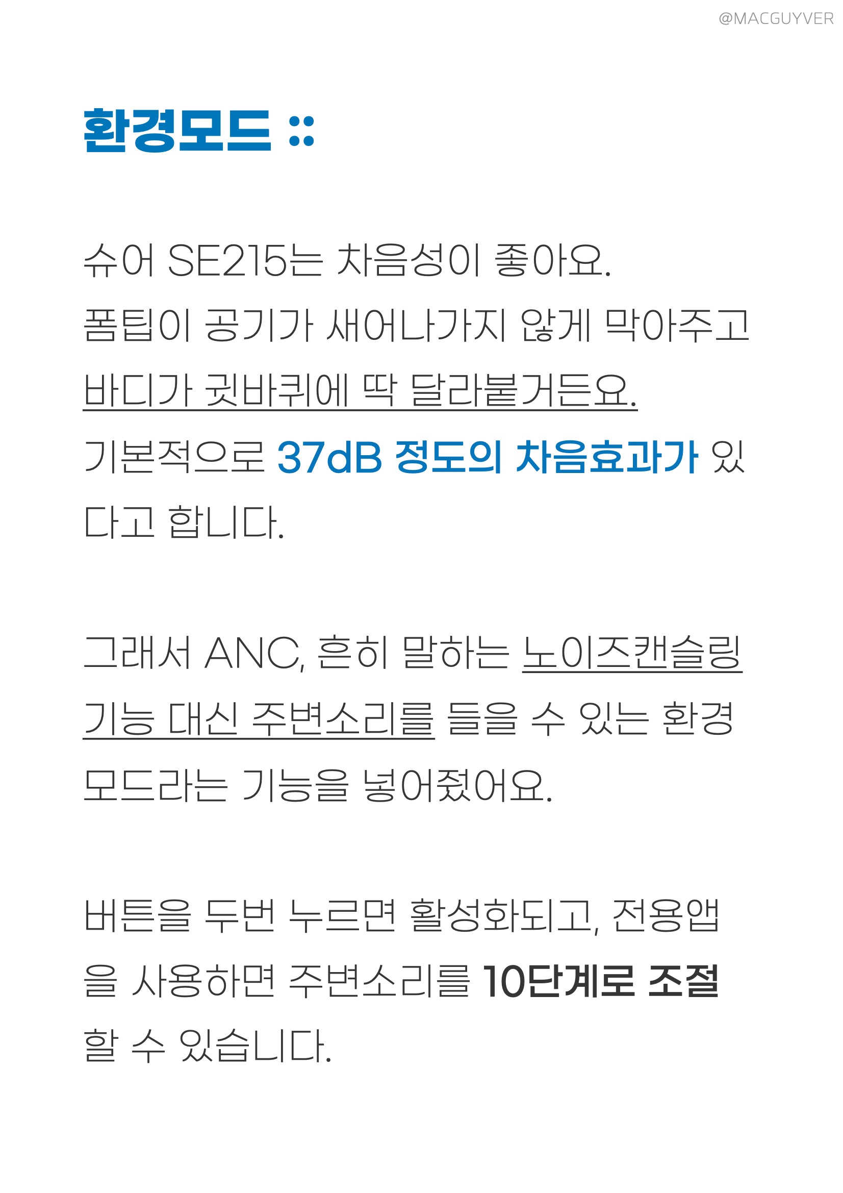 환경모드 :: 슈어 SE215 고음질 블루투스 이어폰은 차음성이 좋아요. 폼팁이 공기가 새어나가지 않게 막아주고 바디가 귓바퀴에 딱 달라붙거든요. 기본적으로 37dB 정도의 차음효과가 있다고 합니다. 그래서 ANC, 흔히 말하는 노이즈캔슬링 이어폰 기능 대신 주변소리를 들을 수 있는 환경모드라는 기능을 넣어줬어요. 버튼을 두번 누르면 활성화되고, 전용앱을 사용하면 주변소리를 10단계로 조절할 수 있습니다. 슈어하면 마이크잖아요. 그래서 그런가 주변소리듣기를 켜고 한쪽 이어폰을 빼도 양쪽 귀에 크게 위화감이 없어요. 소리가 나는 위치도 바로 구분할 수 있고, 제 목소리도 훨씬 선명하게 들려서 대화하기도 편해요. 하지만 치찰음처럼 고음역대의 소리는 귀에 더 박힙니다. 약간 거슬릴 수 있어요. 그리고 소리 유입이 많을수록 화이트노이즈도 생기죠. 대신 이 무선 이어폰의 마이크 위치 때문에 바람소리가 안들렸어요. 거슬리는 느낌이 전혀 없네요. 마이크를 거치는 소리니까 인위적인 느낌이 아예 없진 않지만, 제가 사용해본 완전무선 이어폰들 중에선 외부 소리듣기 완성도가 제일 높았어요. 그러다보니 이 기능을 자주 사용하게 되고, 이어폰도 계속 착용하게 되더라고요. 착용감도 편하고 소리도 자연스러워서 어쩔 땐 이어폰을 낀 채로 운전을 하다가 뒤늦게 깨달은 적도 있어요.